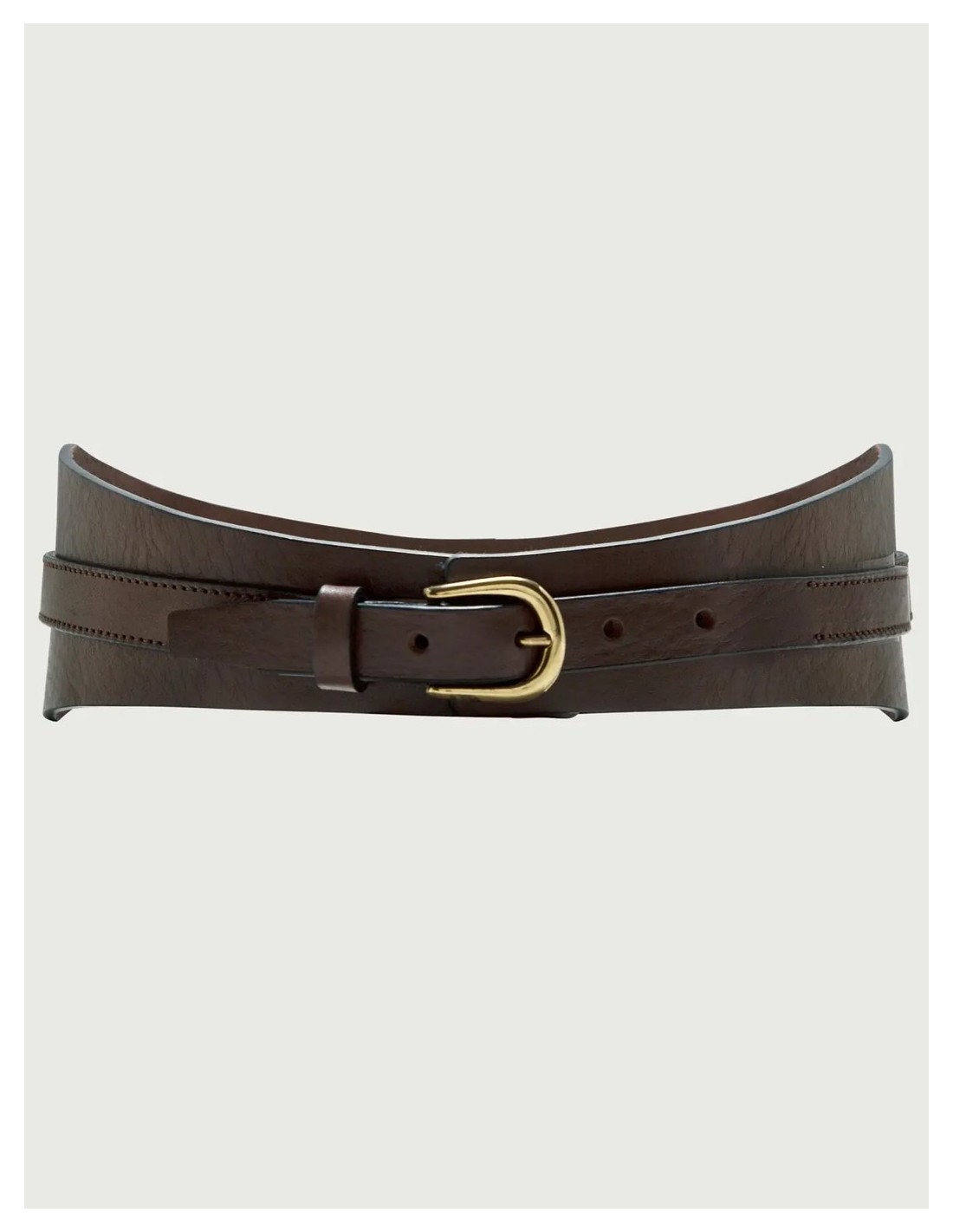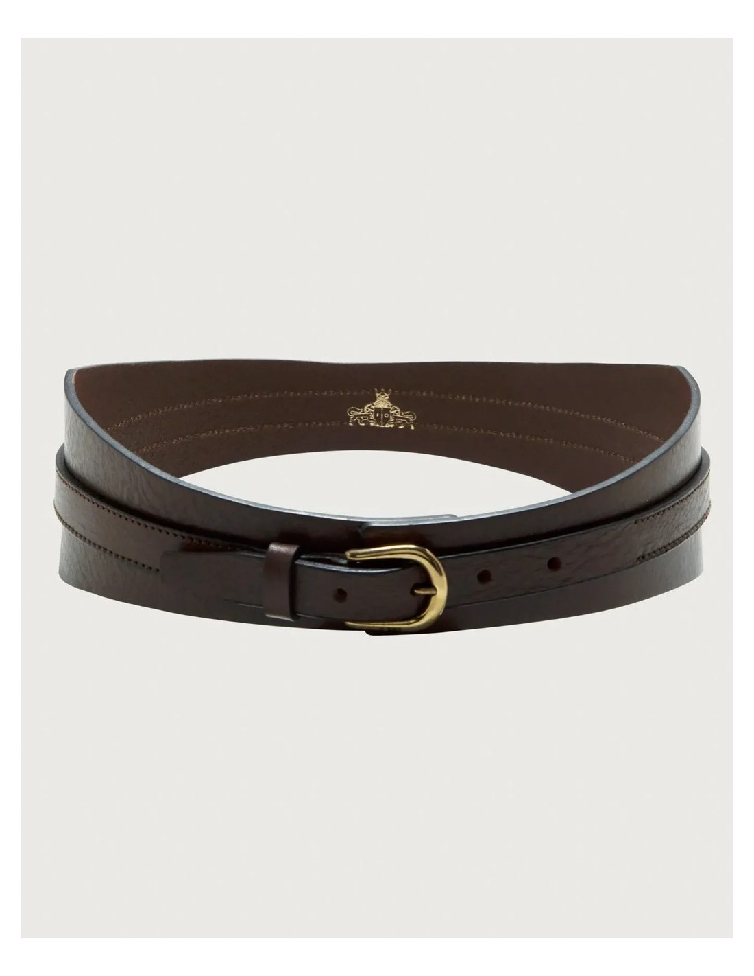 Cinturón marrón chocolate de piel con detalle dorado de lazos cruzados.