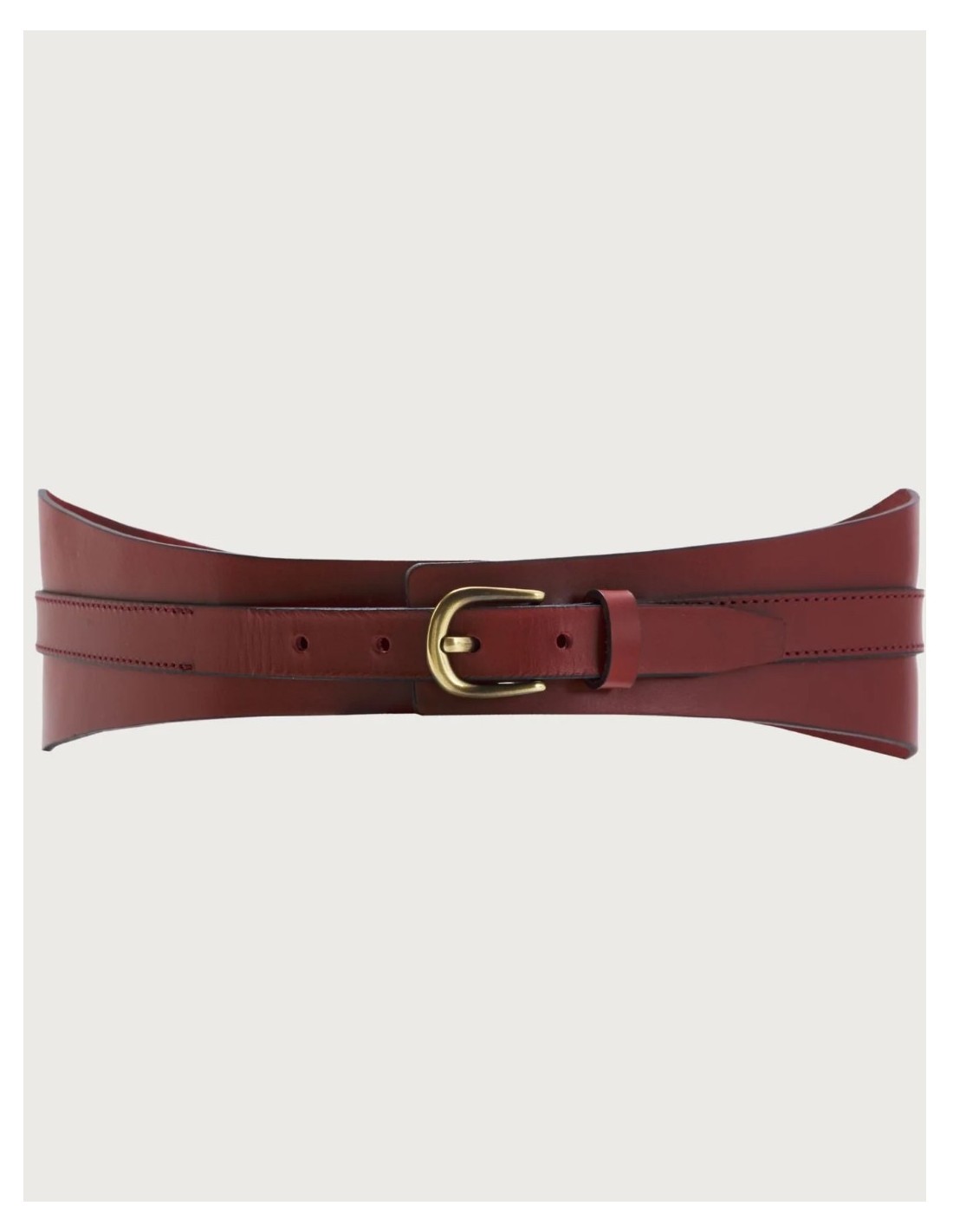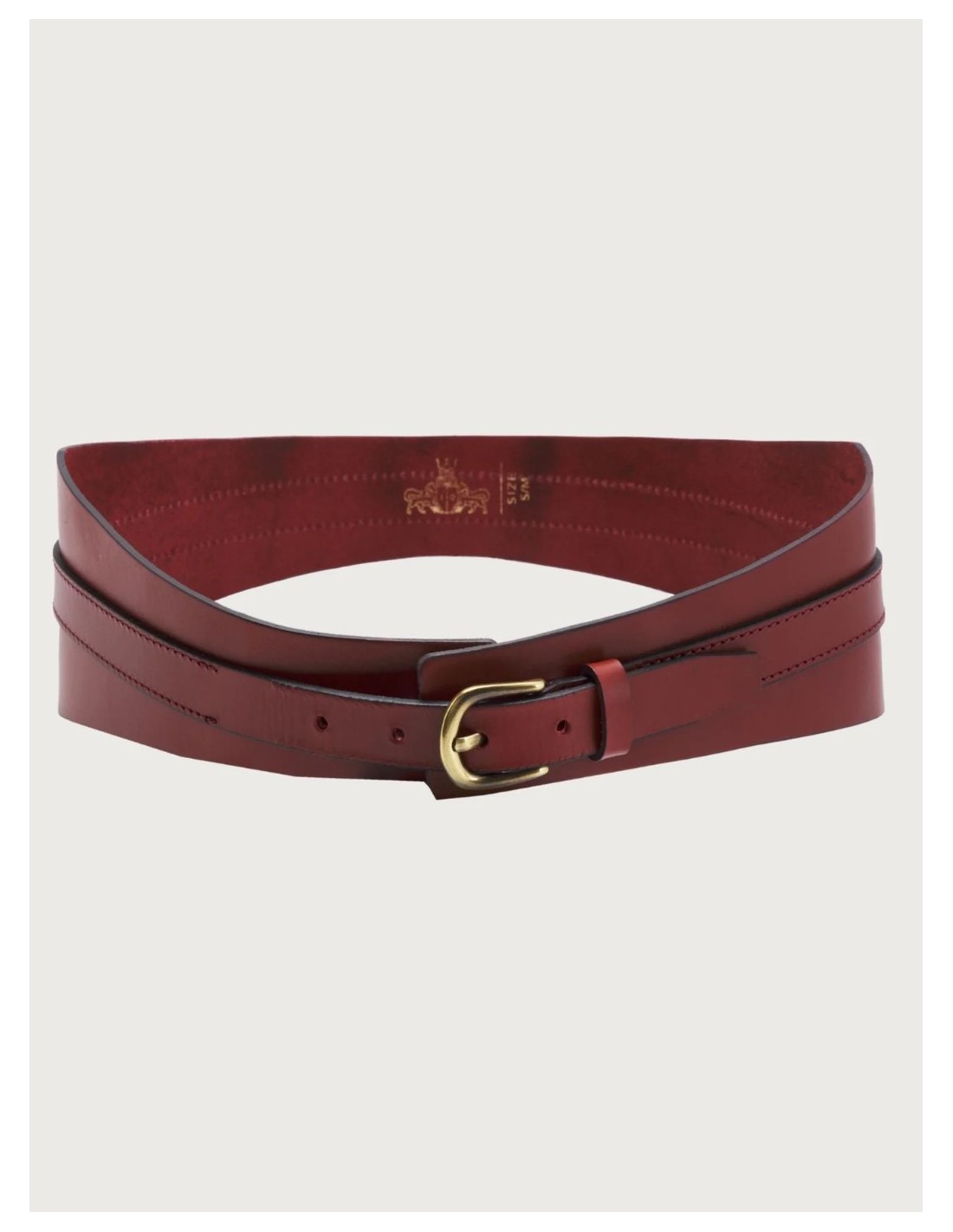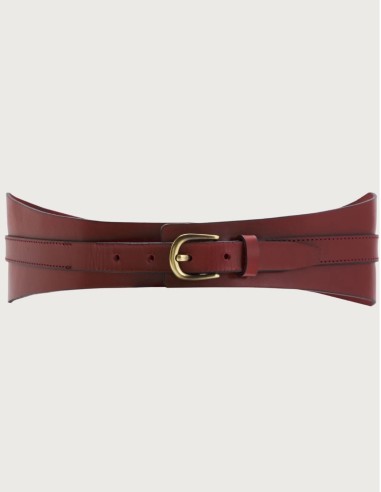 Cinturón en color granate de piel con detalle dorado de lazos cruzados. Hebilla en color dorado.