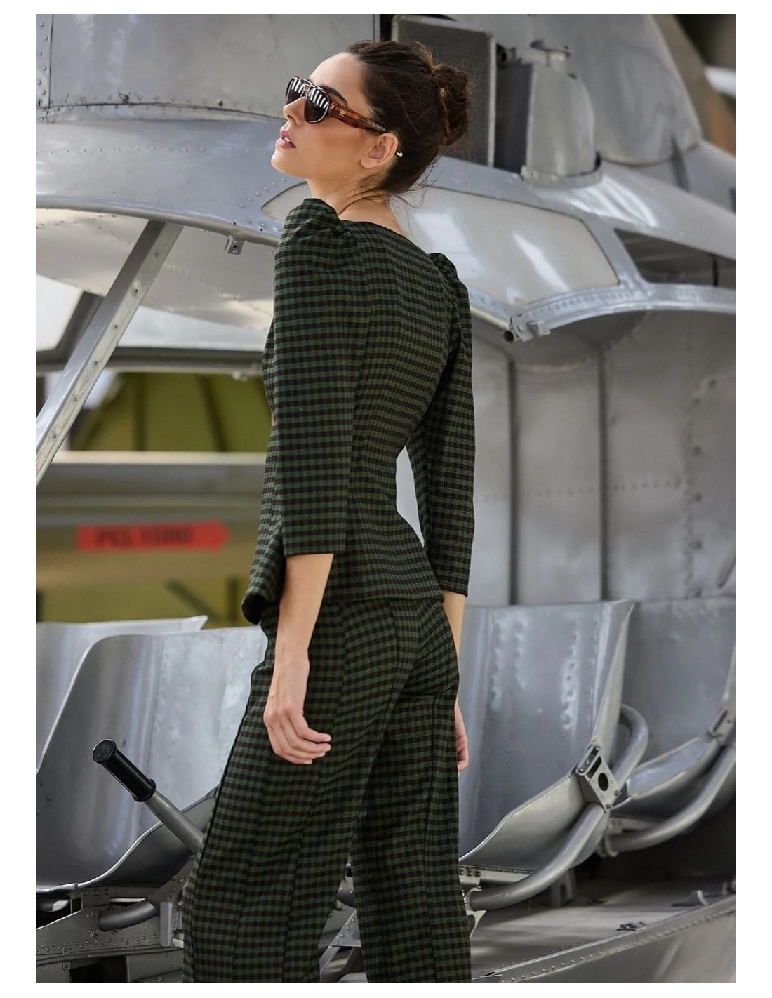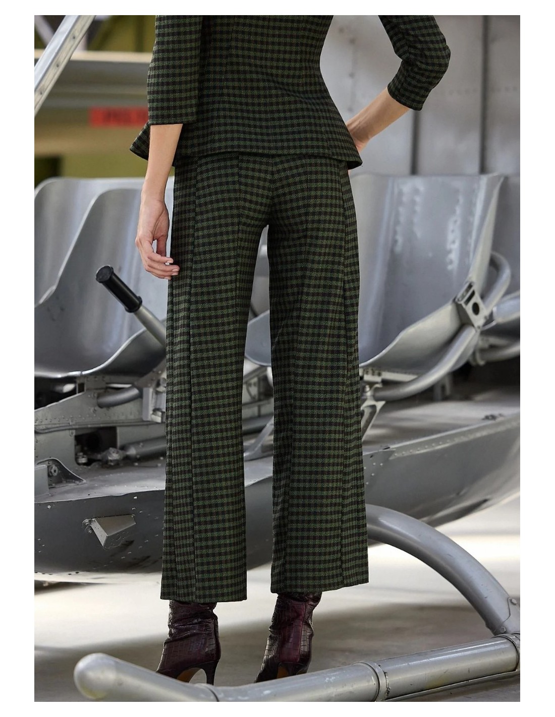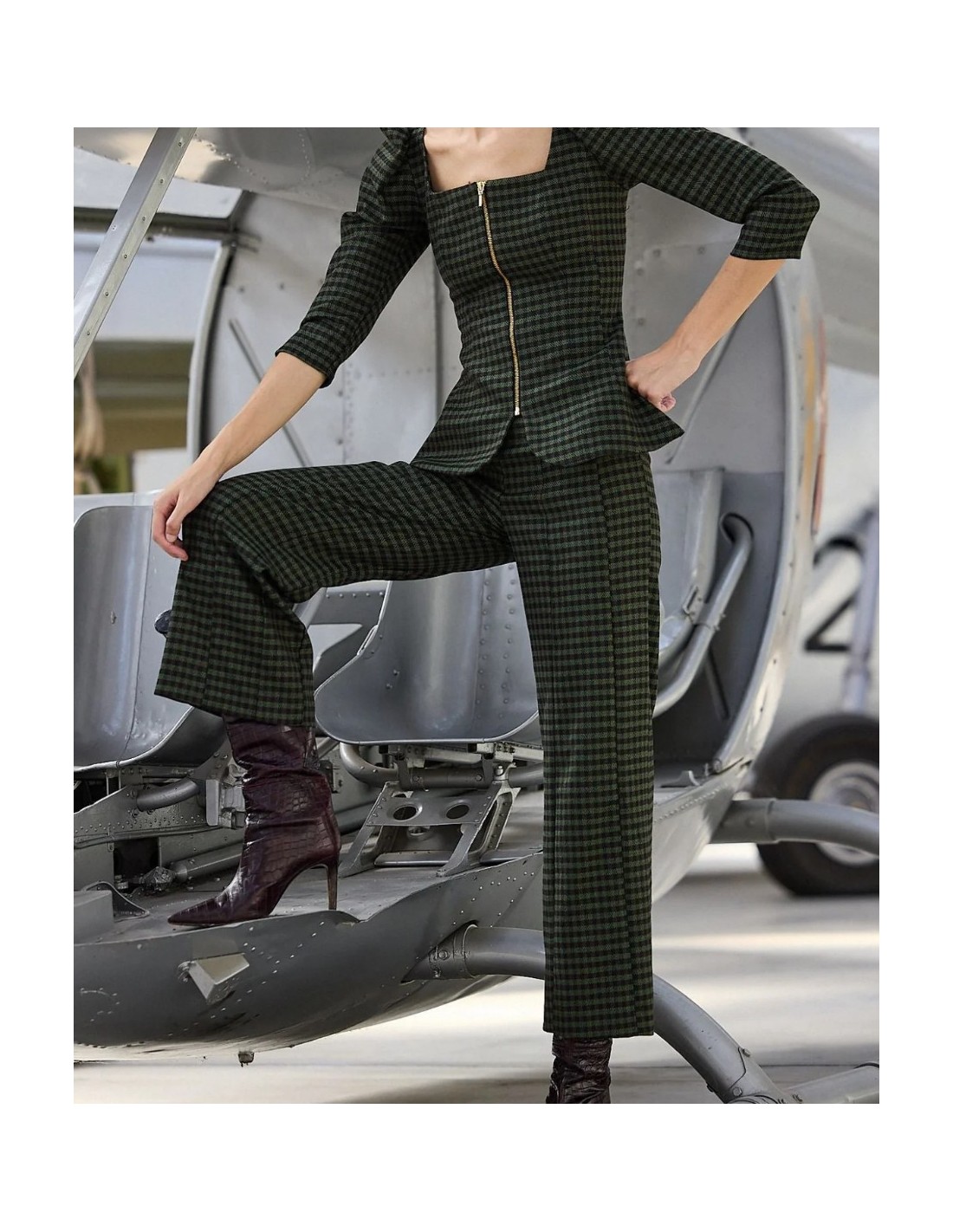 Pantalón recto de tiro alto de estampado vichy de color negro y verde.