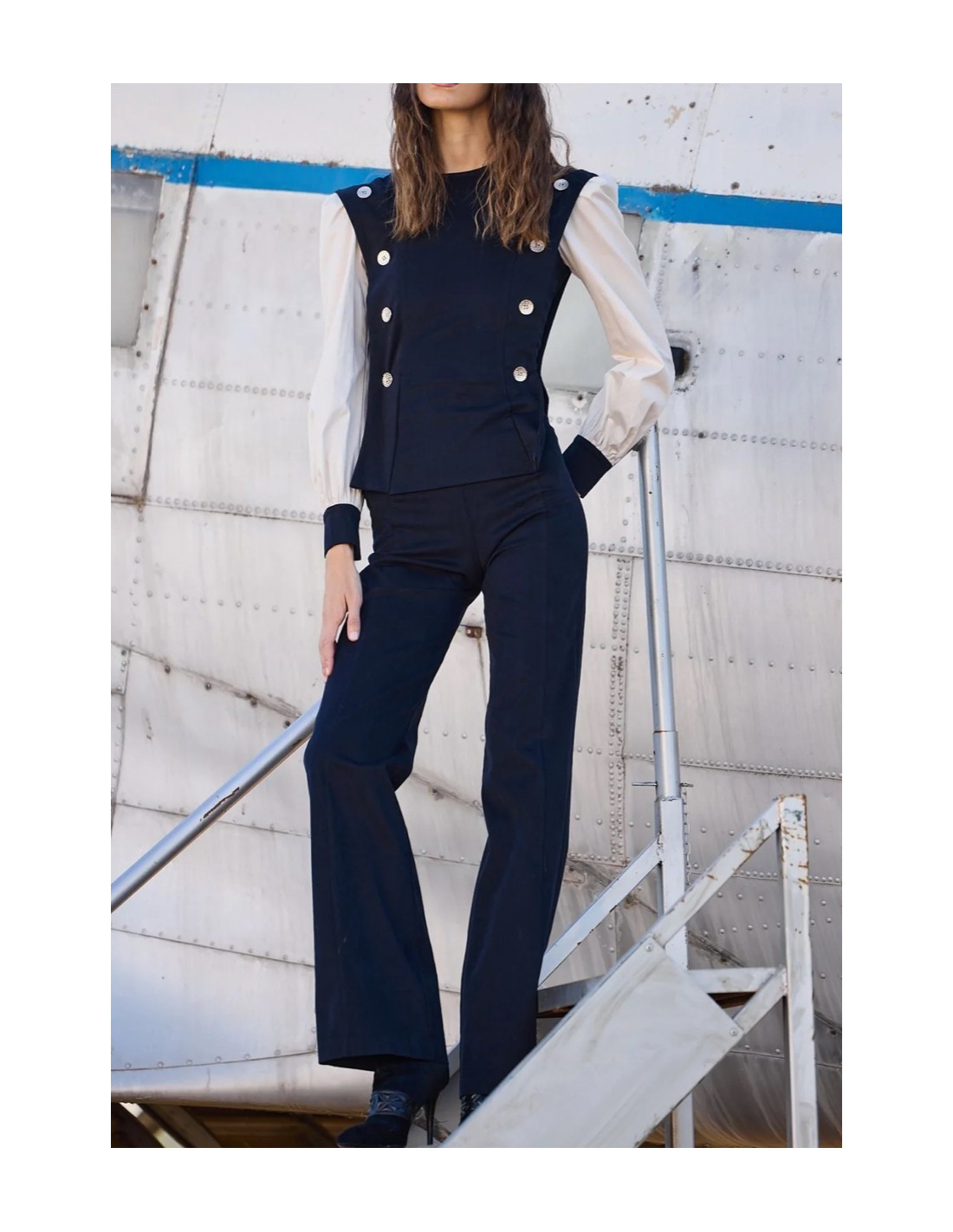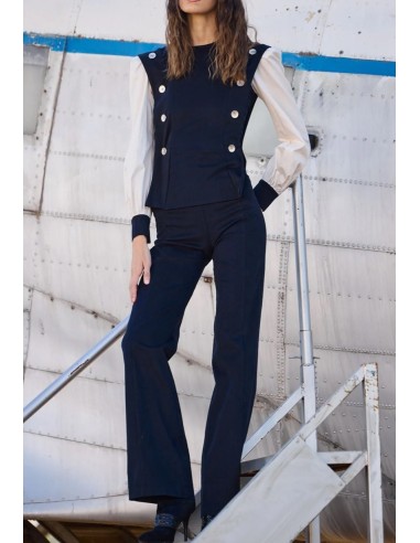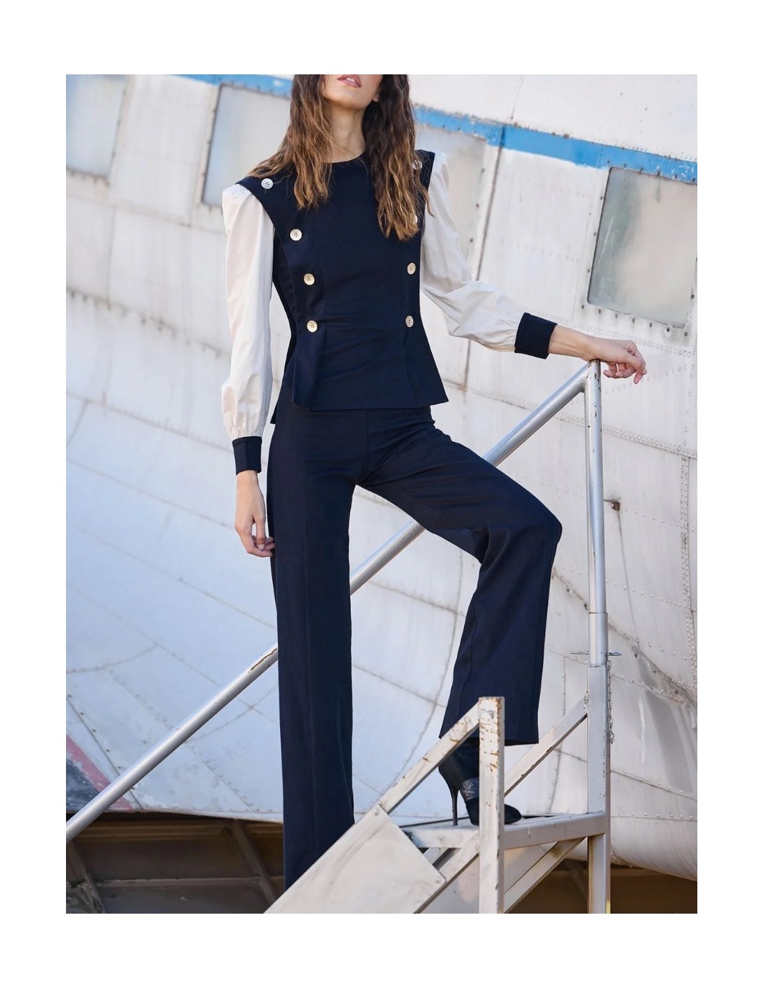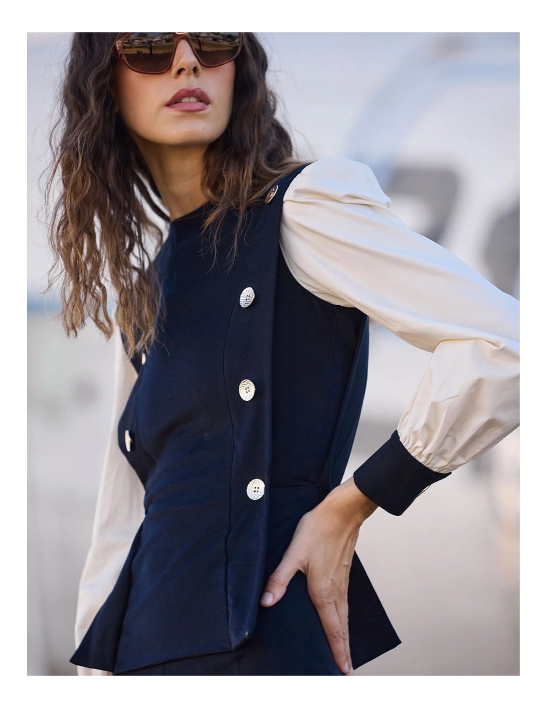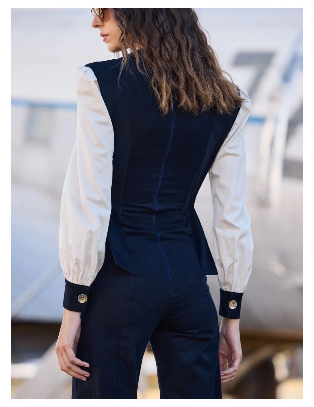 Mono largo entallado con mangas en contraste y puños en color azul marino.