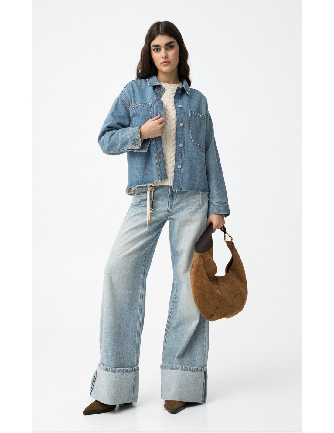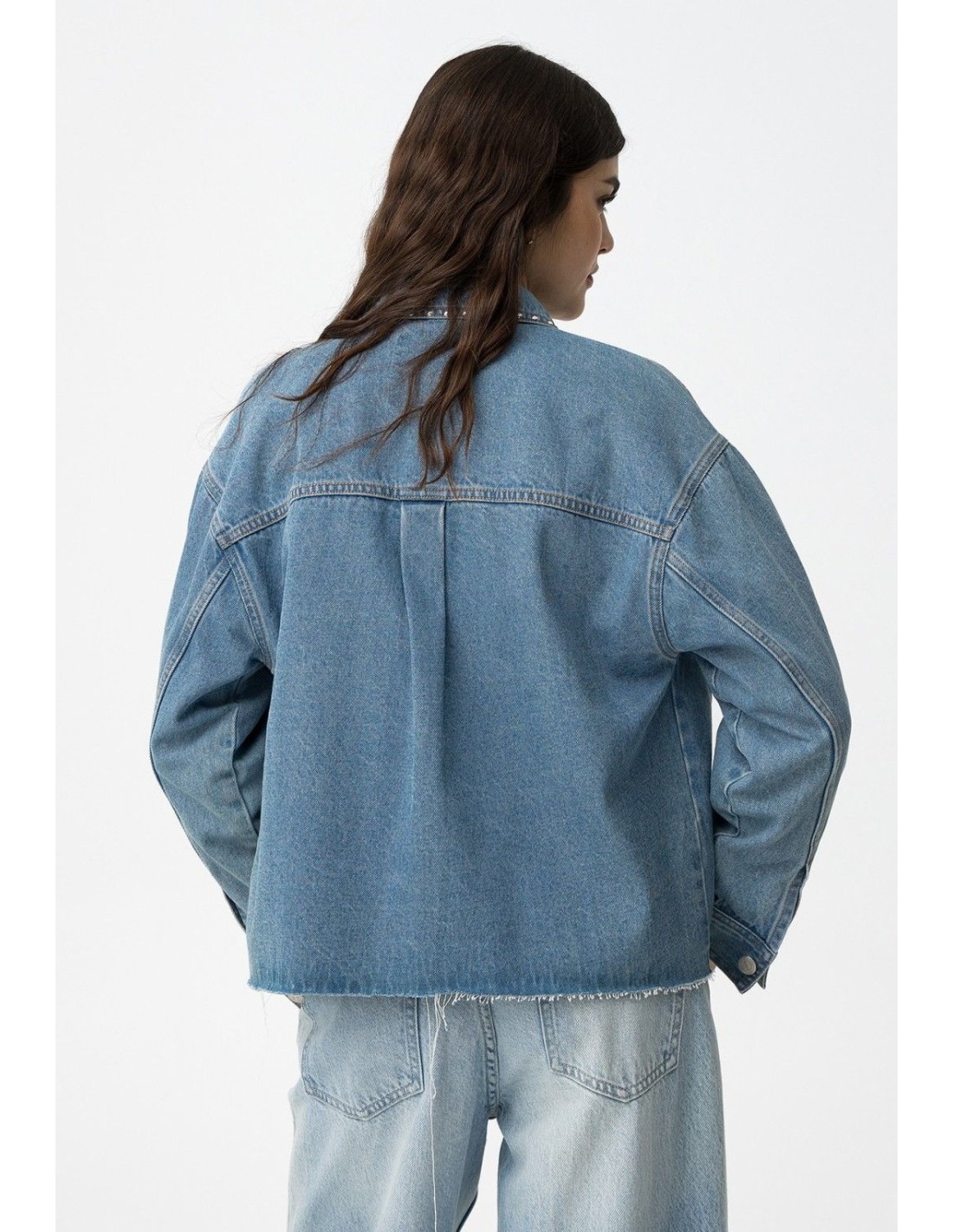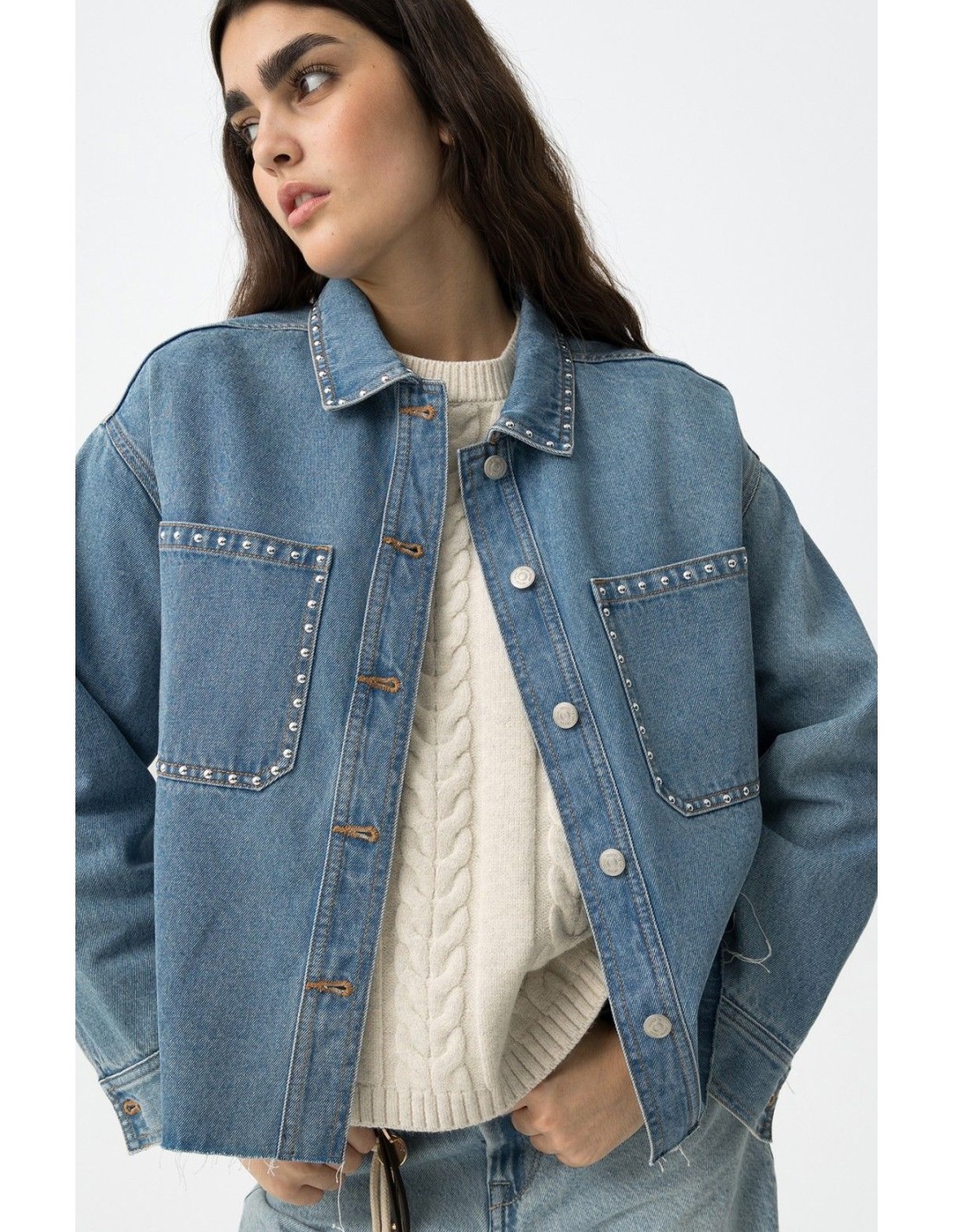 Camisa denim relaxed fit con dos bolsillos de parche frontales y aplicaciones metálicas.