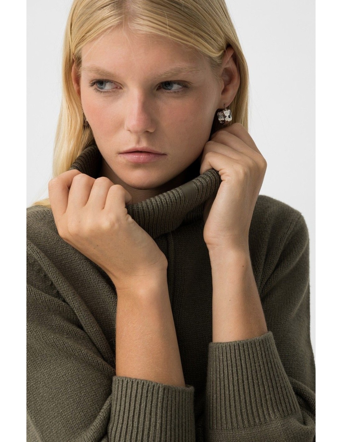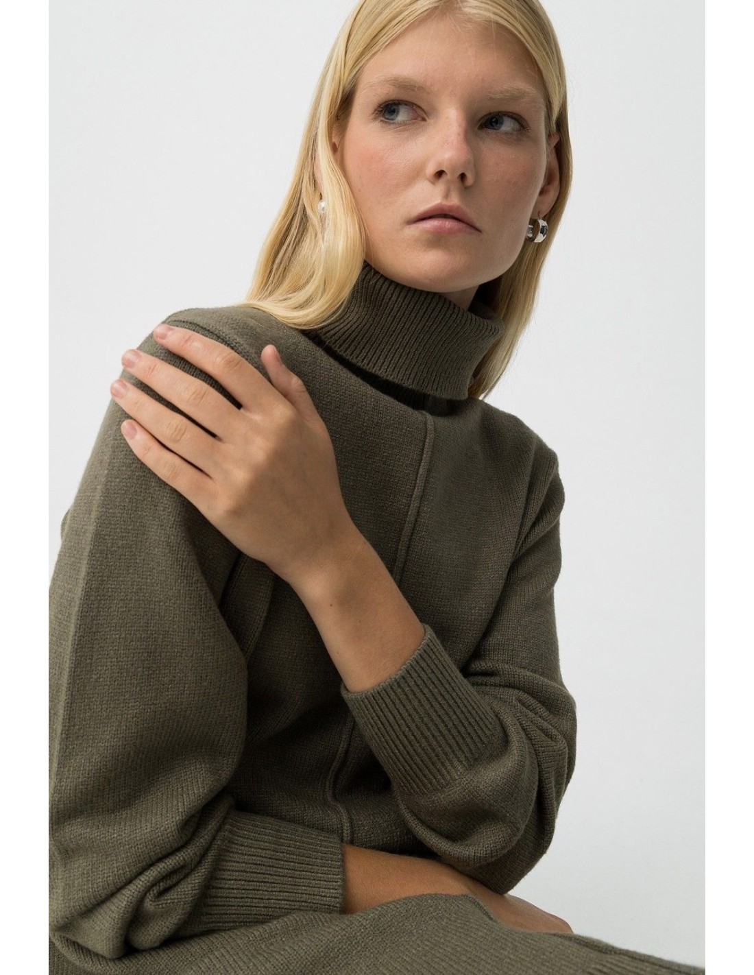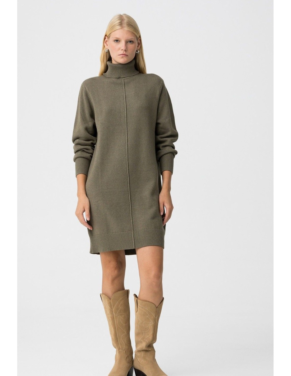 Vestido regular fit de punto, con costura frontal, cuello alto, manga larga y acabados en punto canalé.