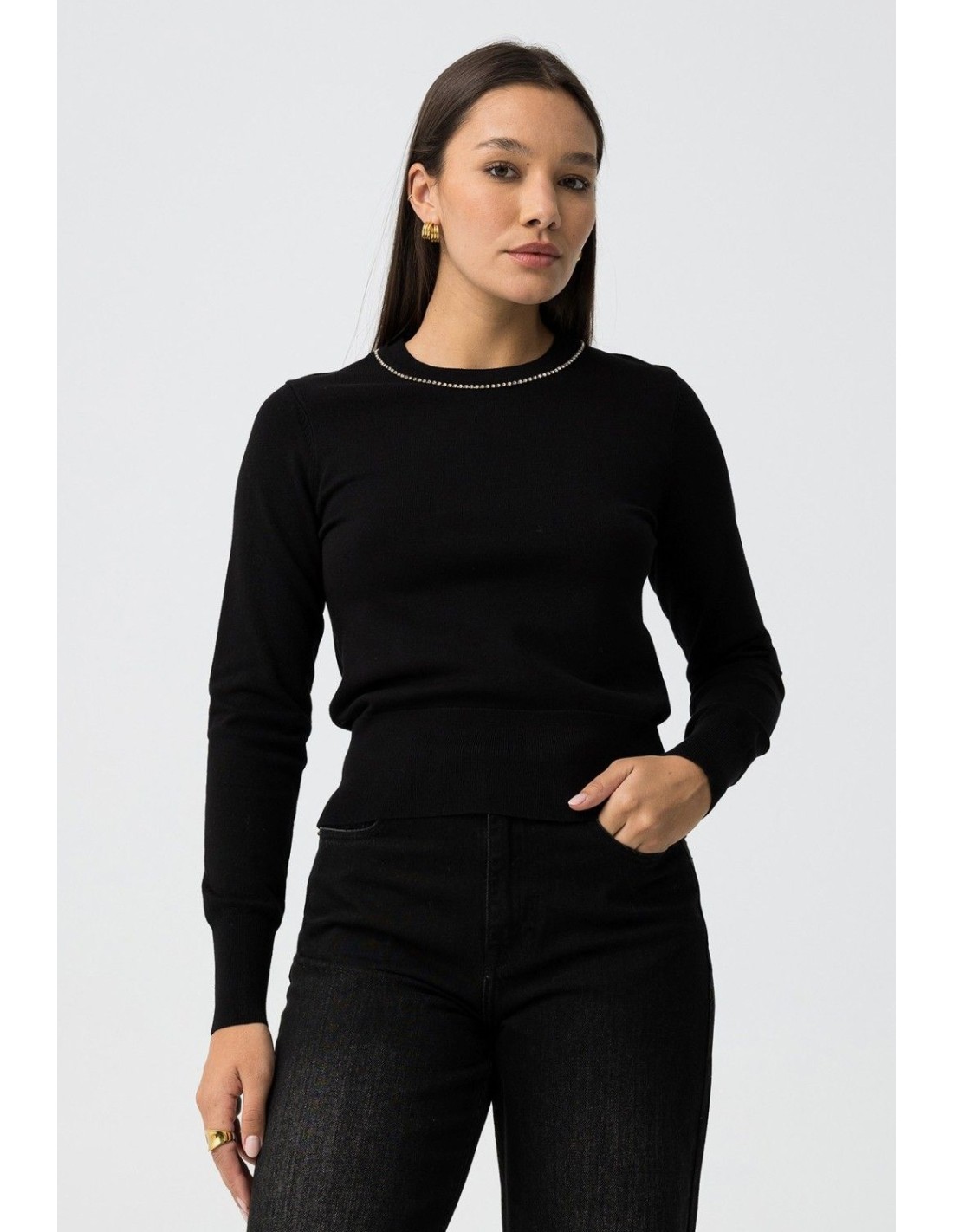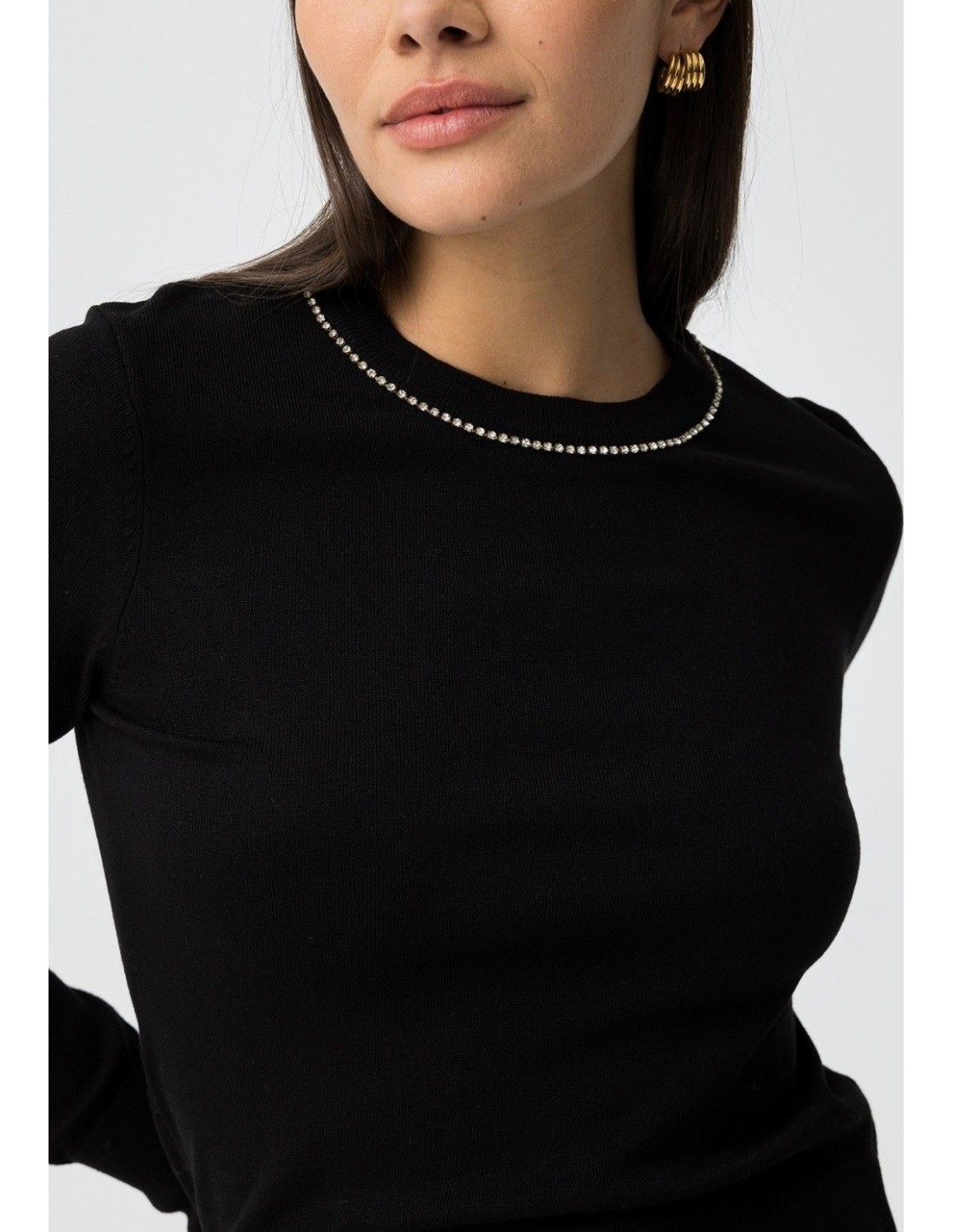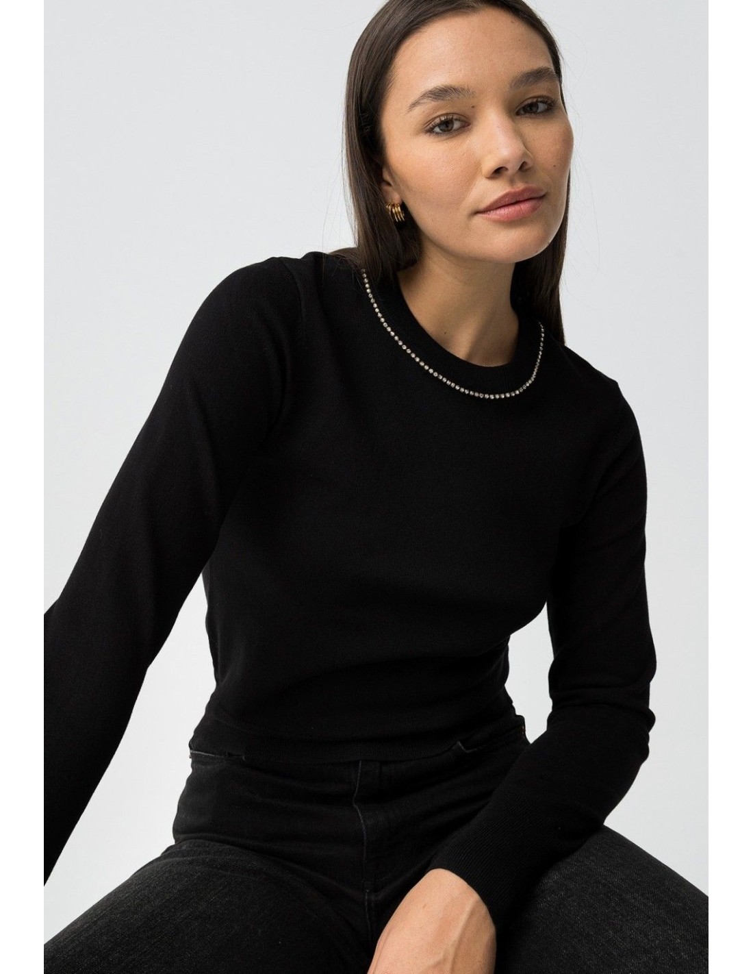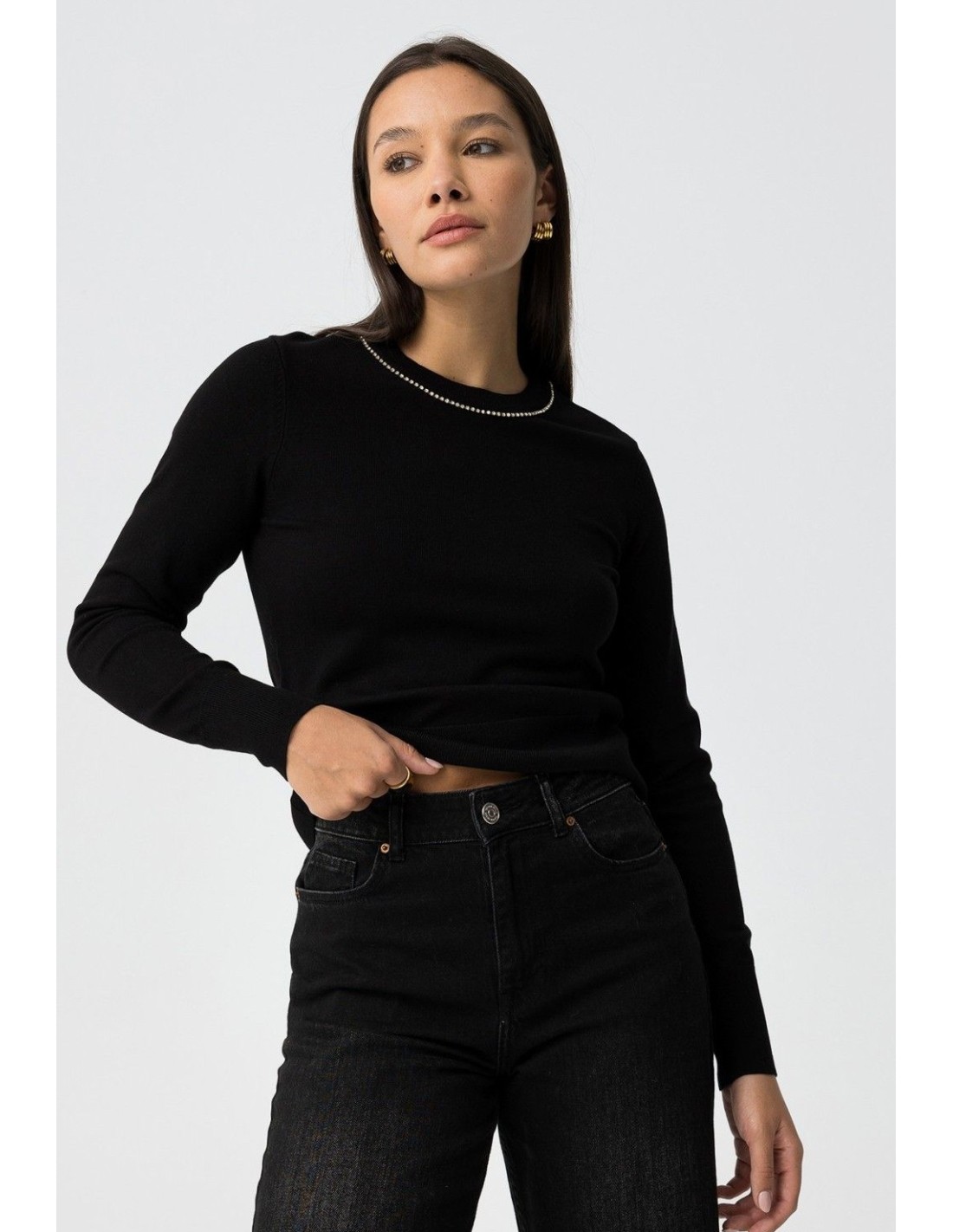 Jersey slim fit con aplicación de joya, cuello redondo, manga larga y bajo cropped.
