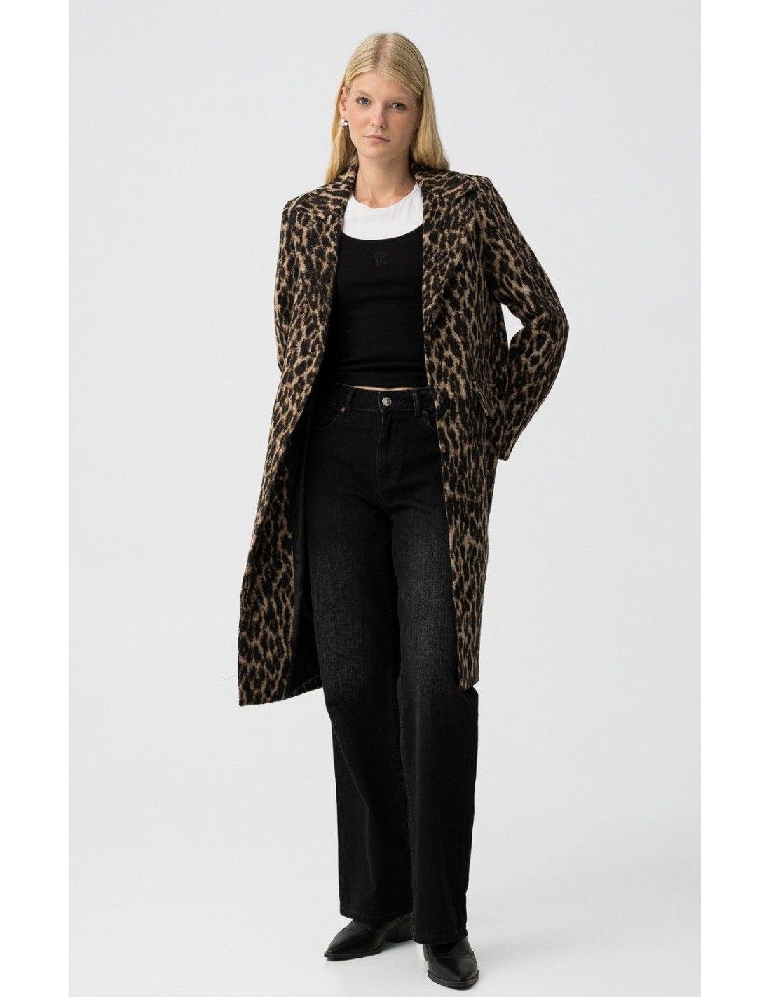 Abrigo largo con estampado de leopardo all over, dos bolsillos con solapa, cierre con botones, solapa y manga larga.