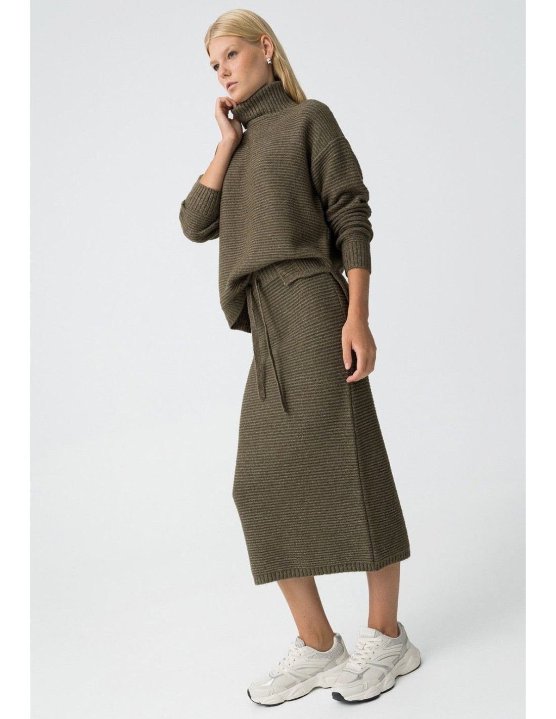 Falda midi regular fit de punto canalé, con abertura en el bajo y cintura elástica con cordón ajustable.
