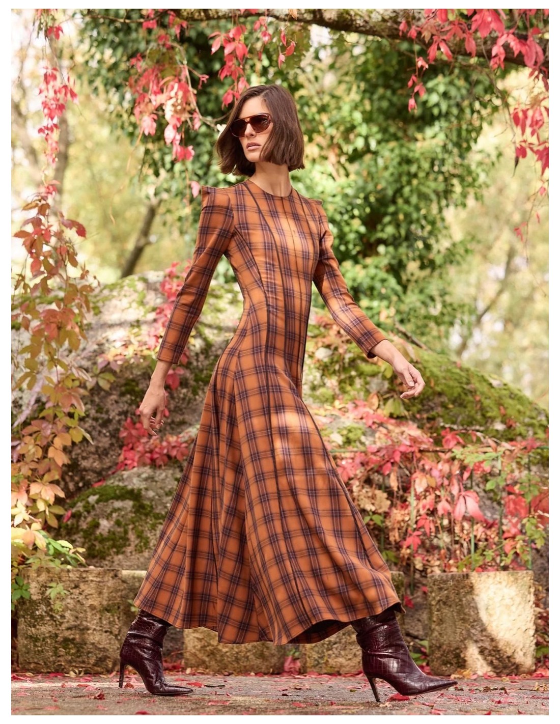 Vestido midi con cuello a la caja de estampado de cuadros en color caldera.