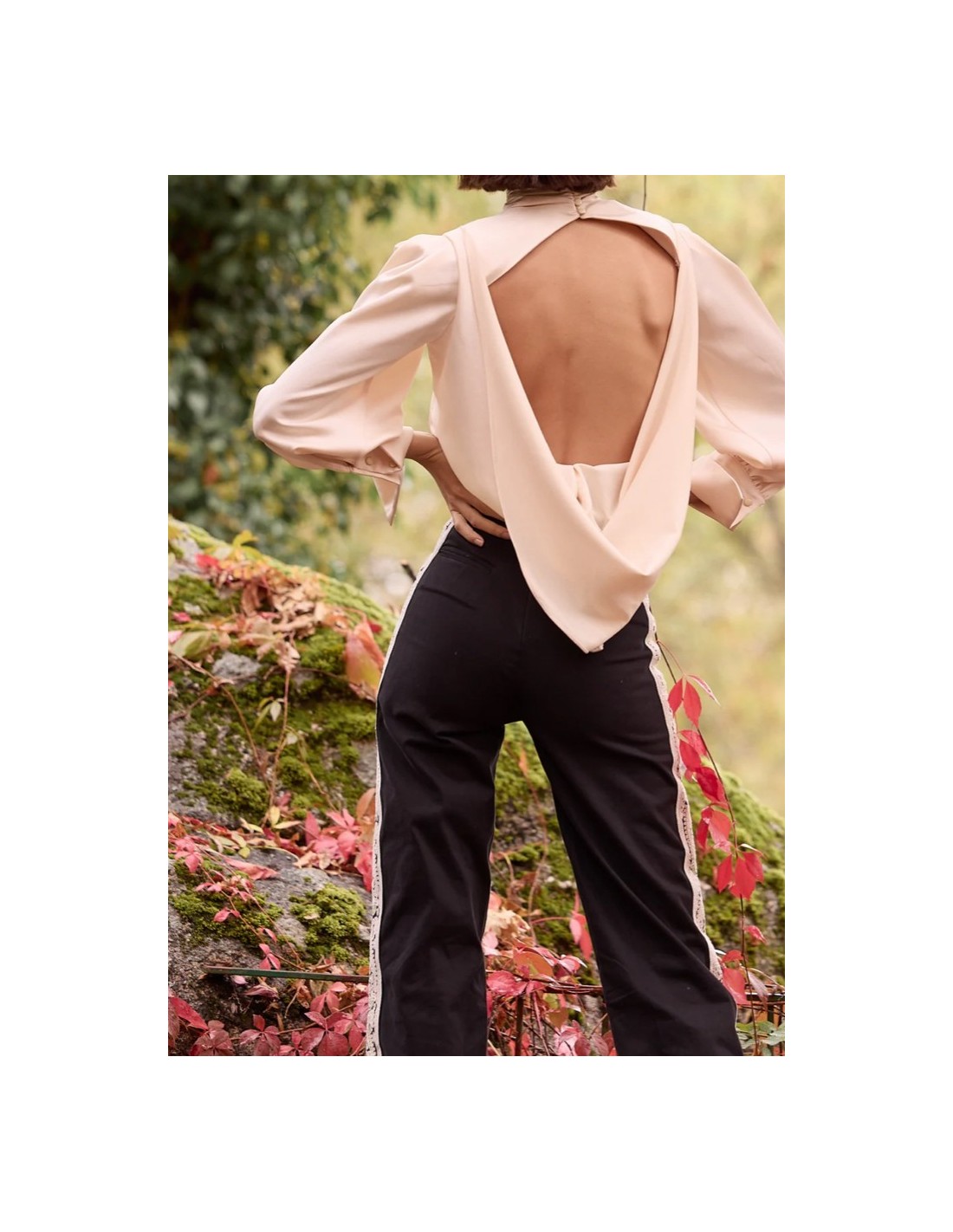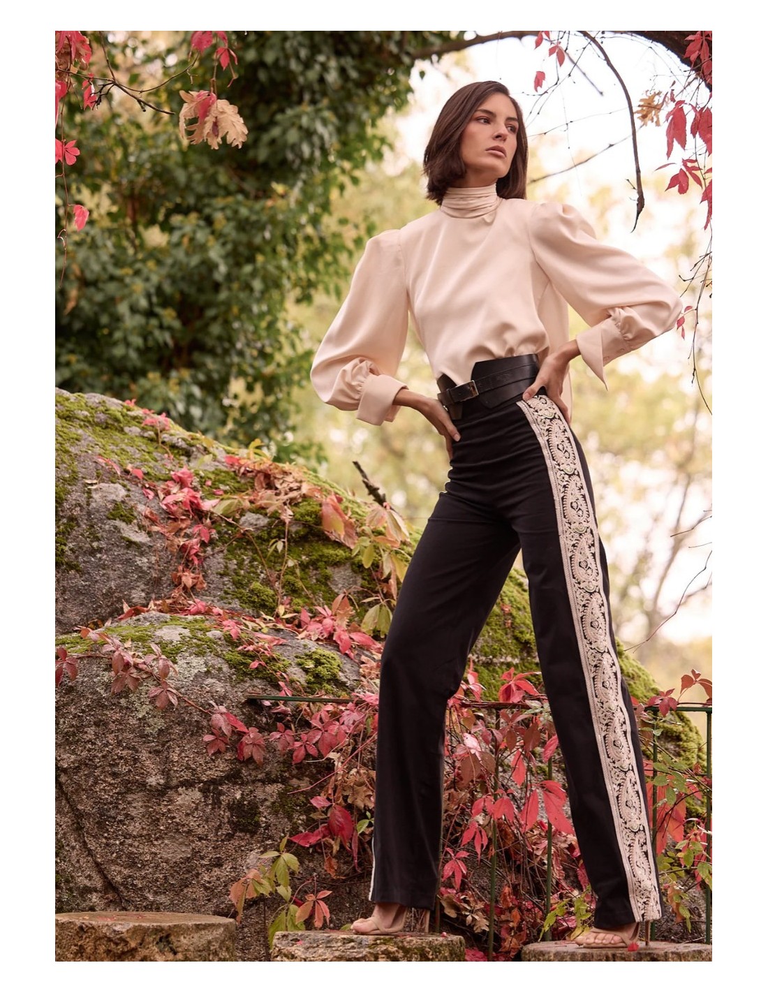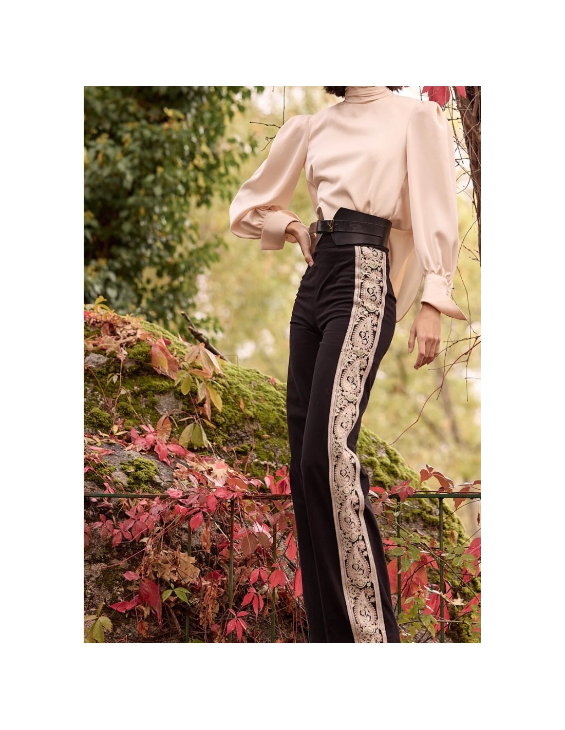 Pantalón de tiro alto y pernera ancha en color negro con bordado lateral.