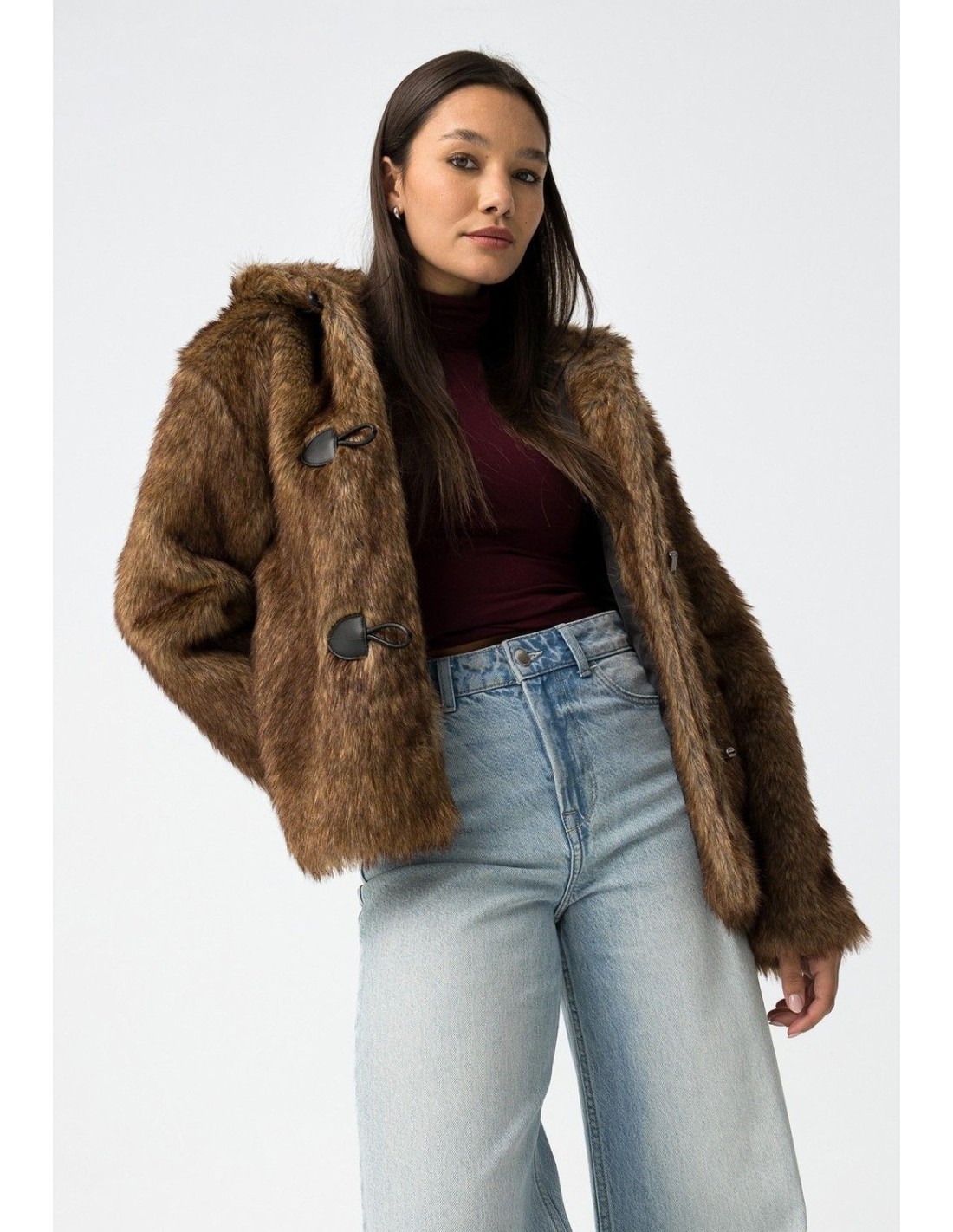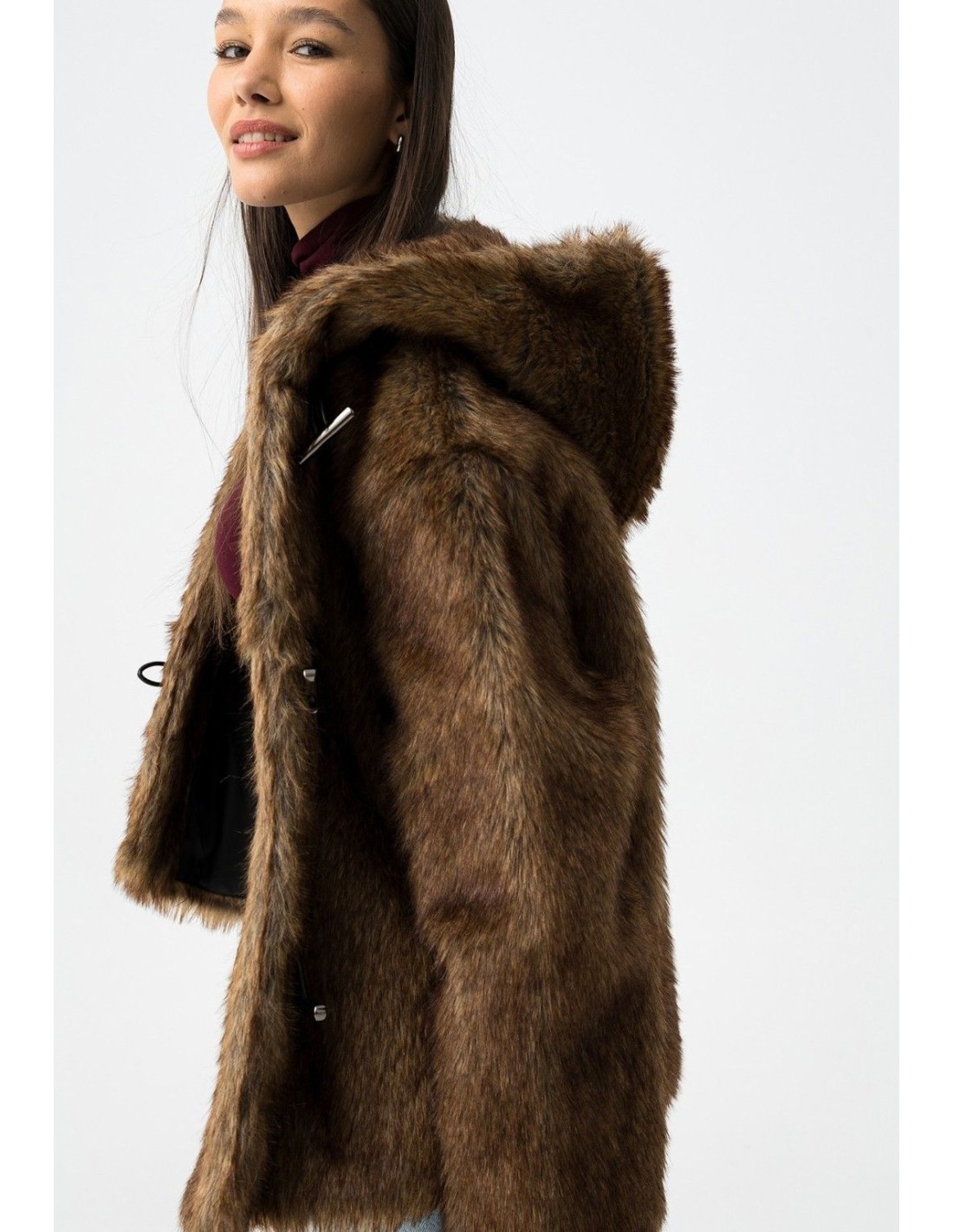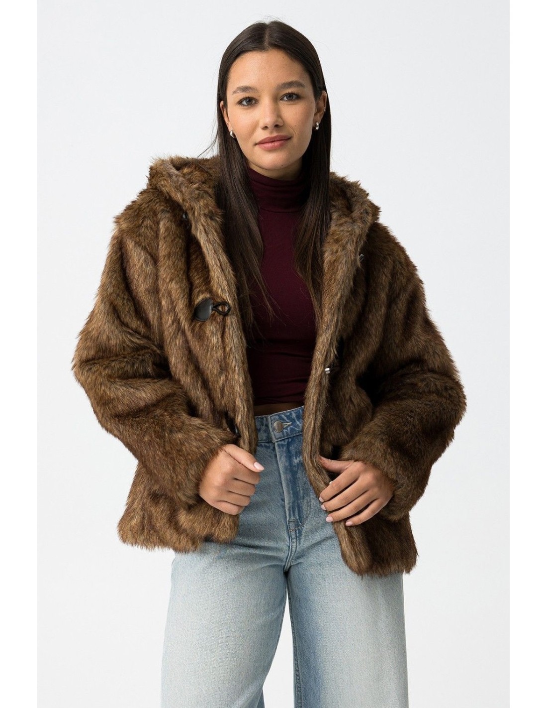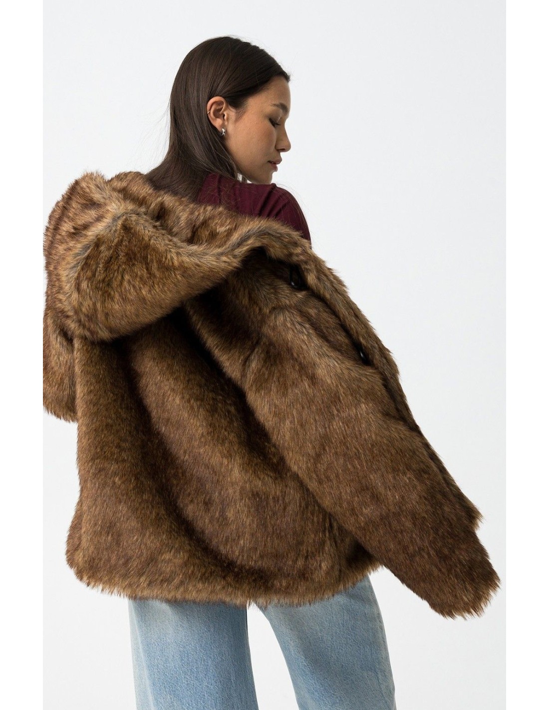 Abrigo relaxed fit de pelo sintético con dos bolsillos, capucha, cierre de alternancia y manga larga.