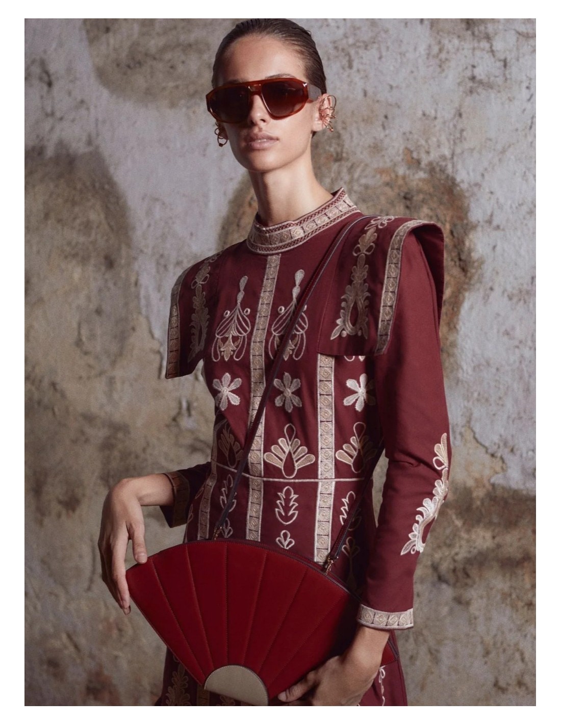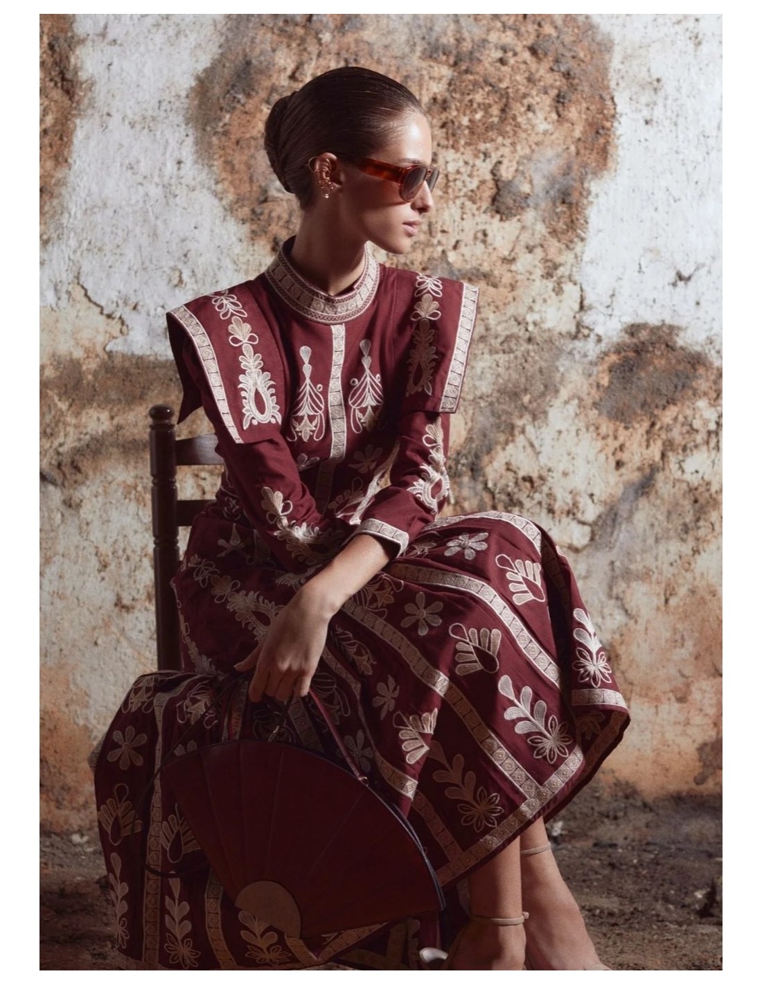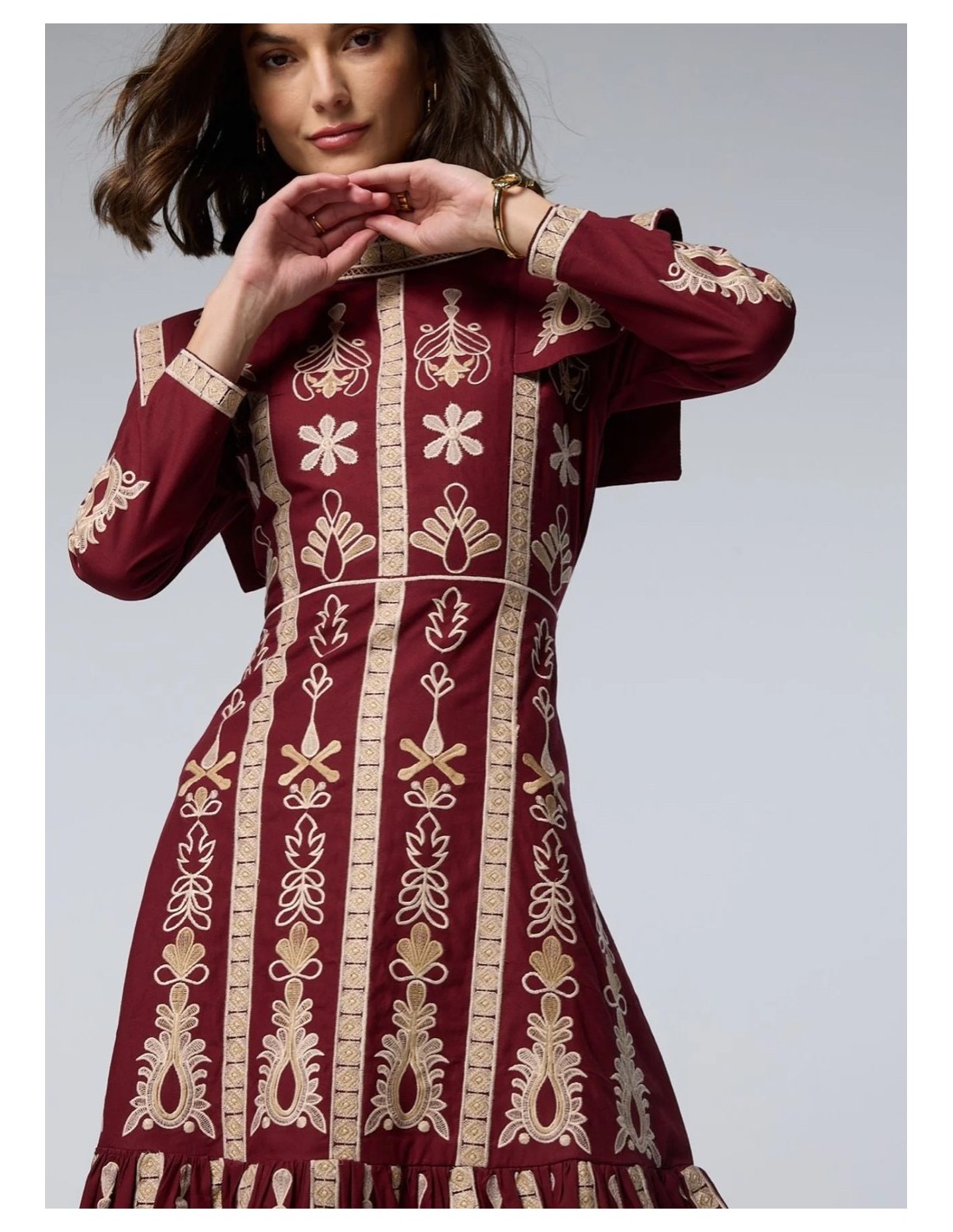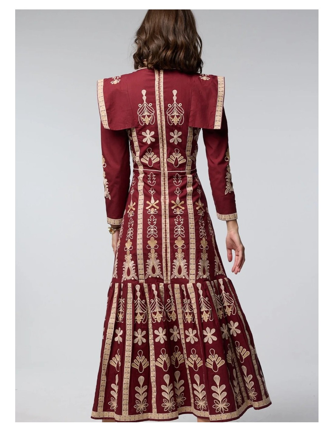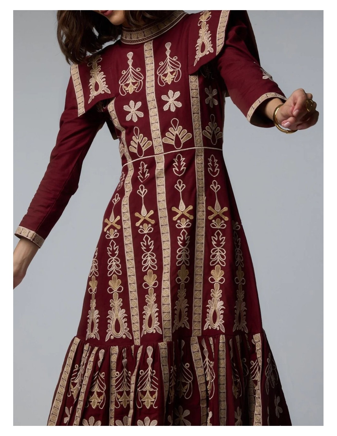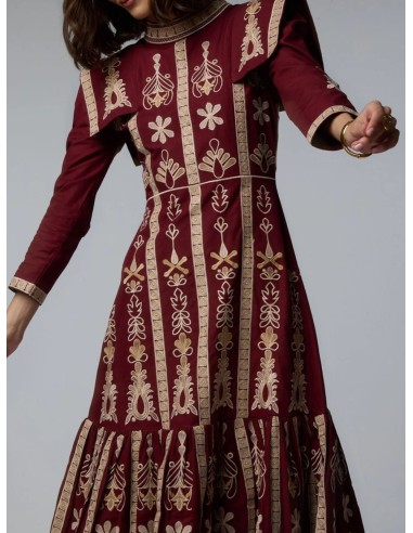 Vestido largo tobillero en color burdeos con bordado tonos beige .