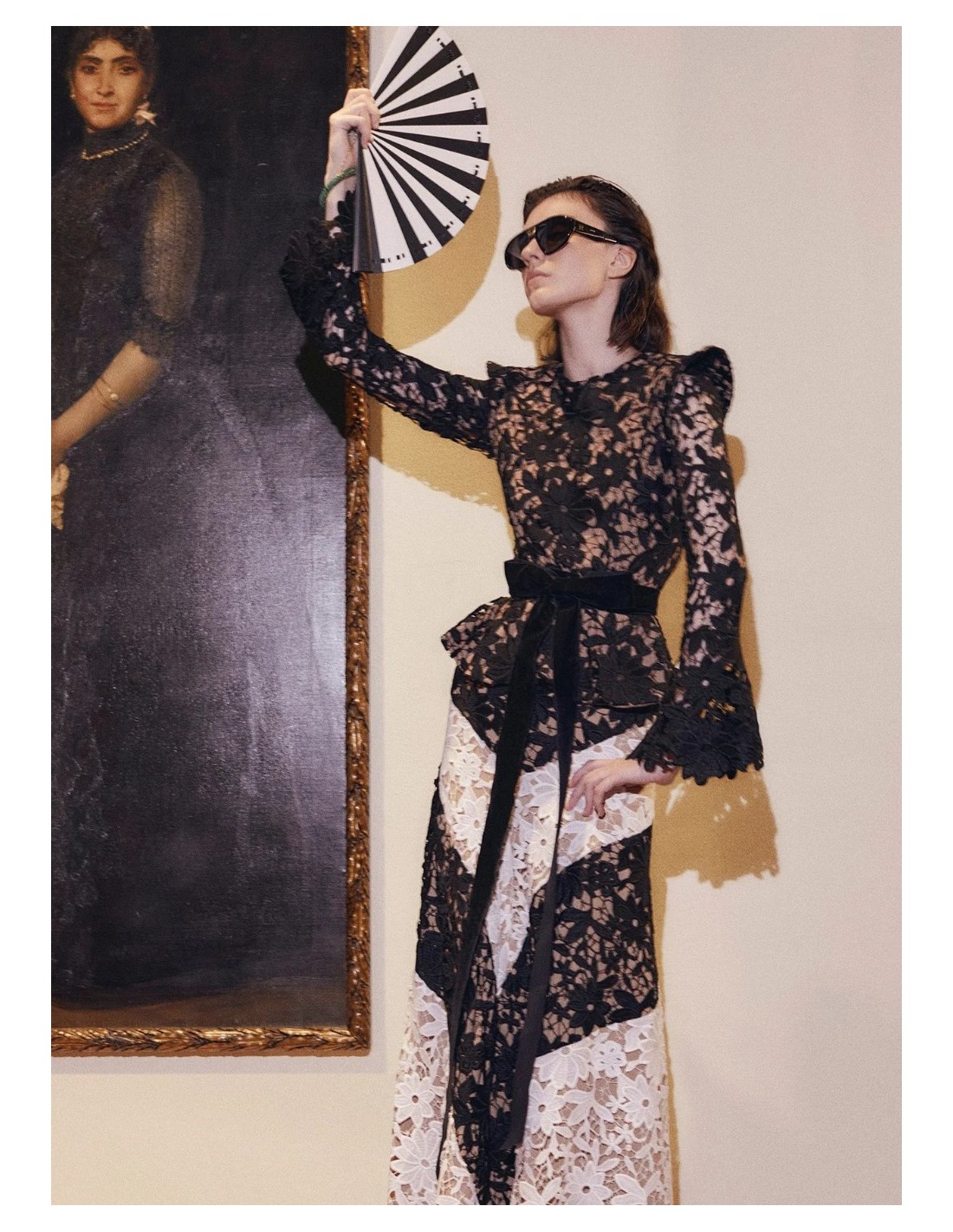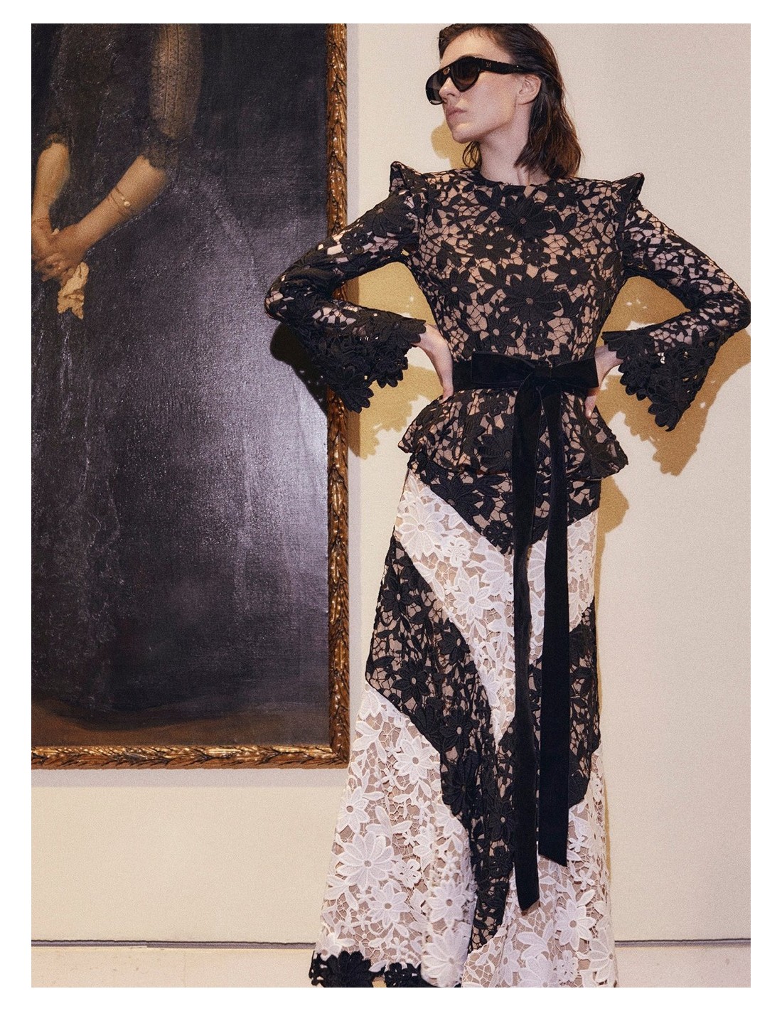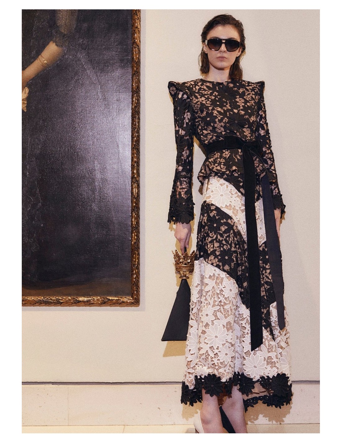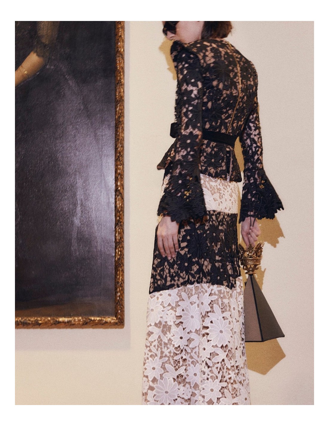 Falda midi con cinturilla de encaje con bordado de flores en diagonal en color negro y blanco.