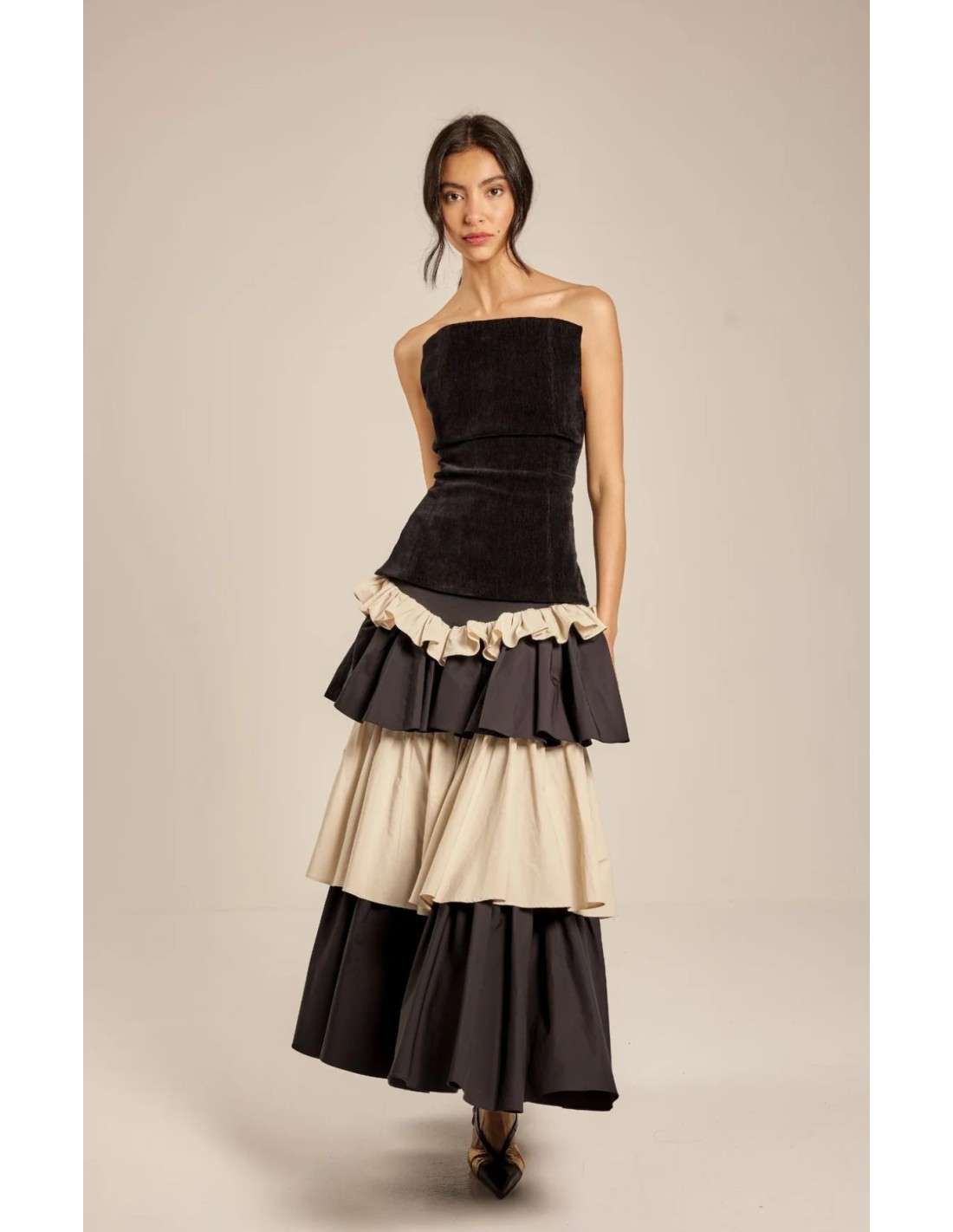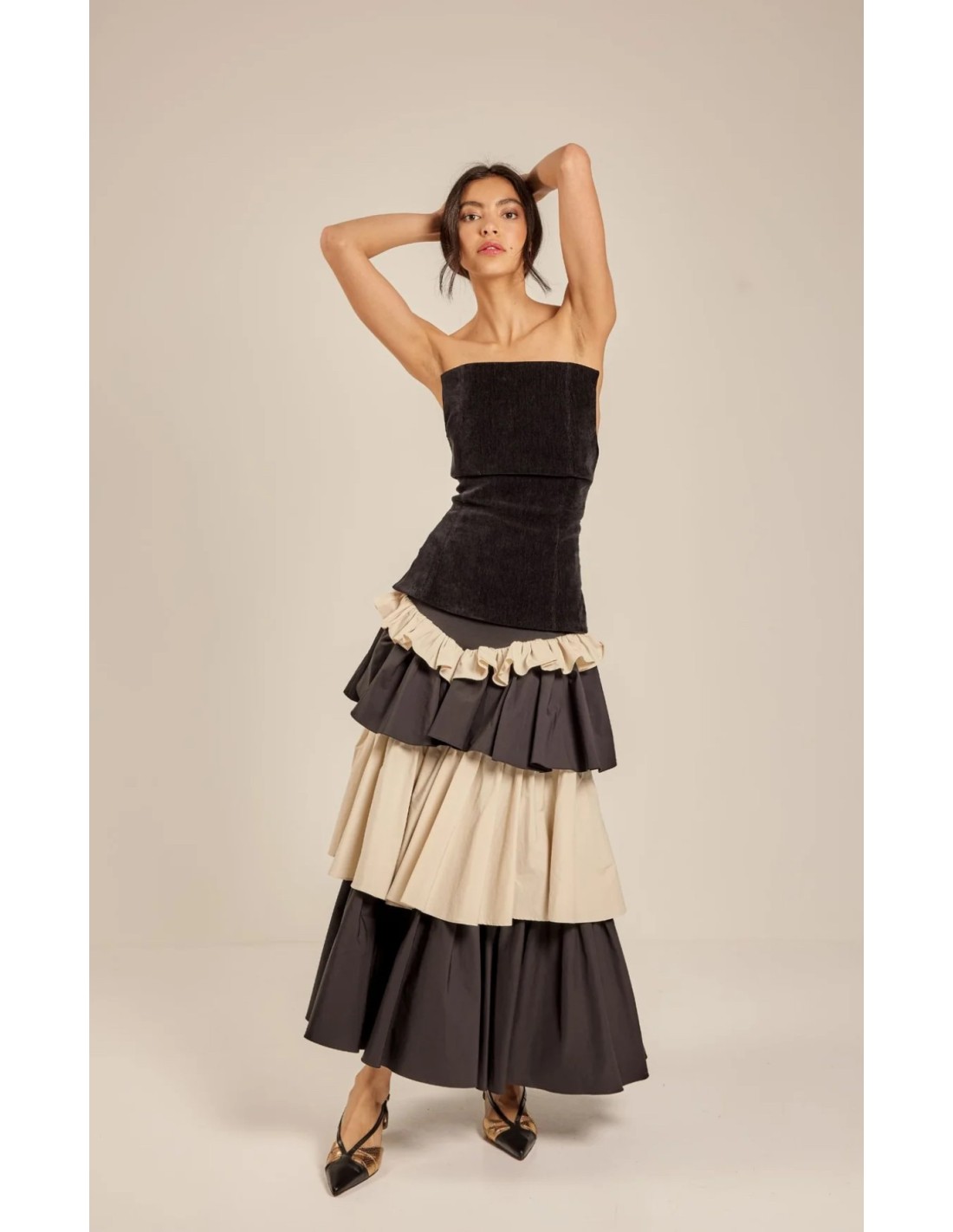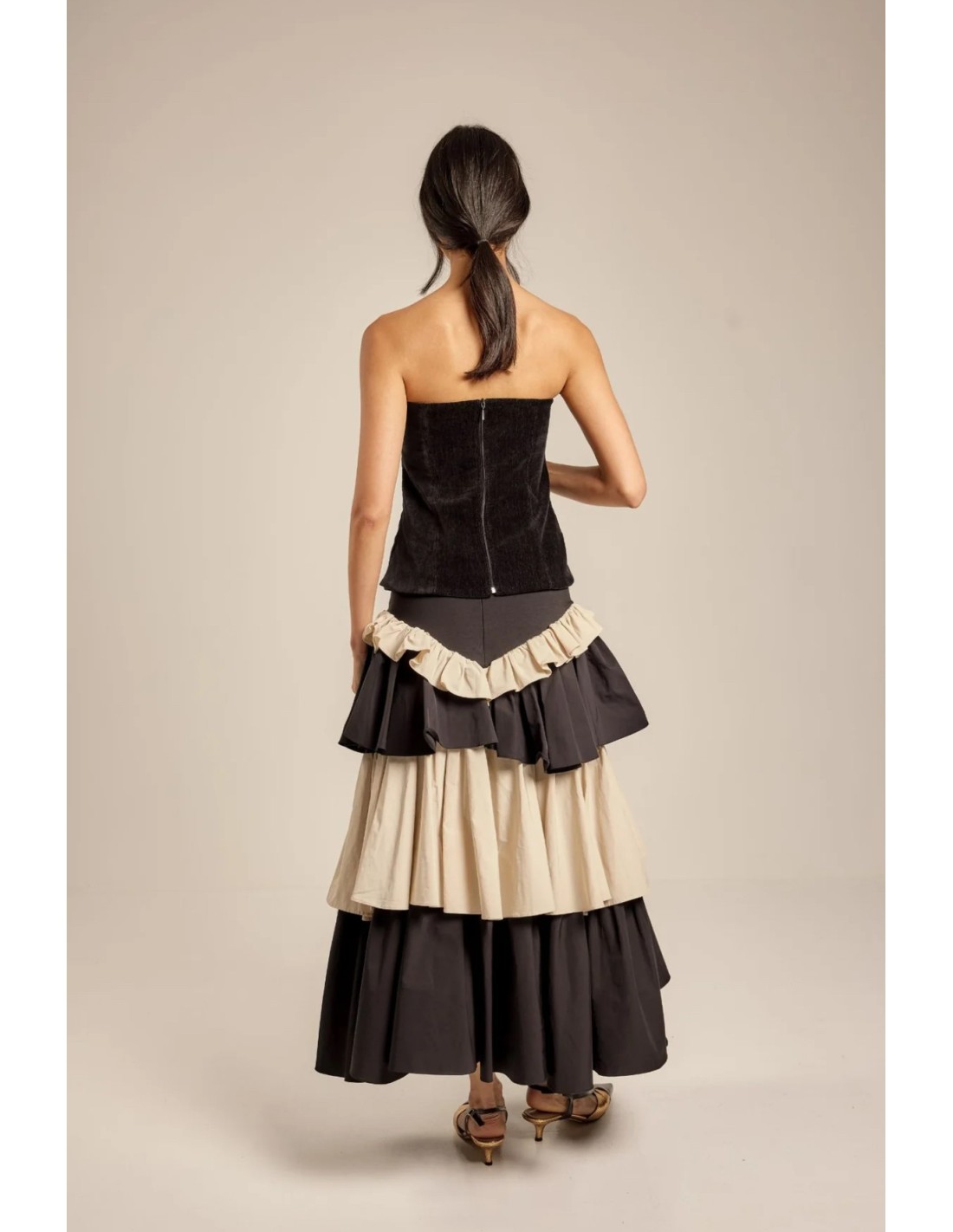 La Falda Pinto es una prenda única y sofisticada que destaca por su diseño de volantes en capas y su combinación bicolor en tonos neutros. Con un estilo elegante y moderno, esta falda larga aporta movimiento, volumen y personalidad a cualquier look.