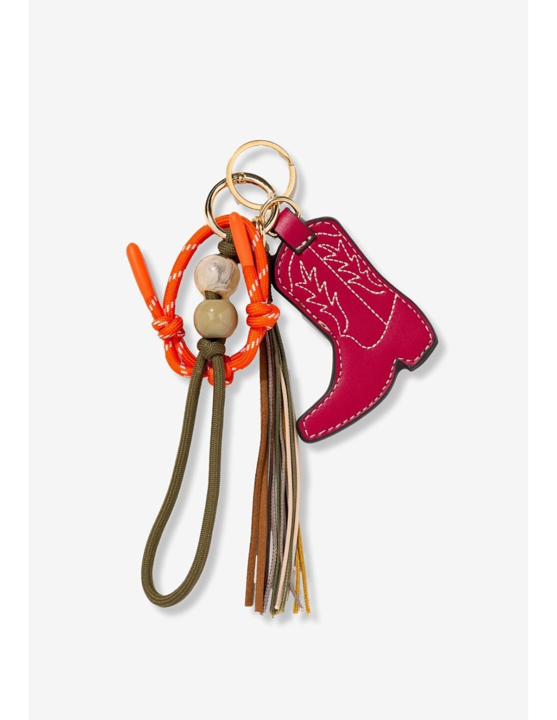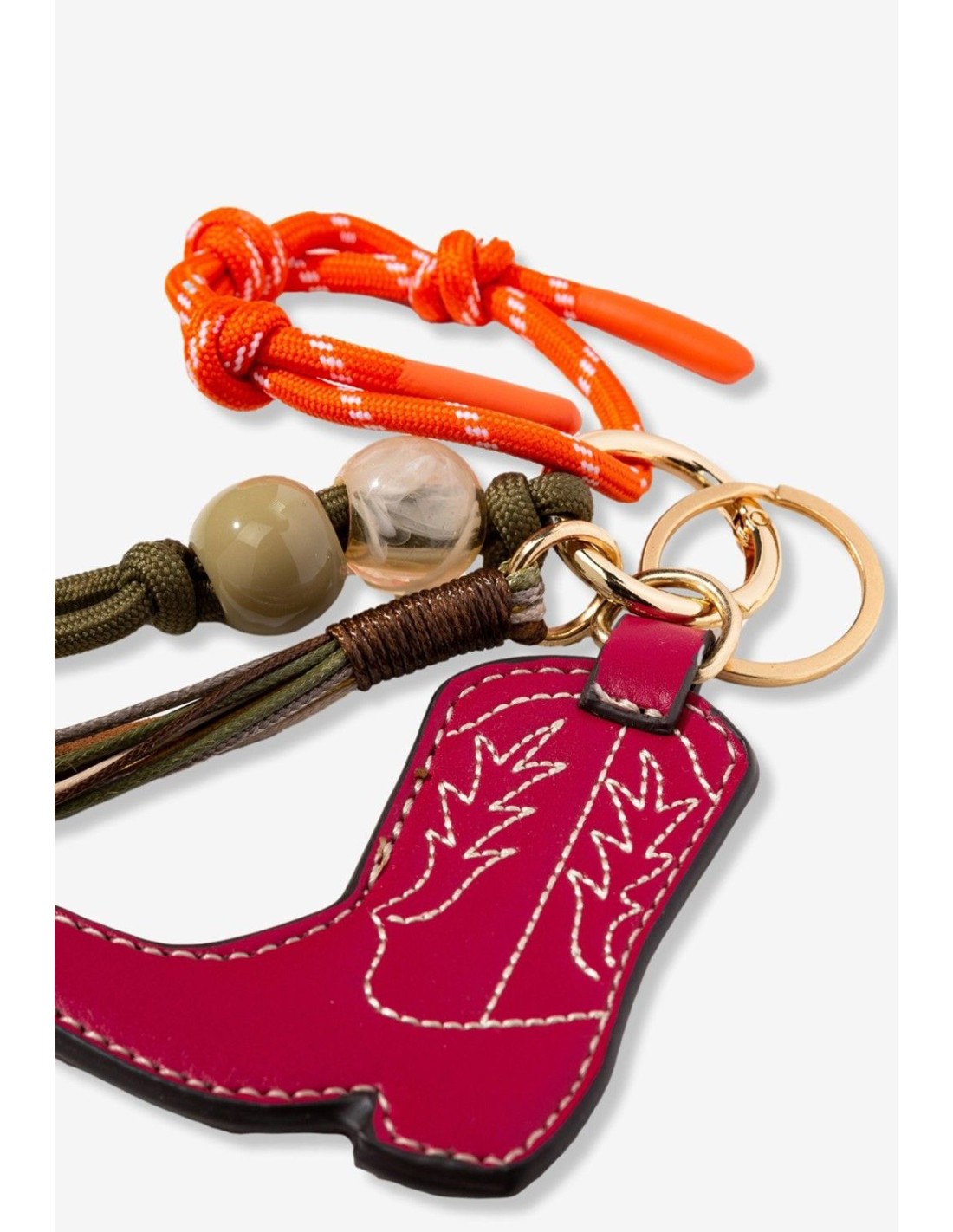 Llavero con bota rosa, flecos coloridos y cuentas, estilo boho vibrante y divertido.
