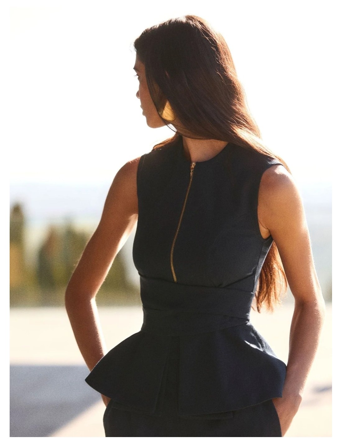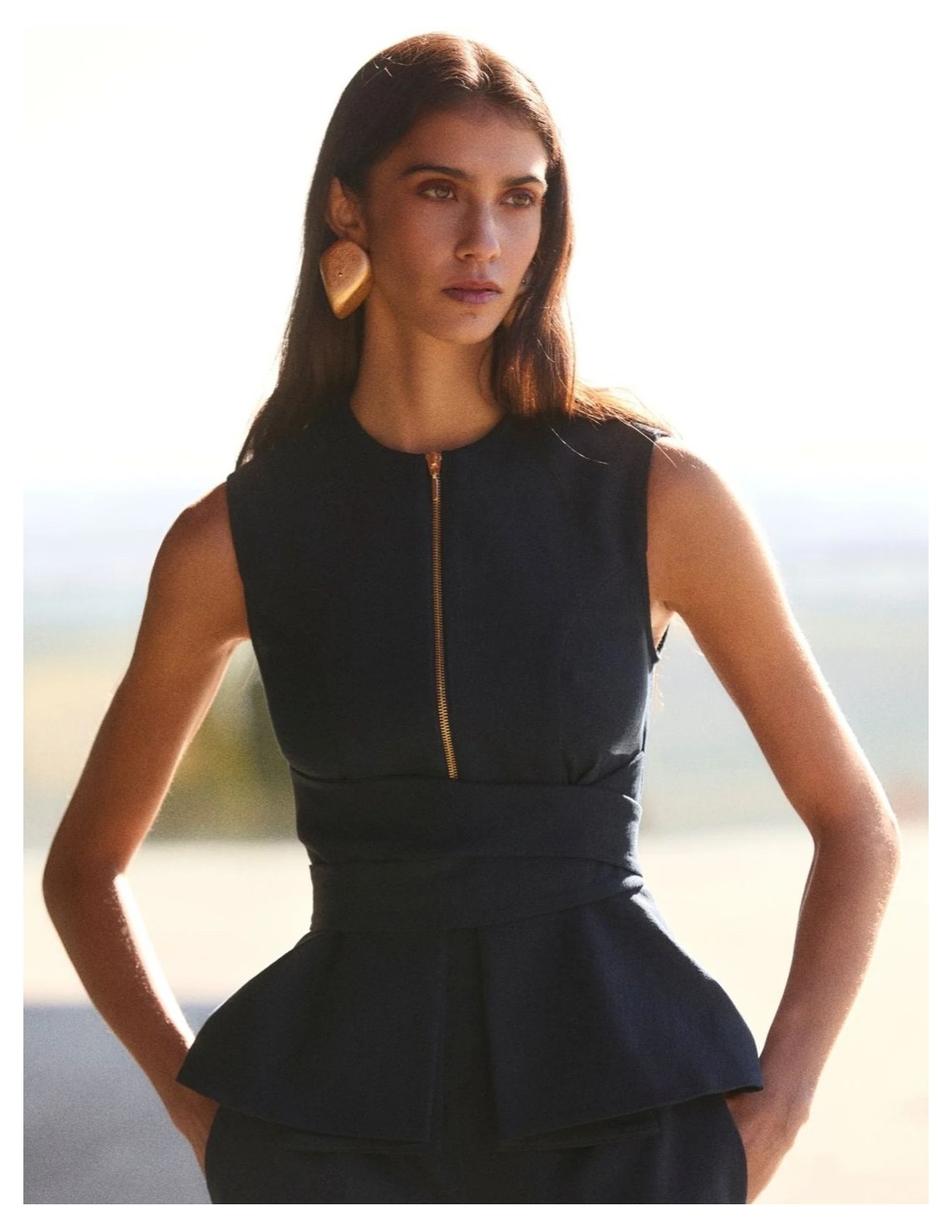 Detalle de cremallera delantera en color dorado y lazada multiposición.