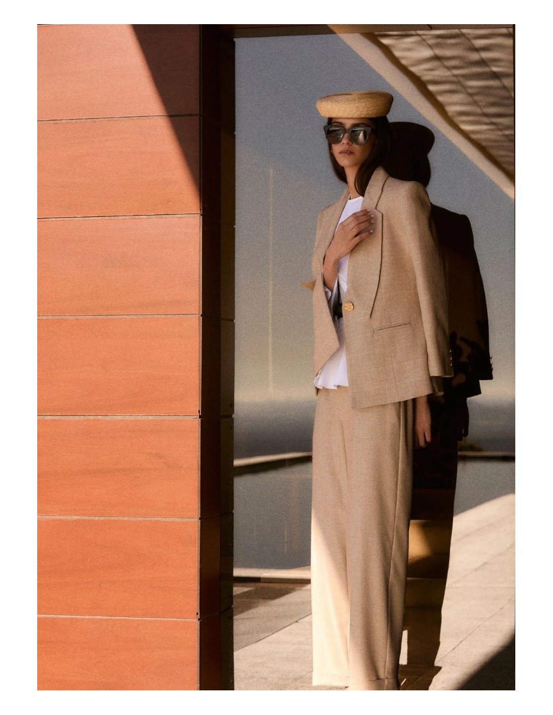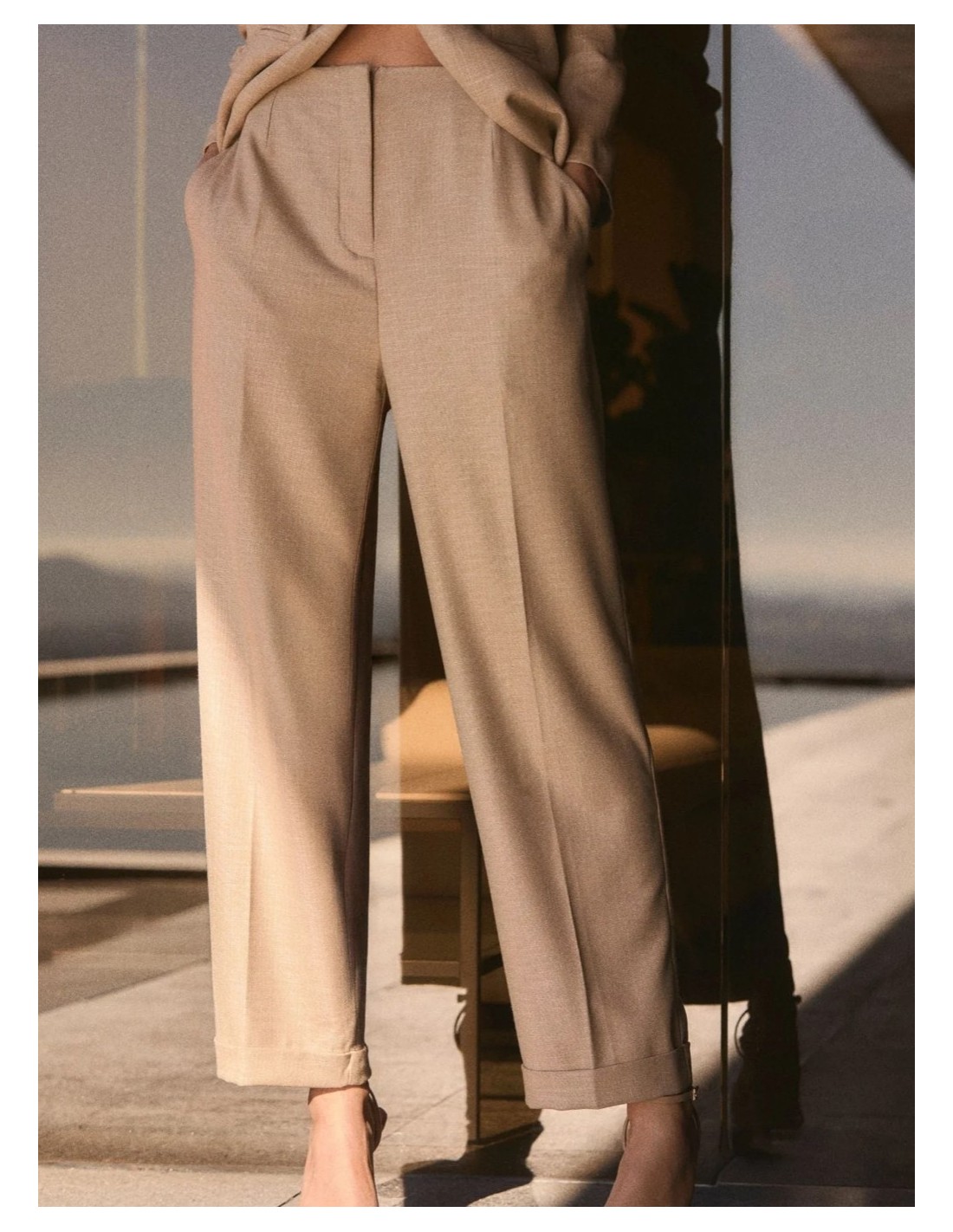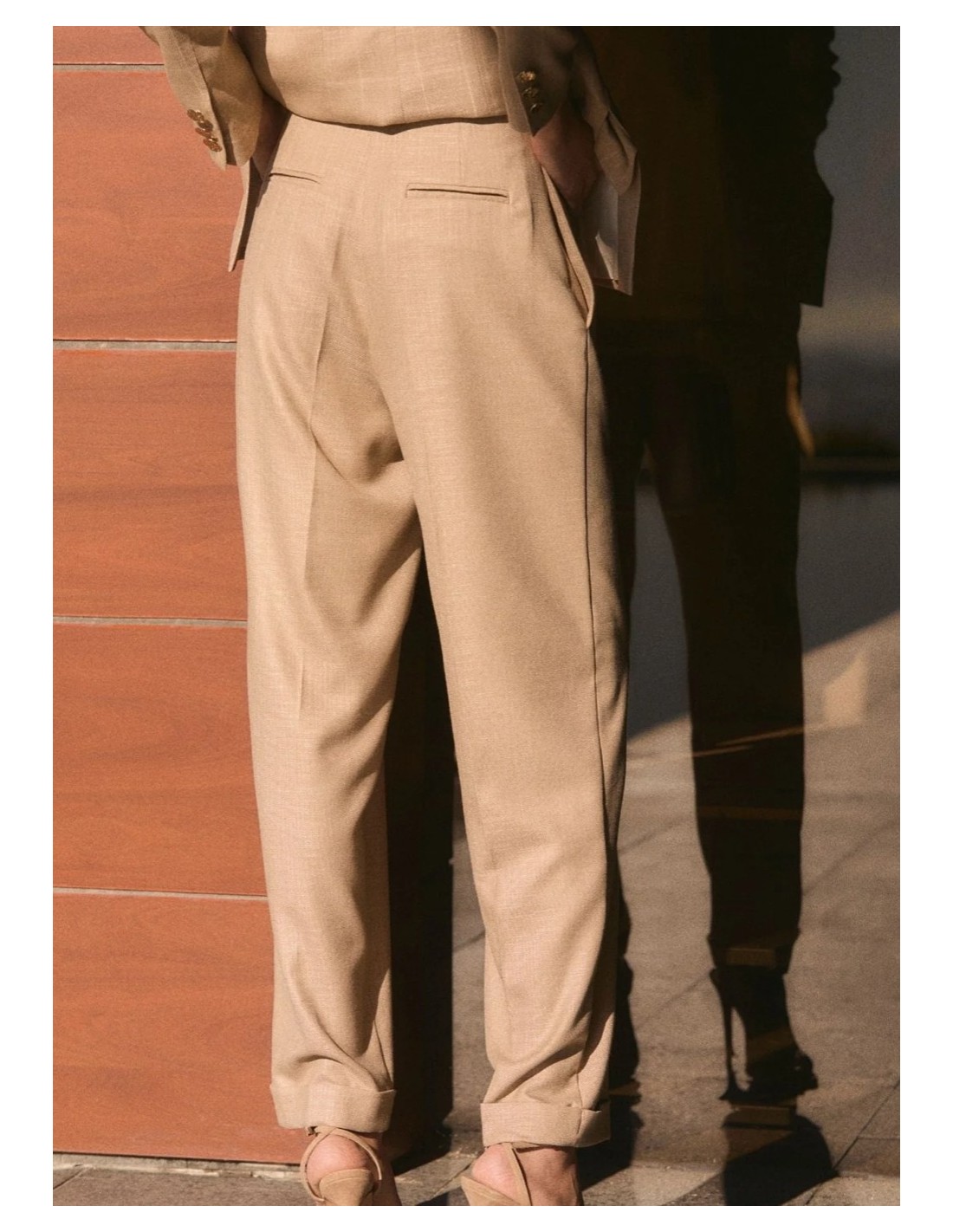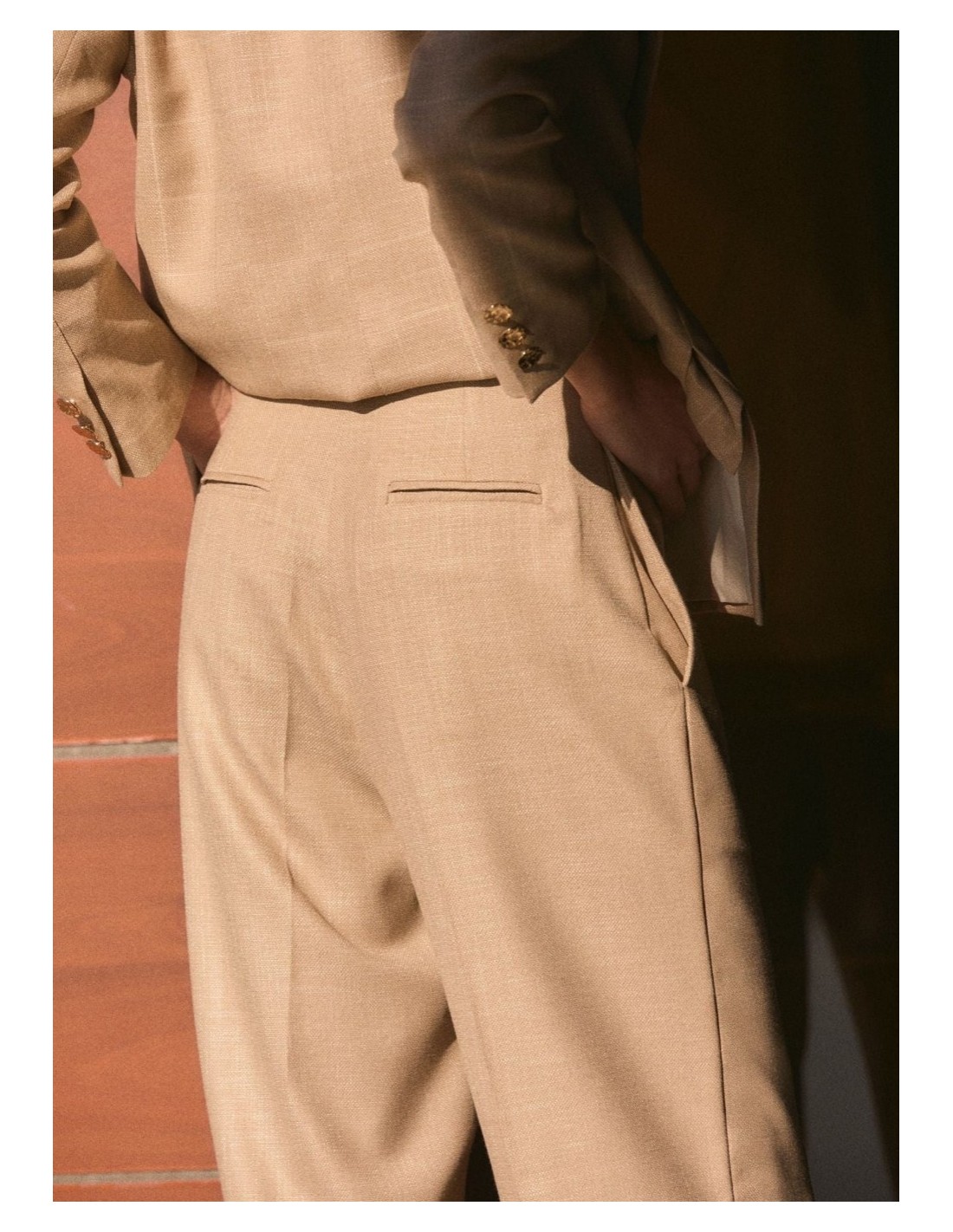 Pantalón de lino de tiro alto tipo "baggy" en color beige.