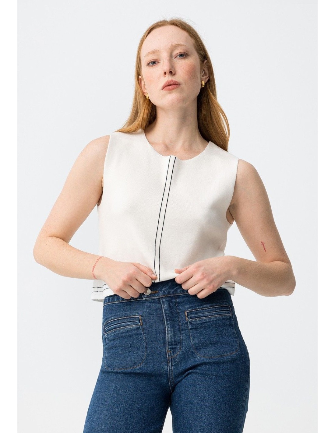 Camiseta sin mangas de color crudo, corte regular, con costuras negras visibles en centro y bajo.