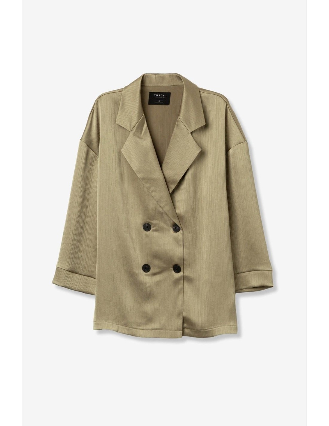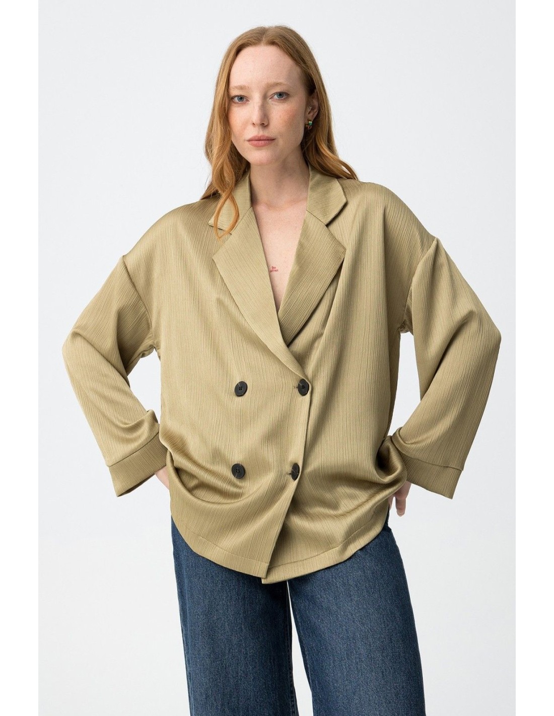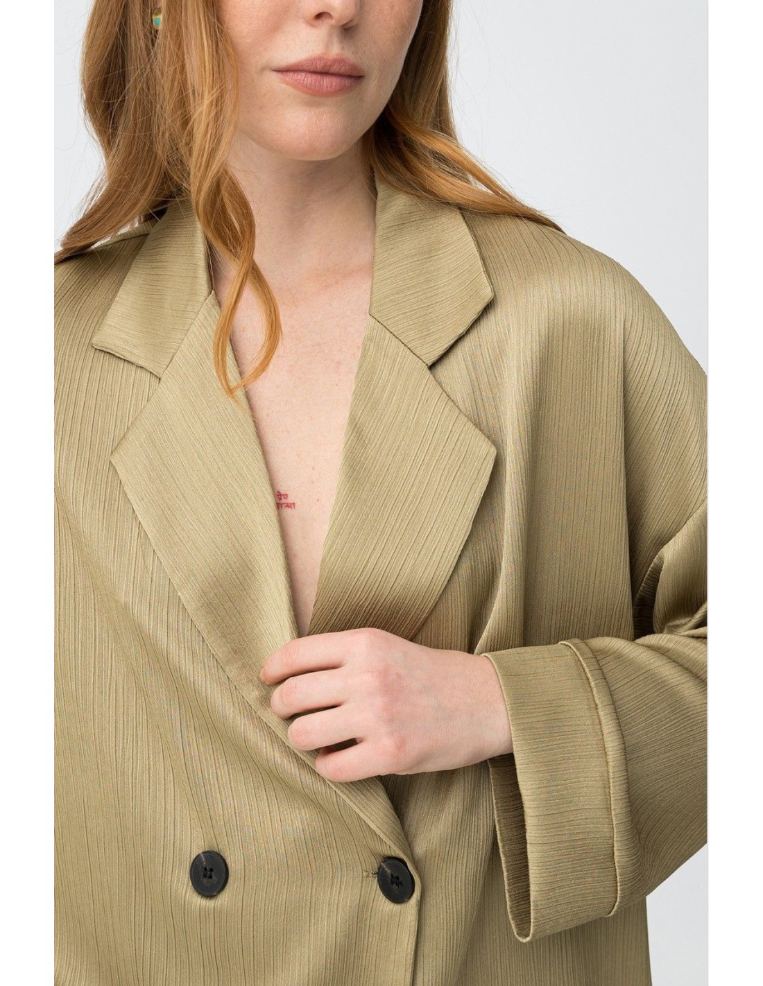 Blazer de color verde claro, corte amplio, doble botonadura, solapas grandes y textura acanalada minimalista.