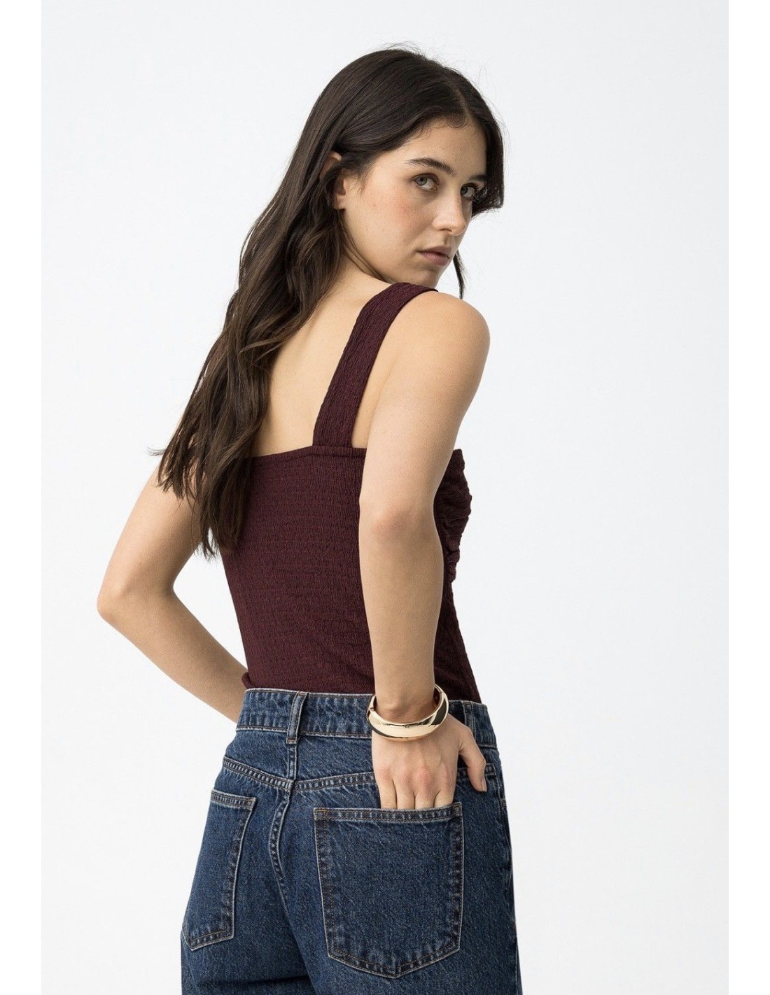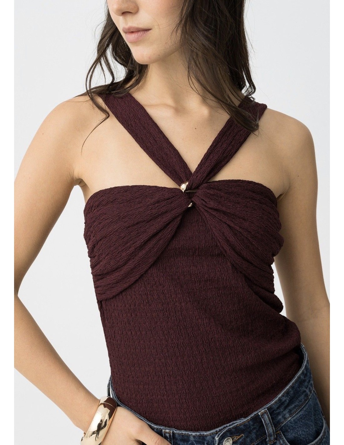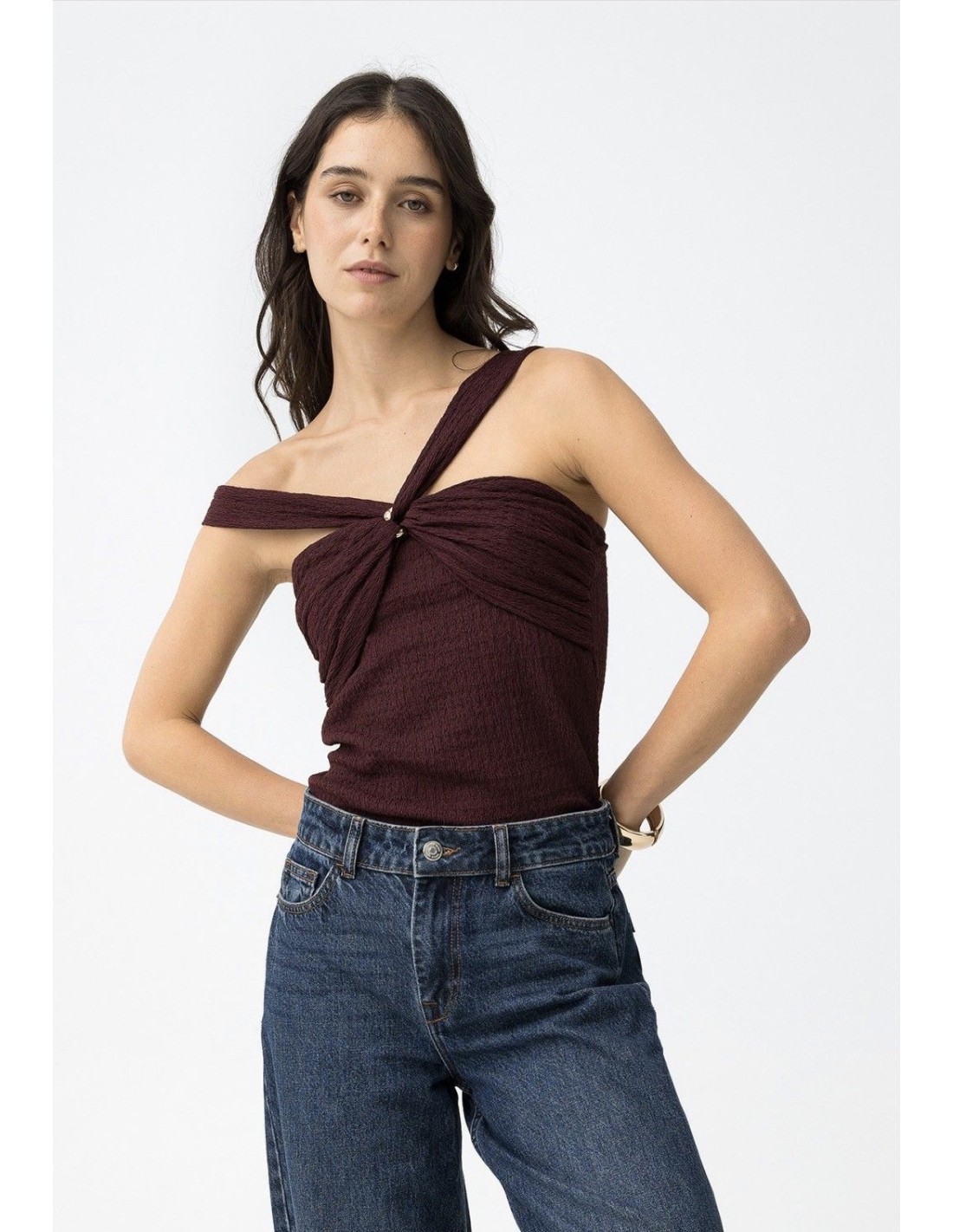 Top súper slim en tono burdeos con diseño asimétrico y detalle de nudo en el escote.