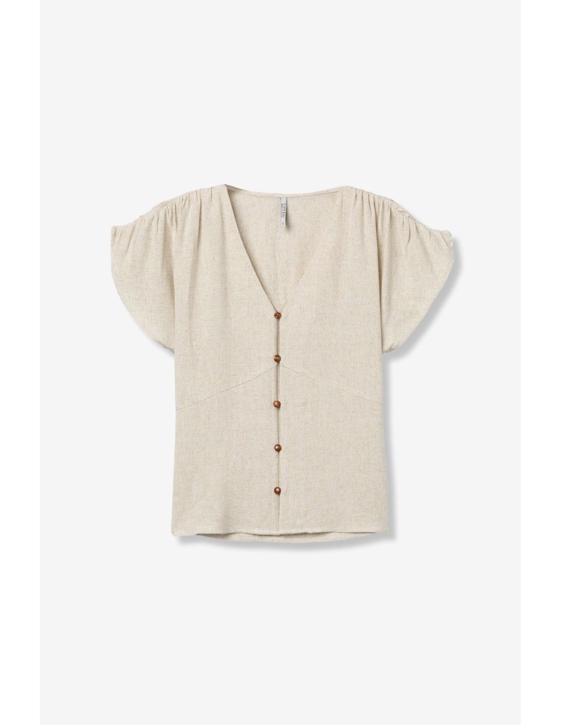 Blusa de color beige, corte regular, manga corta ancha, escote en V y botones marrones delante.
