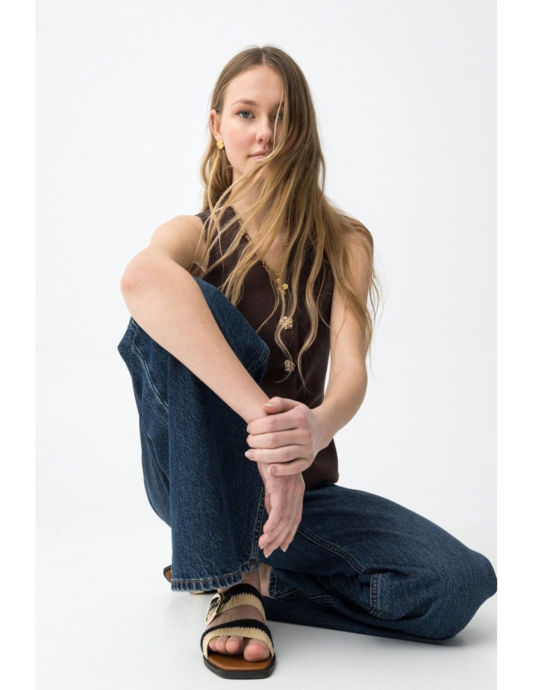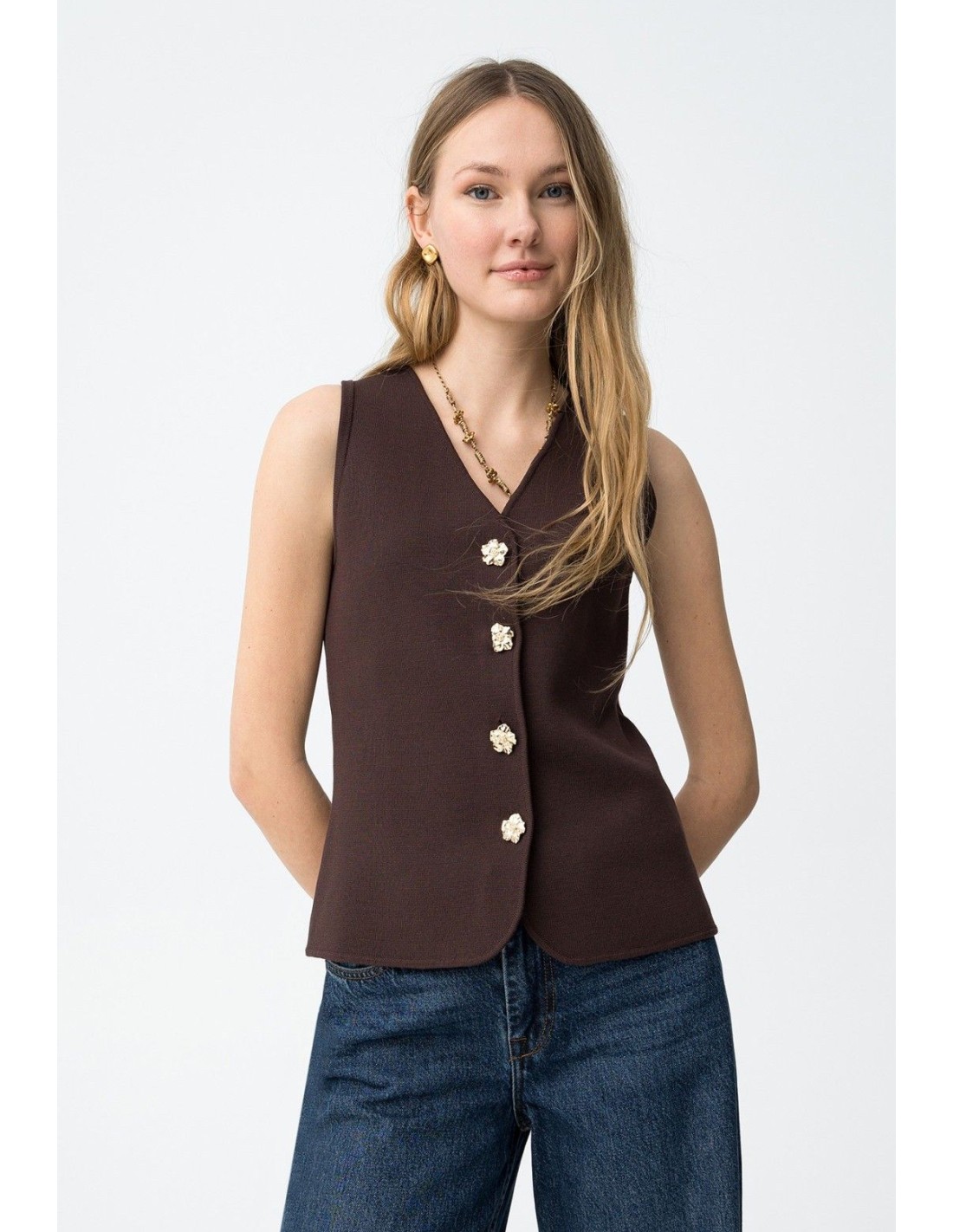 Camiseta ajustada de color chocolate, sin mangas, con botones dorados y escote en pico.