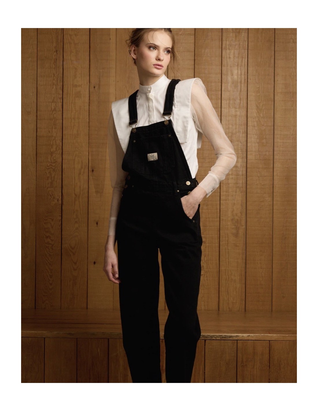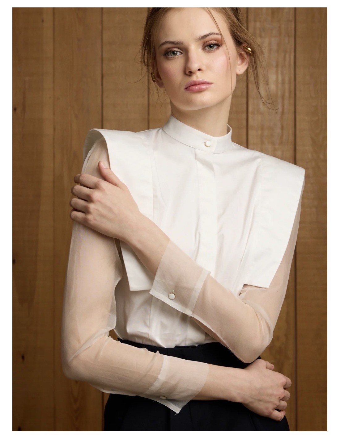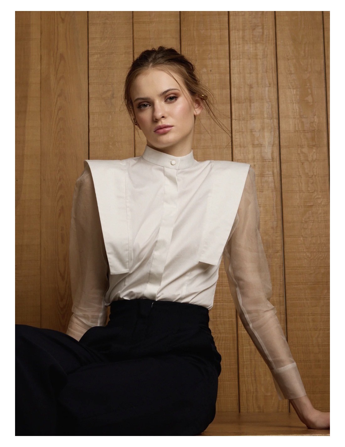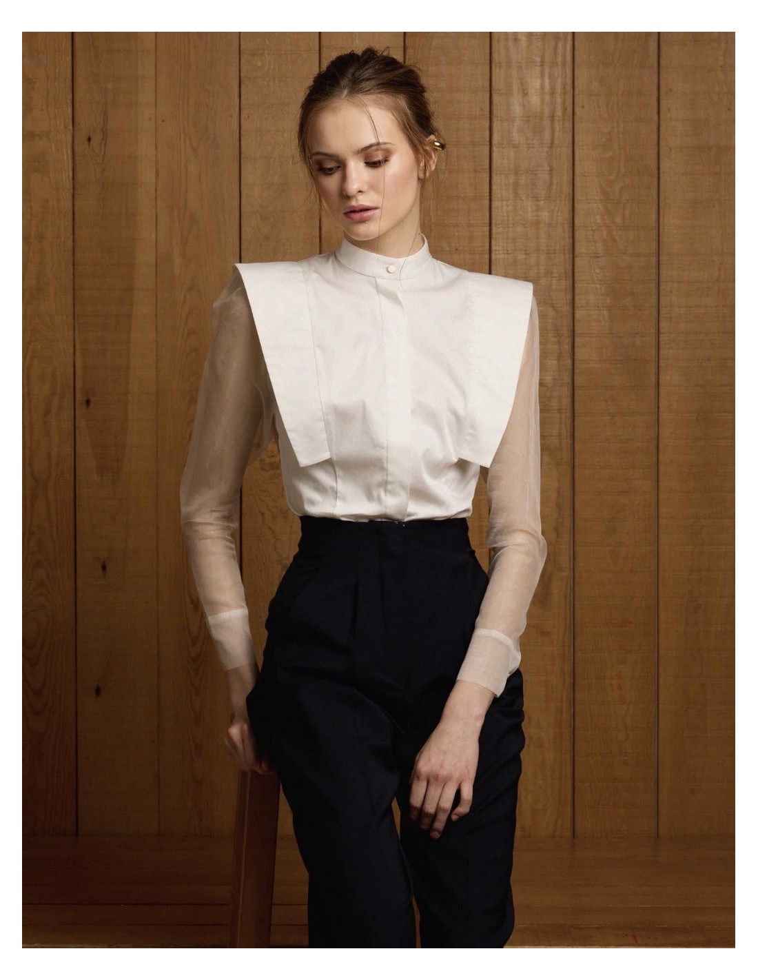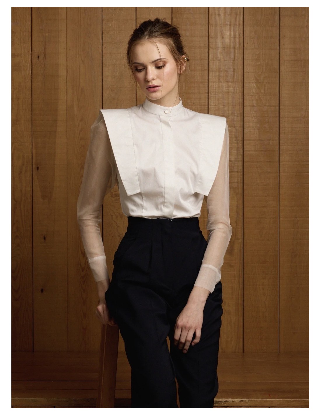 Cuello de tirilla y detalle de solapa en parte delantera y trasera.