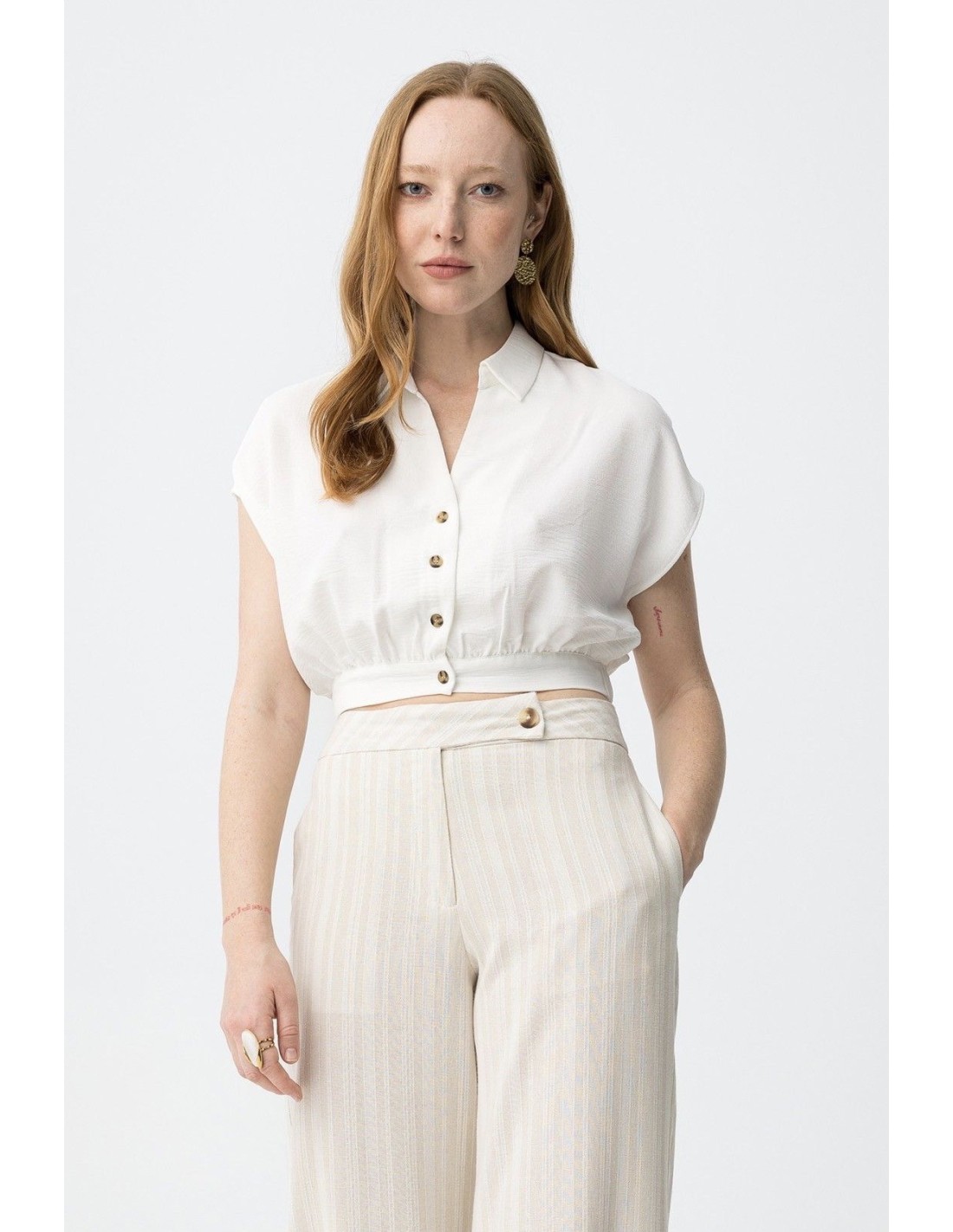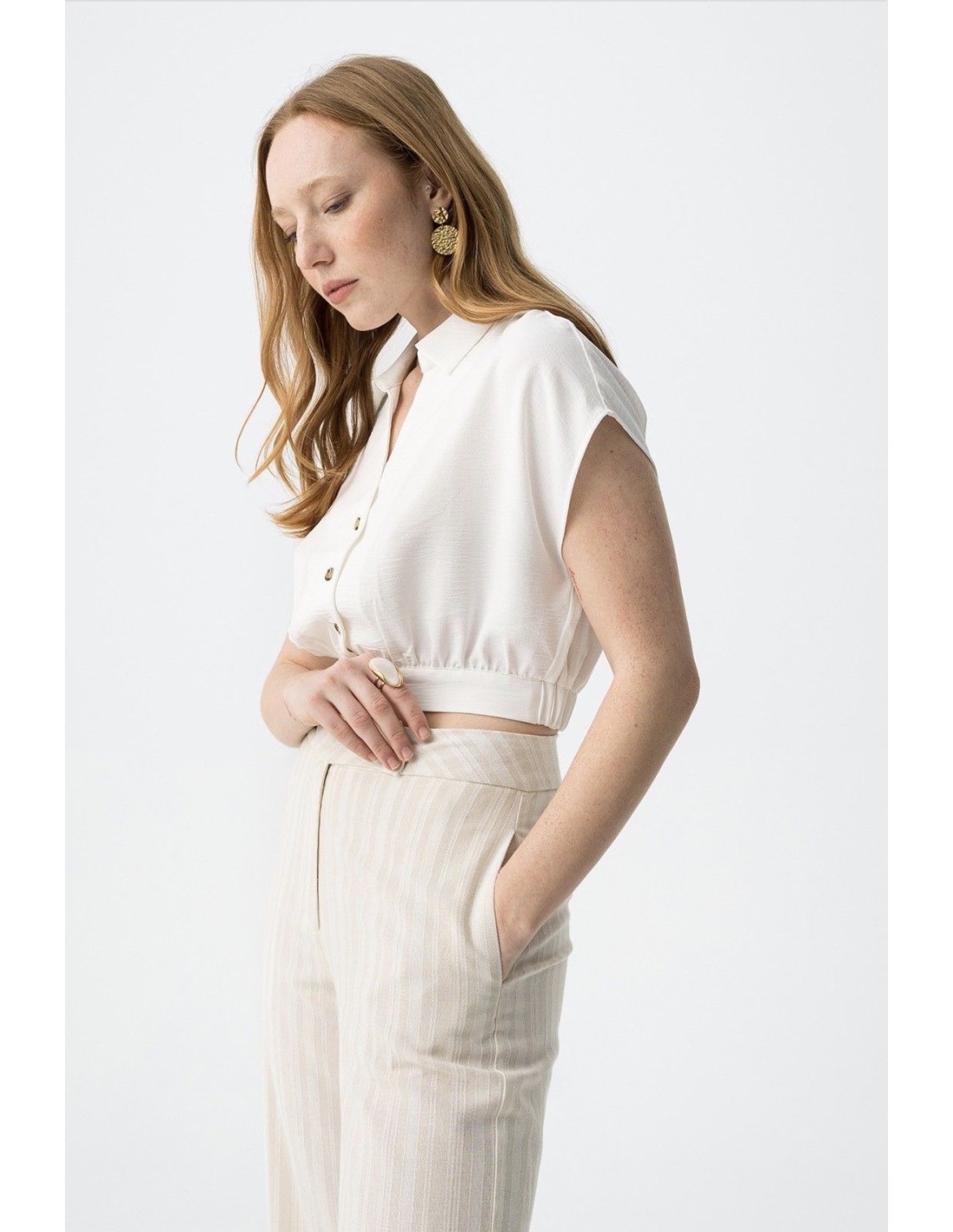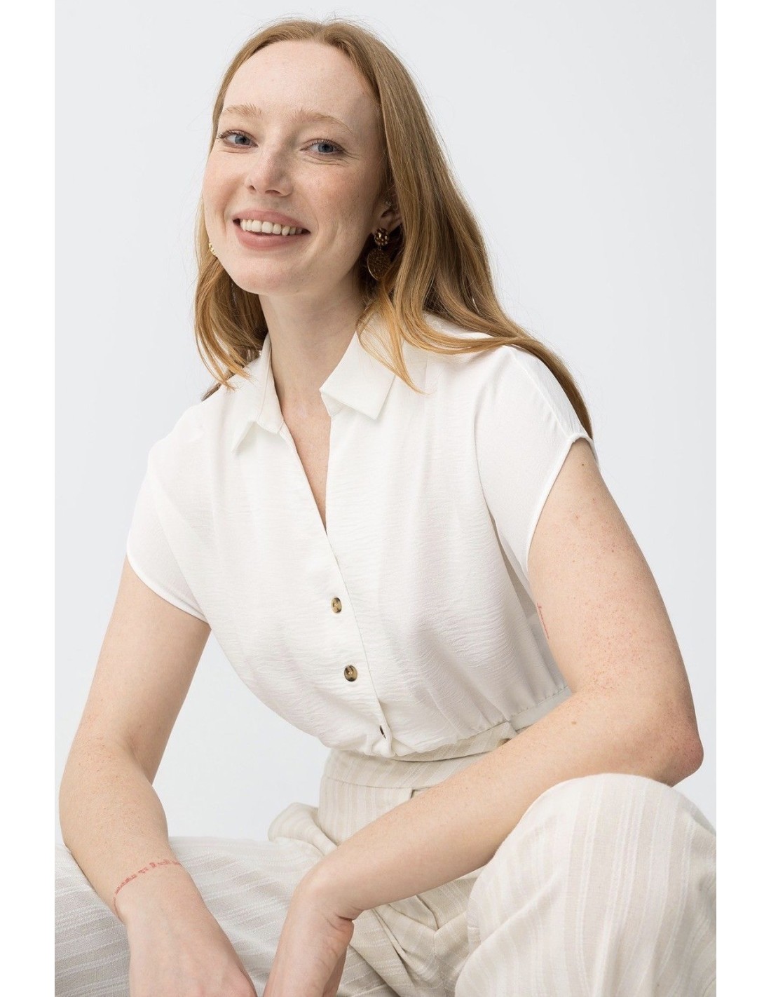 Camisa de manga corta, corte relaxed, botones delanteros y cintura elástica, en tono crudo suave.