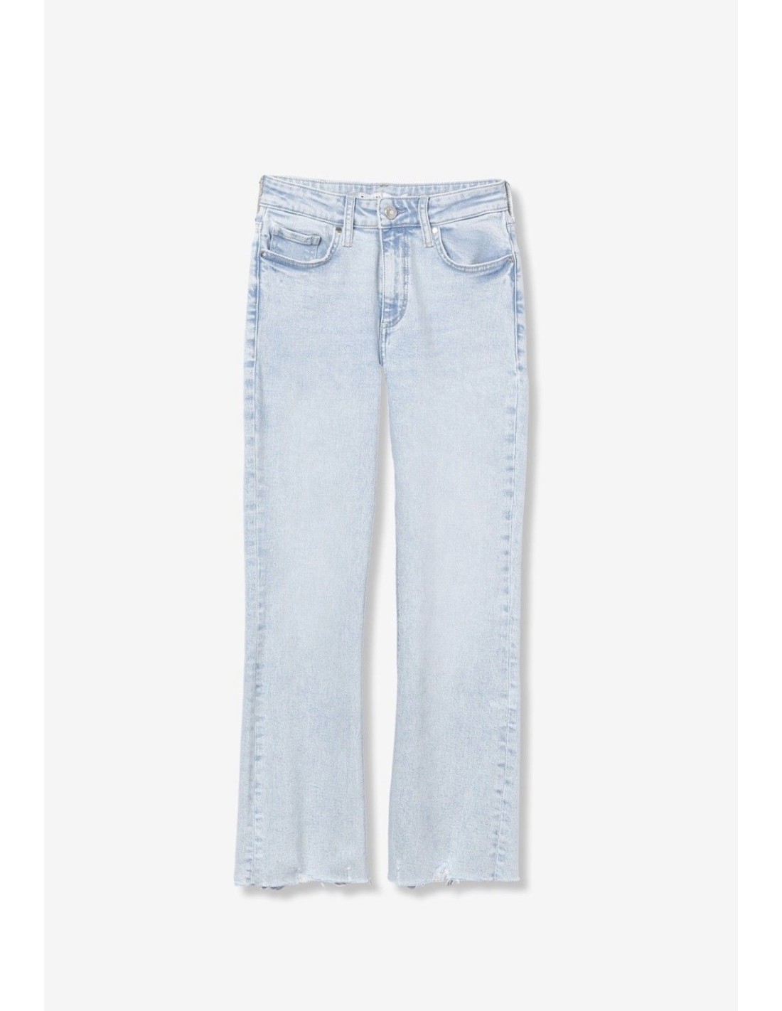 Vaqueros de corte cropped flare en azul claro, con cinco bolsillos y detalles deshilachados en el bajo.
