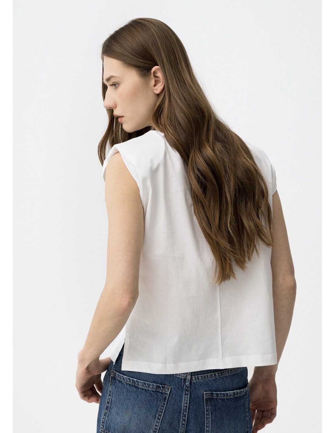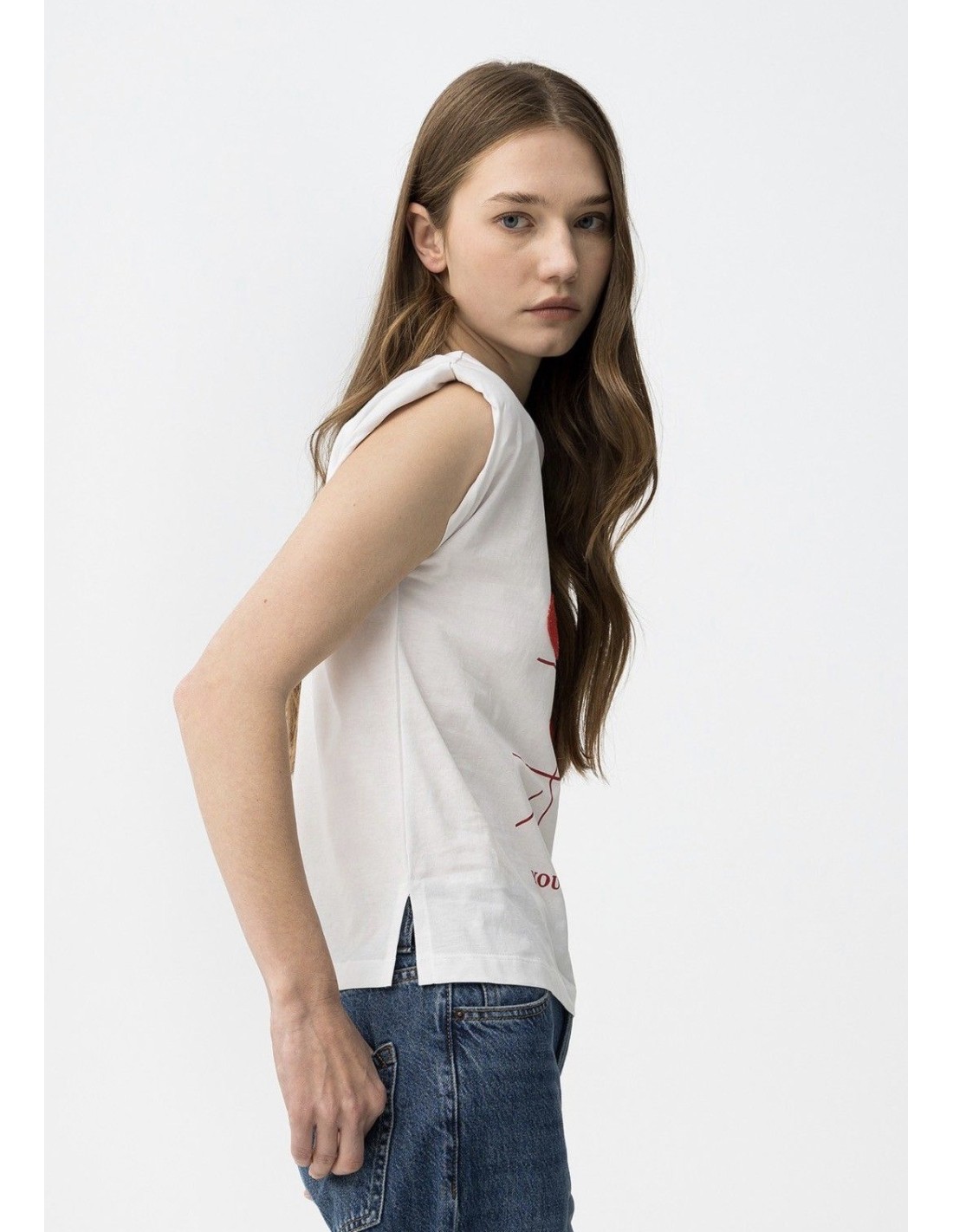 Camiseta blanca de corte recto, manga corta, estampado rojo frontal y pequeñas aberturas laterales.