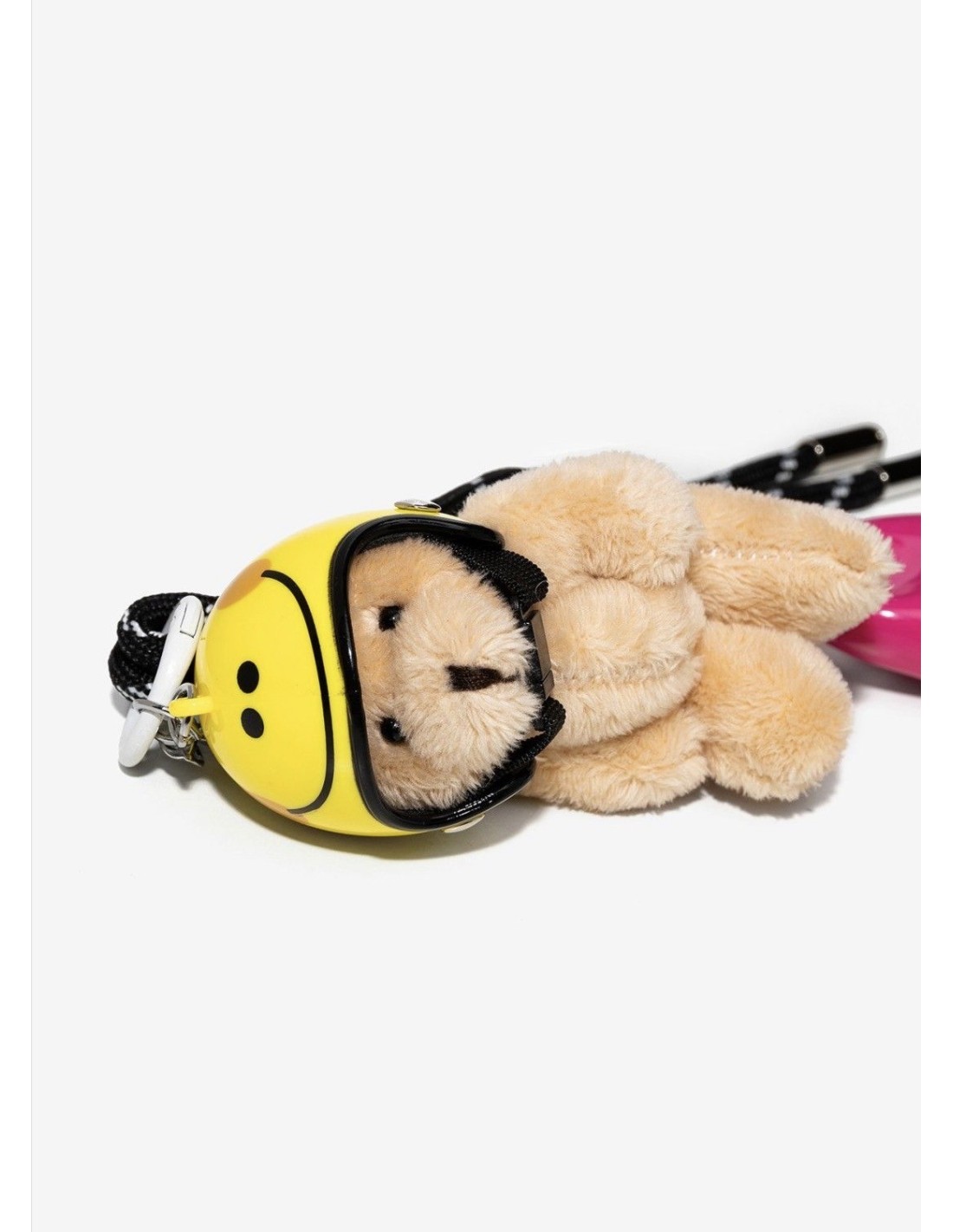 Divertido porta-chaves con osito de peluche, casco amarillo y detalles en rosa vibrante.