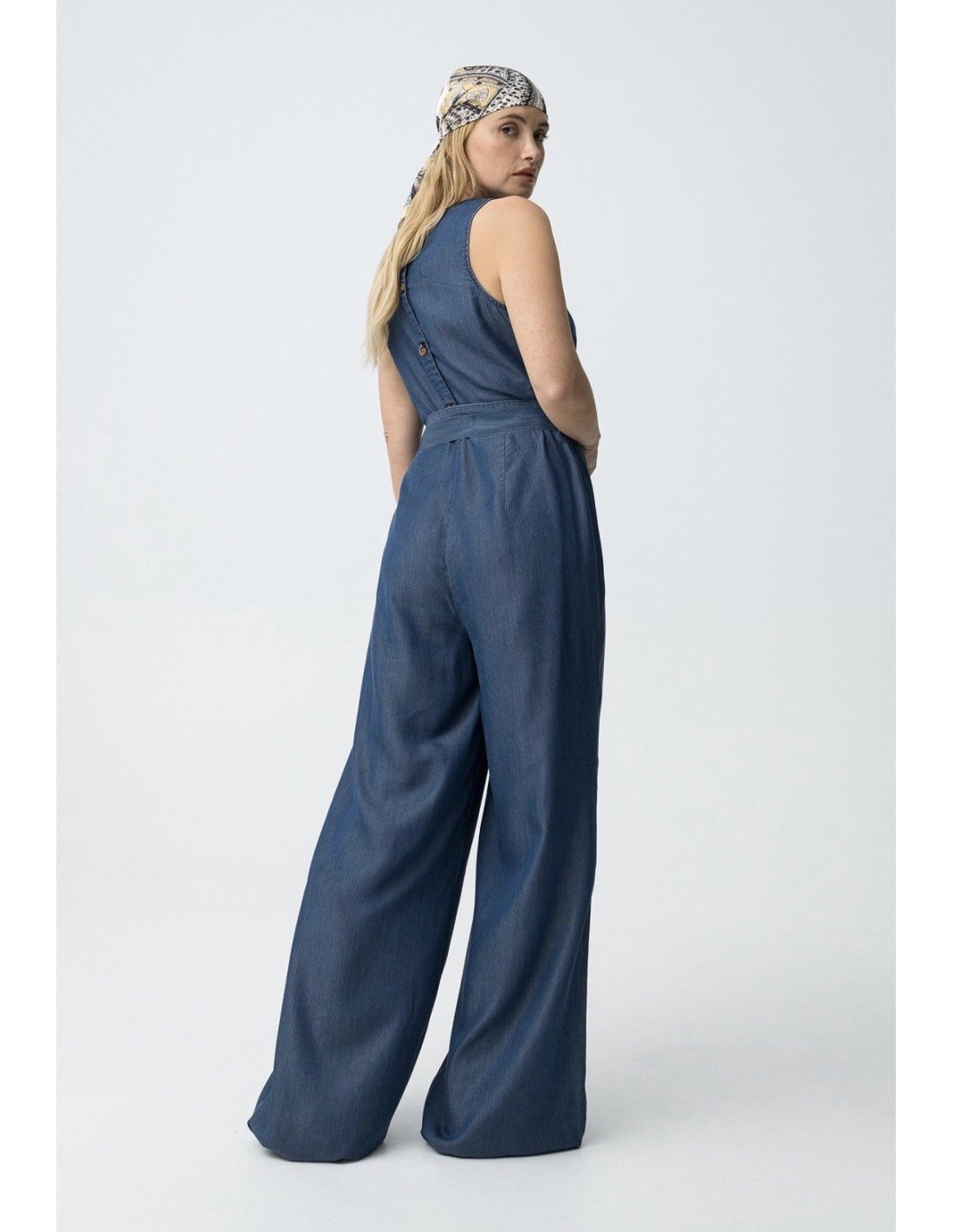 Mono azul oscuro de corte ancho, sin mangas, escote redondo y cinturón del mismo tejido.