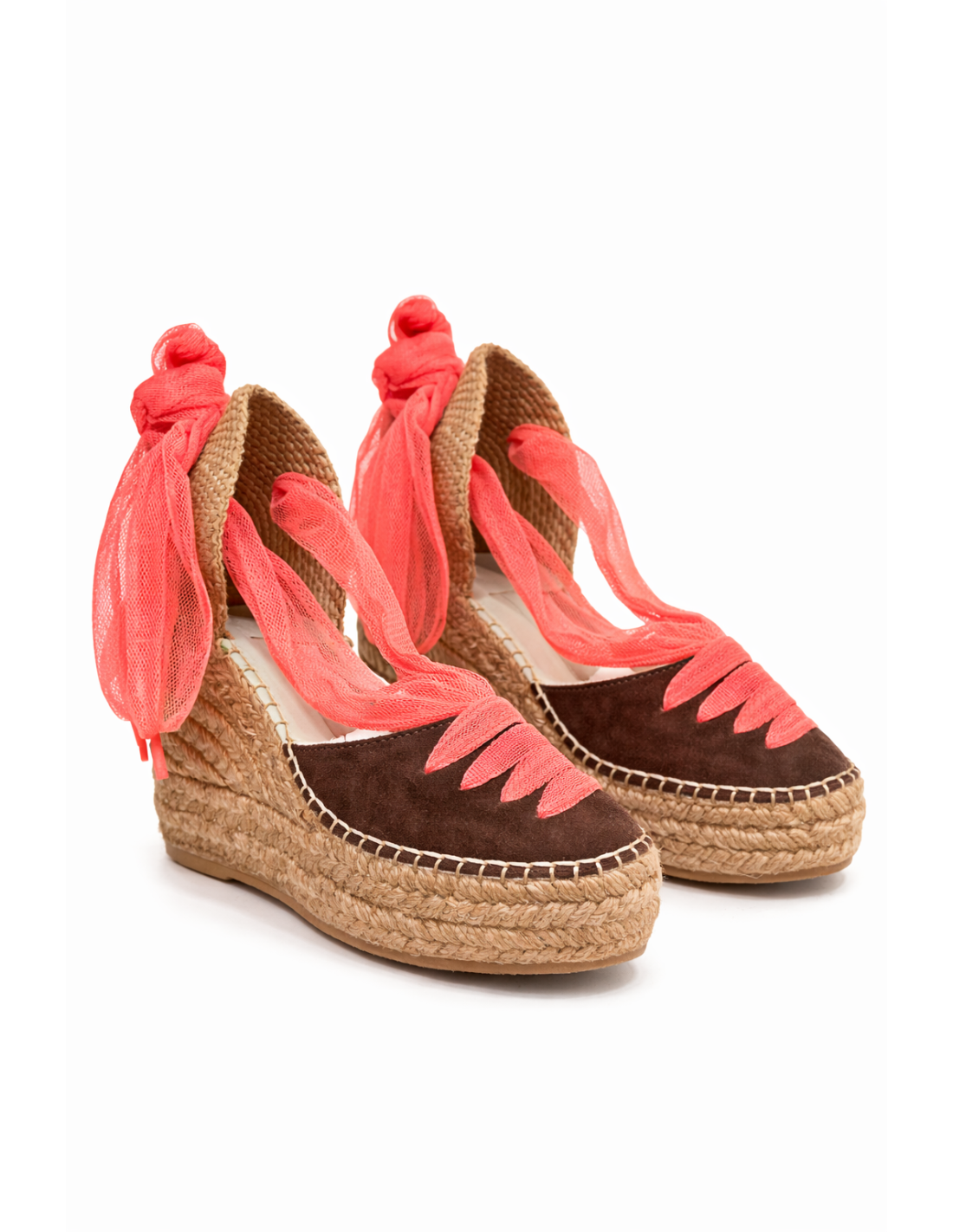Confeccionada con empeine en tono marrón y suela de yute trenzado natural, destaca por sus originales lazos de tul en color coral que aportan un toque femenino y sofisticado.