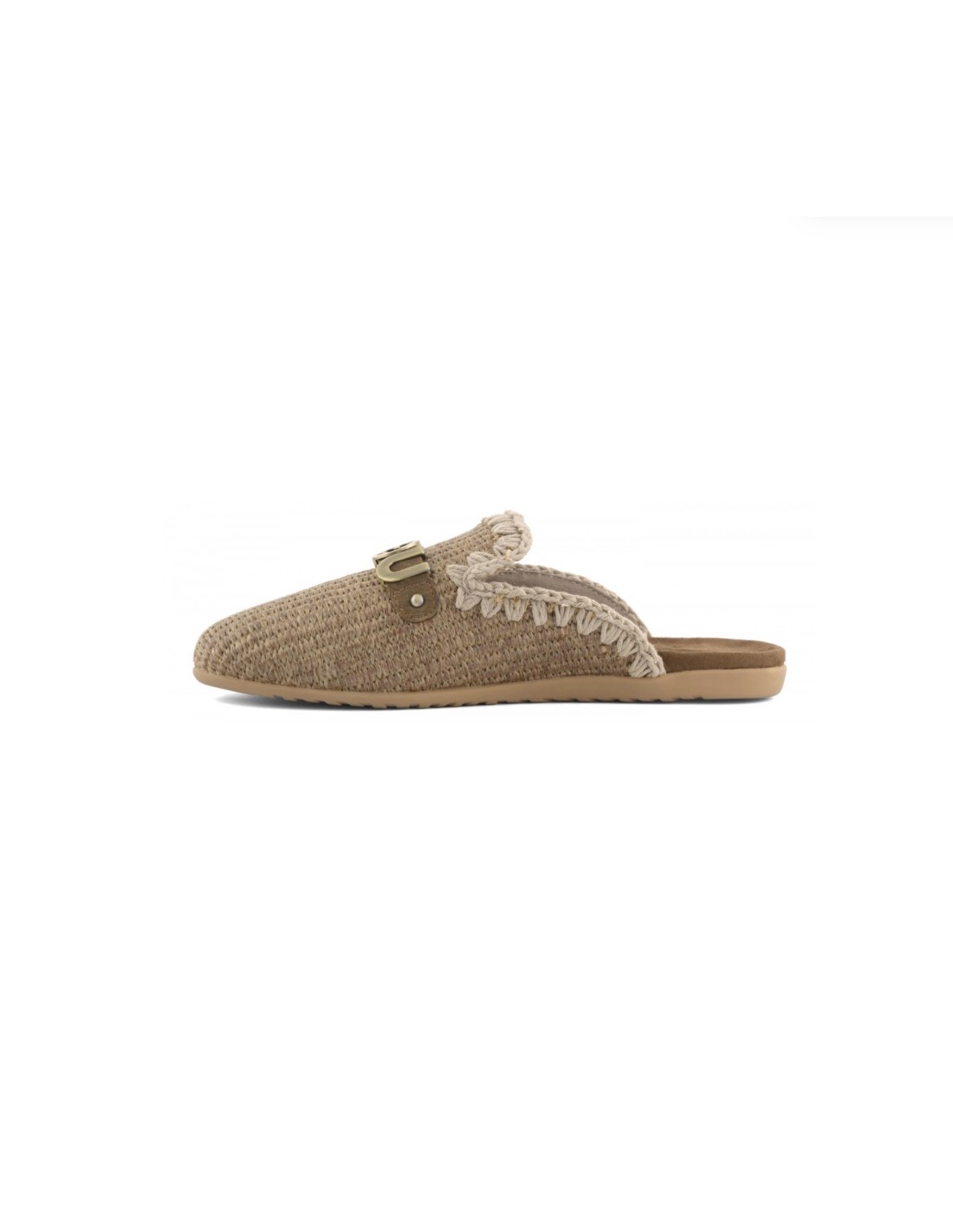 Presenta empeine de rafia, grande logo metálico y la característica costura de ganchillo de mou.