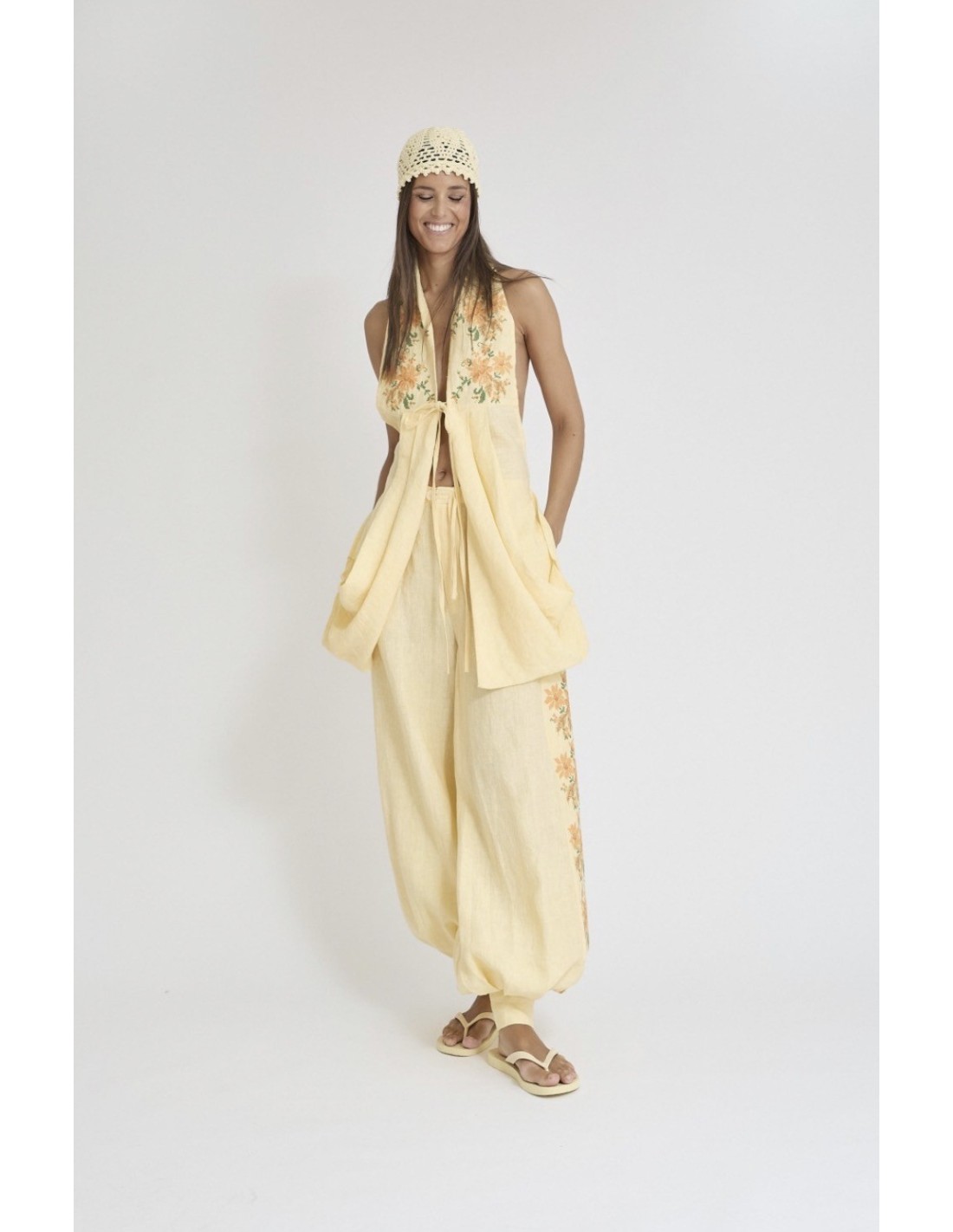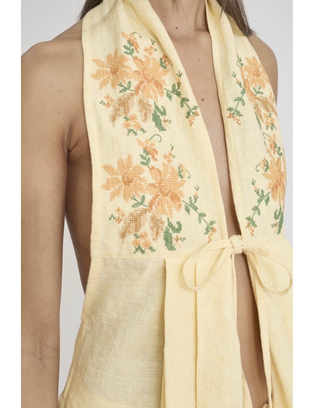 Chaleco de mujer en lino 100% con bordado en el pecho, ligero y elegante, ideal para un look sofisticado y chic durante el verano.