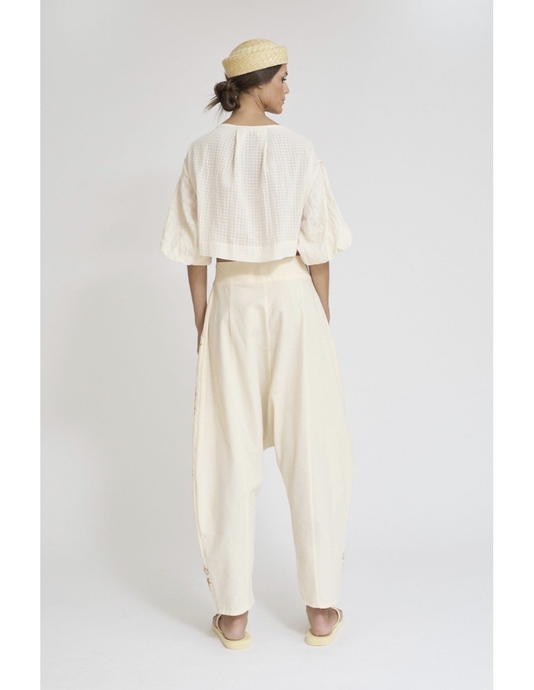 Pantalón baggy de mujer en 100% algodón con bordado hecho a mano en los laterales, ligero y cómodo, ideal para el verano.