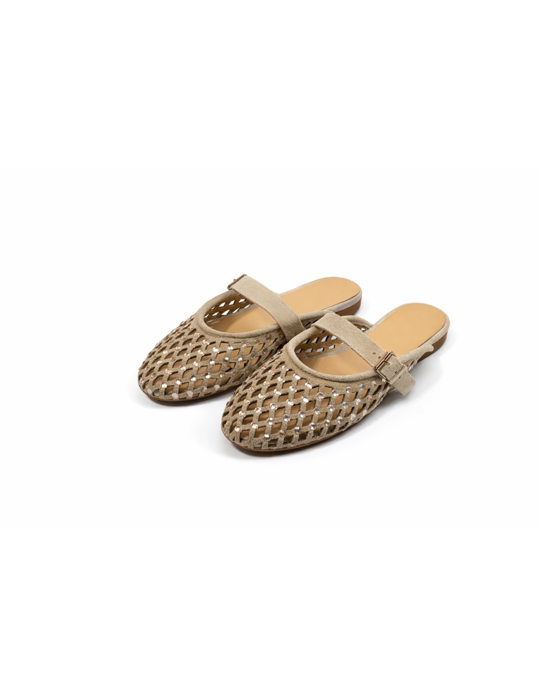 Su acabado calado con detalles metálicos crea un efecto visual delicado y elegante, ideal para los meses más cálidos.