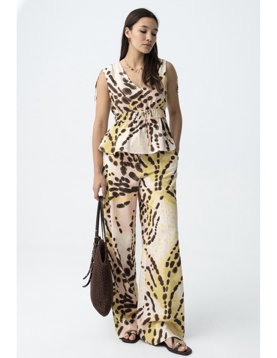 Pantalones anchos de color claro con estampado abstracto en amarillo, marrón y rosa, cintura ajustable.
