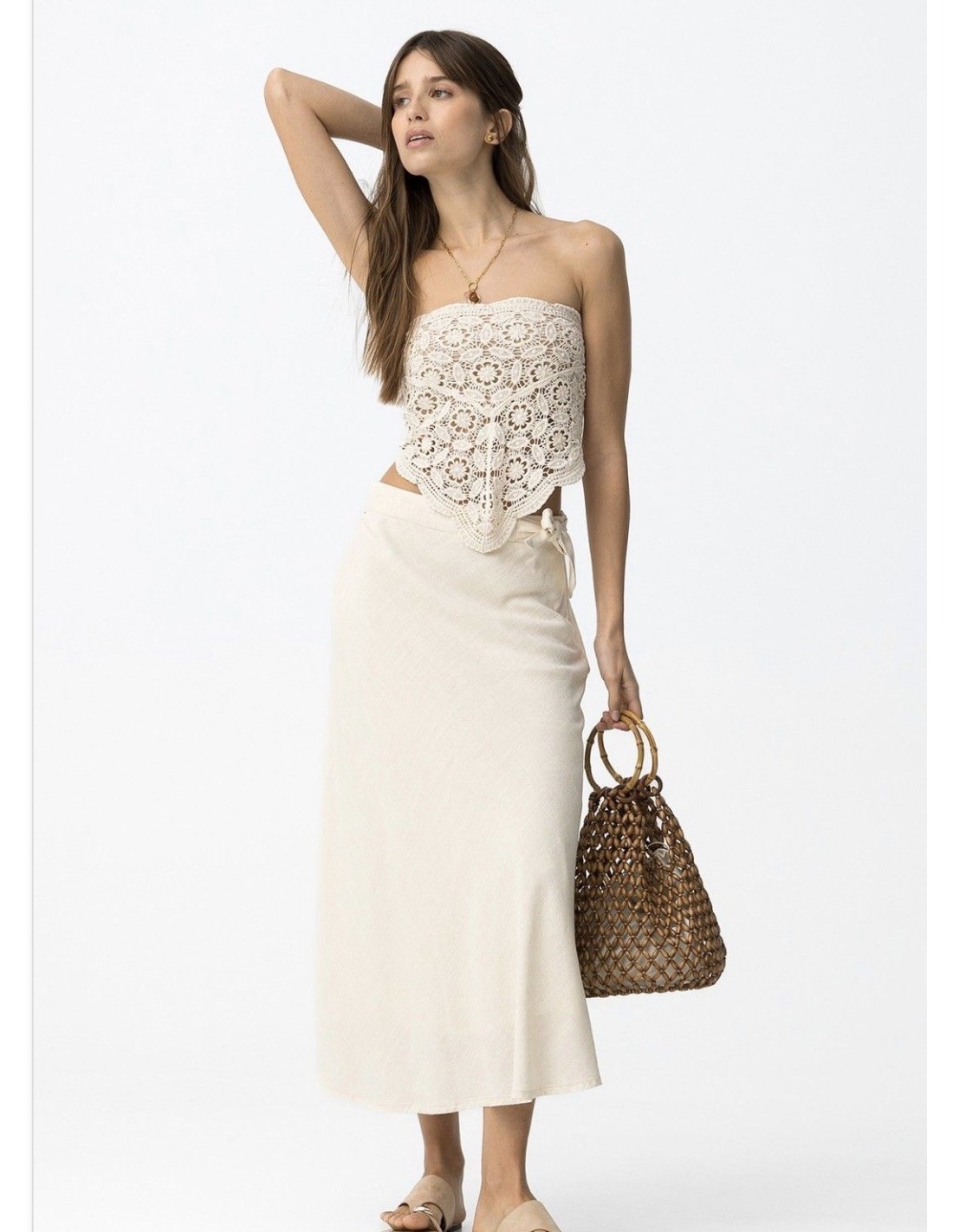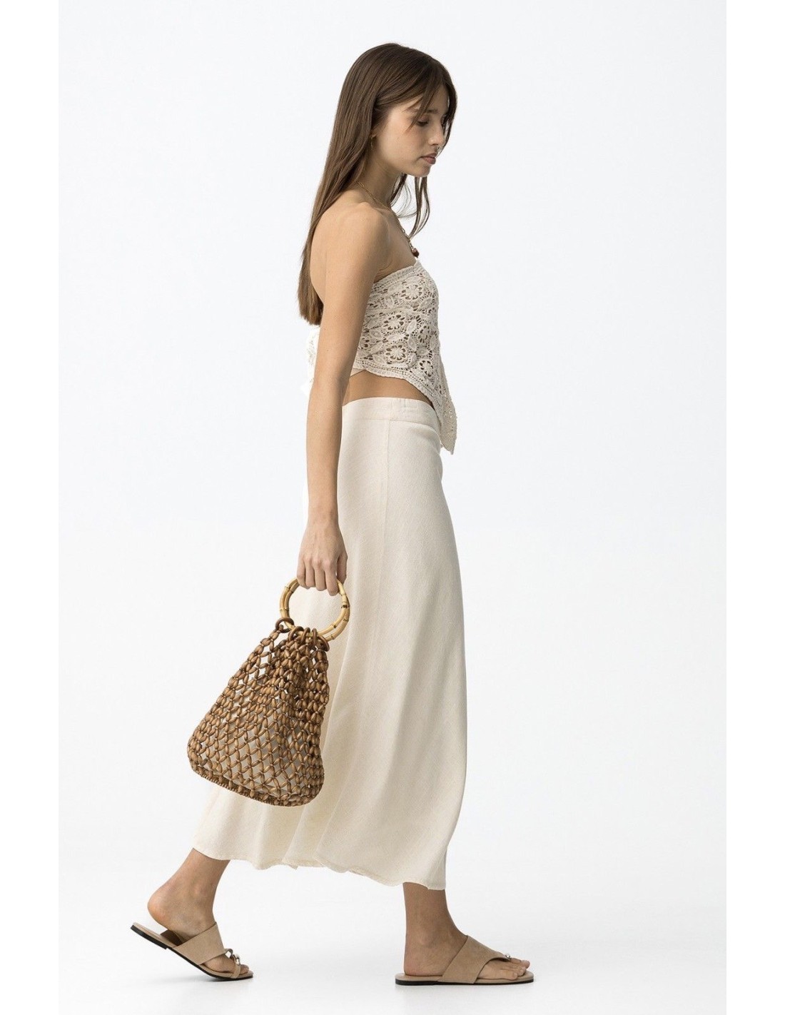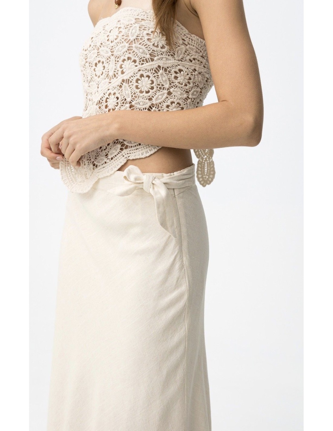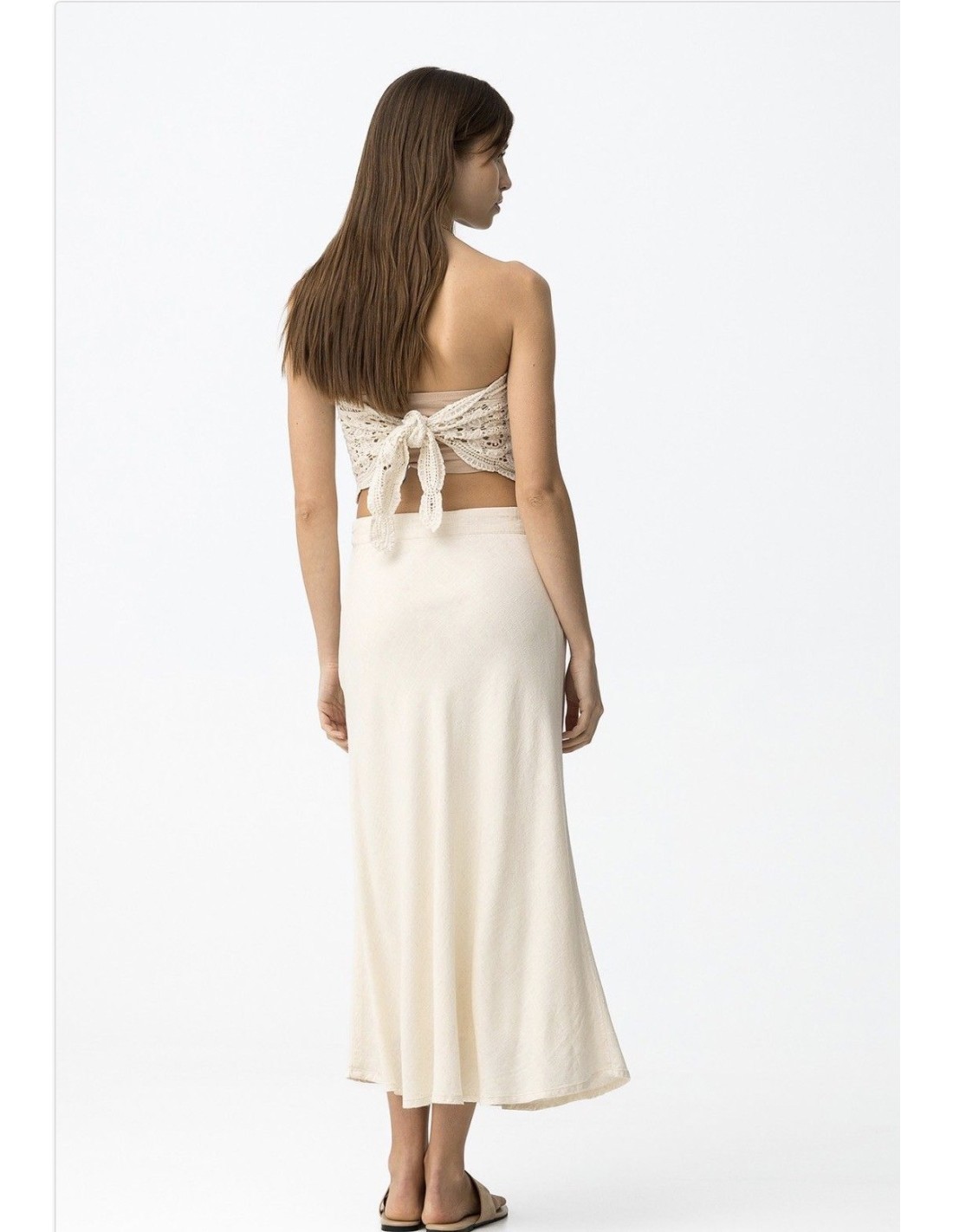 Falda midi de color beige, corte regular, lazo lateral y tejido ligero con rollo minimalista.