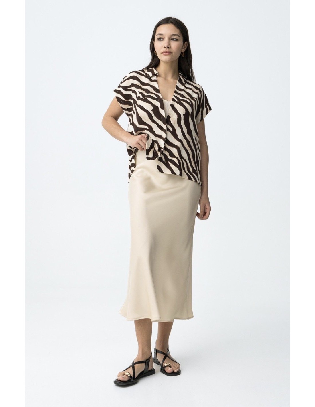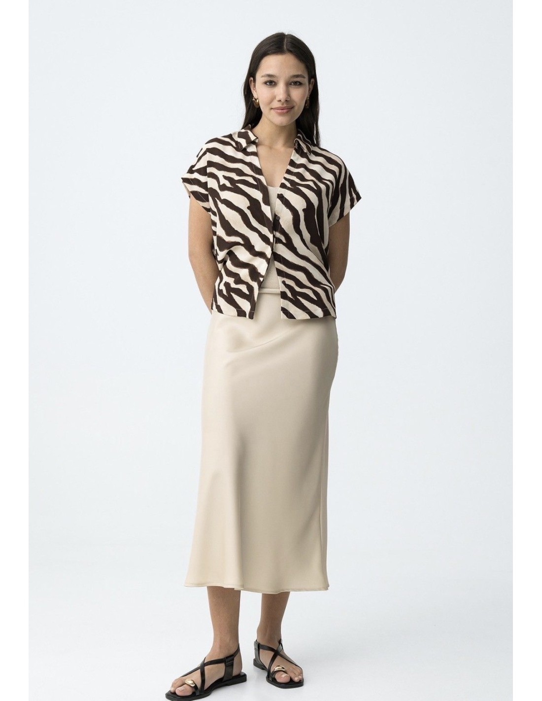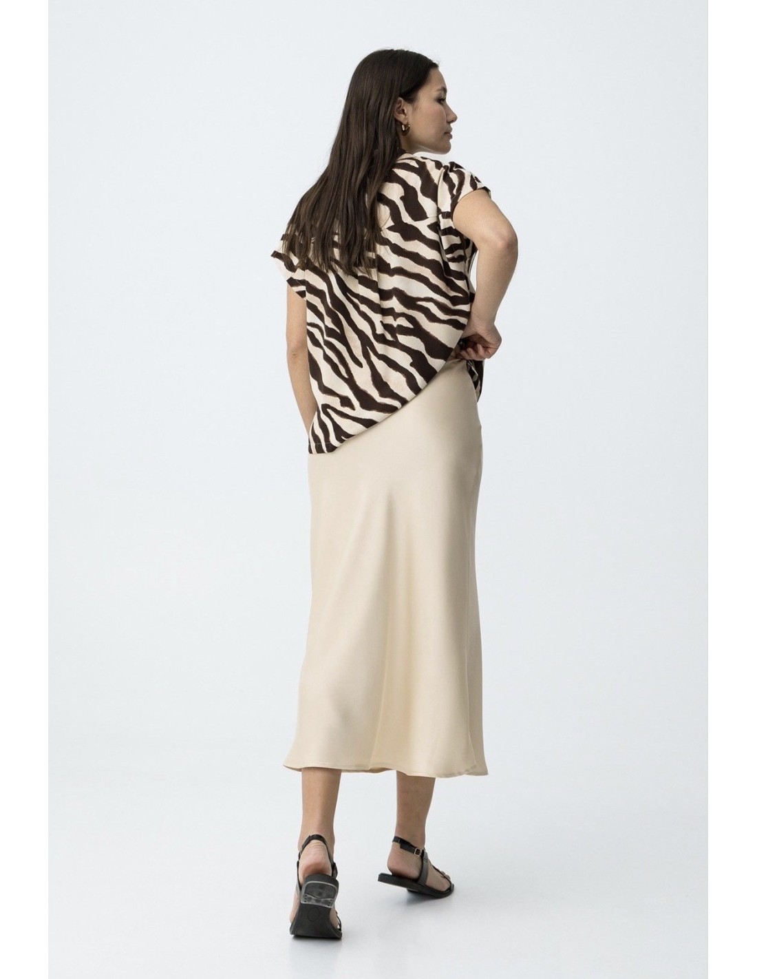 Falda midi en tono beige, corte regular y tejido fluido, perfecta para un estilo sofisticado.