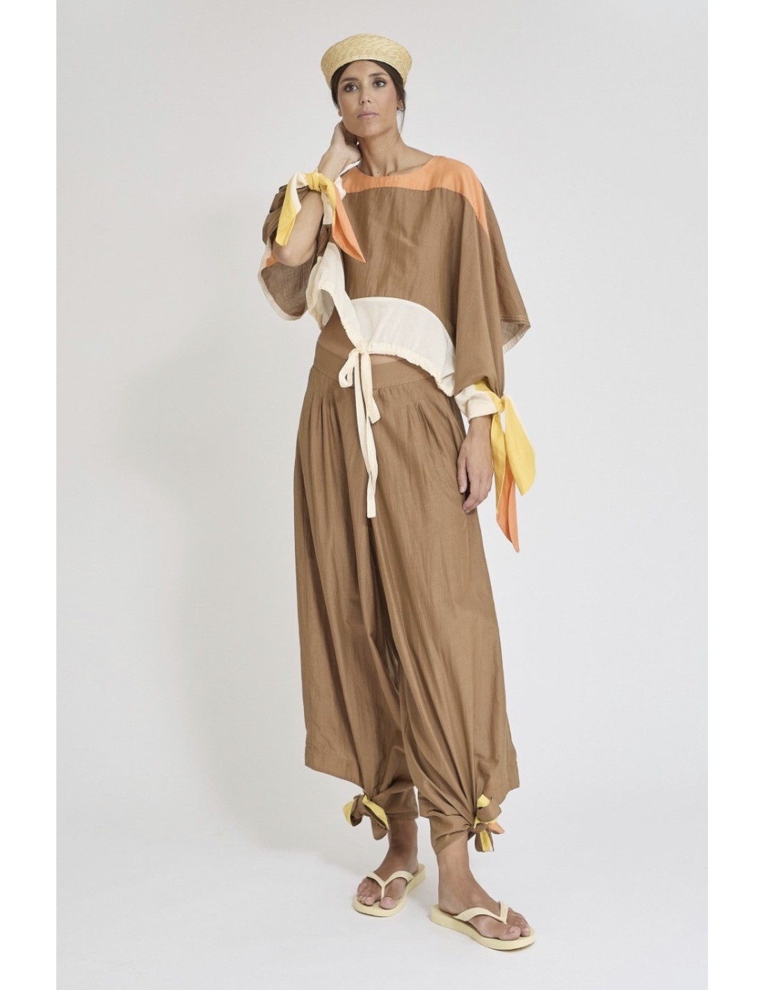 Pantalones baggy confeccionados en una mezcla ligera de seda y algodón, acabados con puños ajustables mediante lazo.