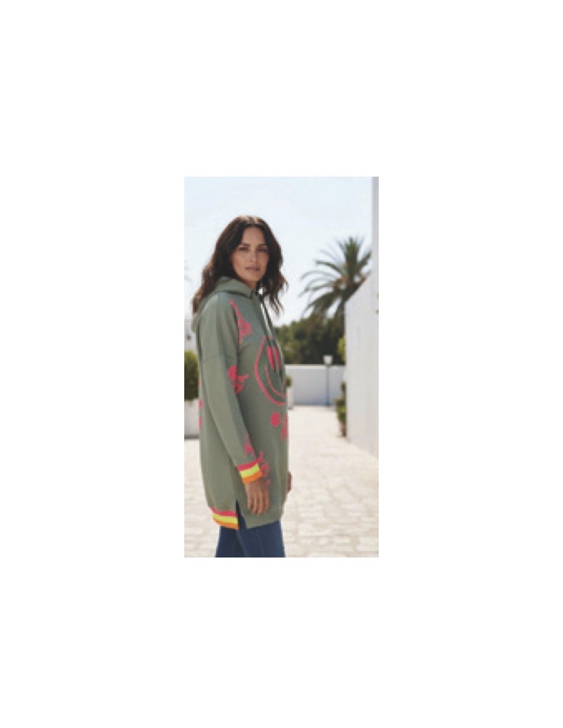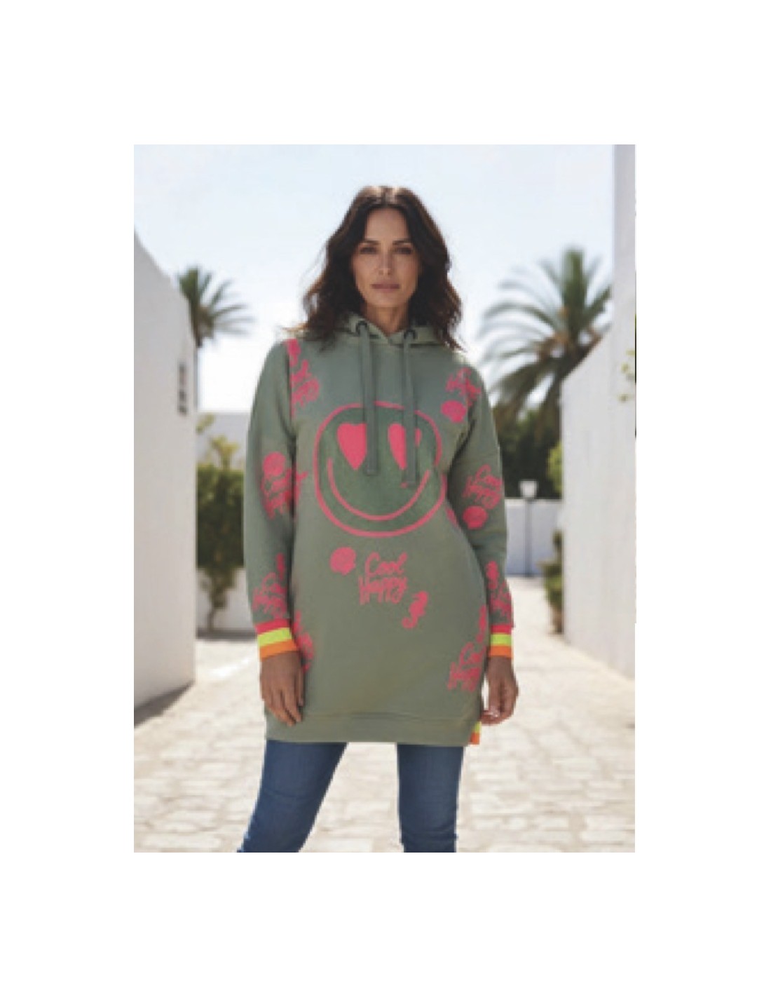Sudadera tipo hoodie de estilo urbano en color verde oliva, con un diseño llamativo de smiley en tonos rosa neón y detalles gráficos distribuidos por toda la prenda.