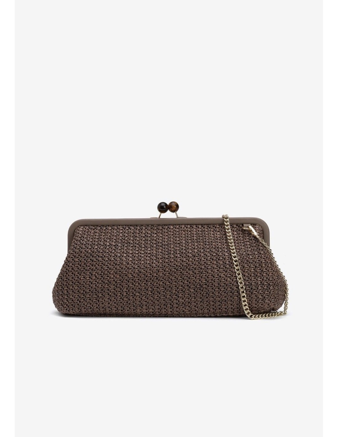 Clutch marrón con textura tricotada, cierre de esferas y cadena dorada desmontable.