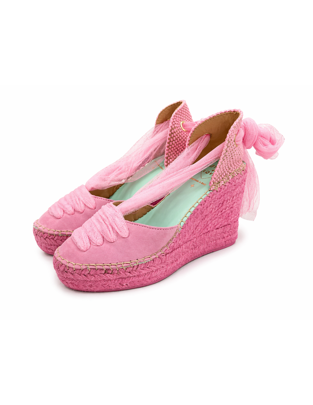 Alpargatas de cuña en color rosa, con altura de 10 cm, confeccionadas en material tipo ante y suela trenzada de yute.