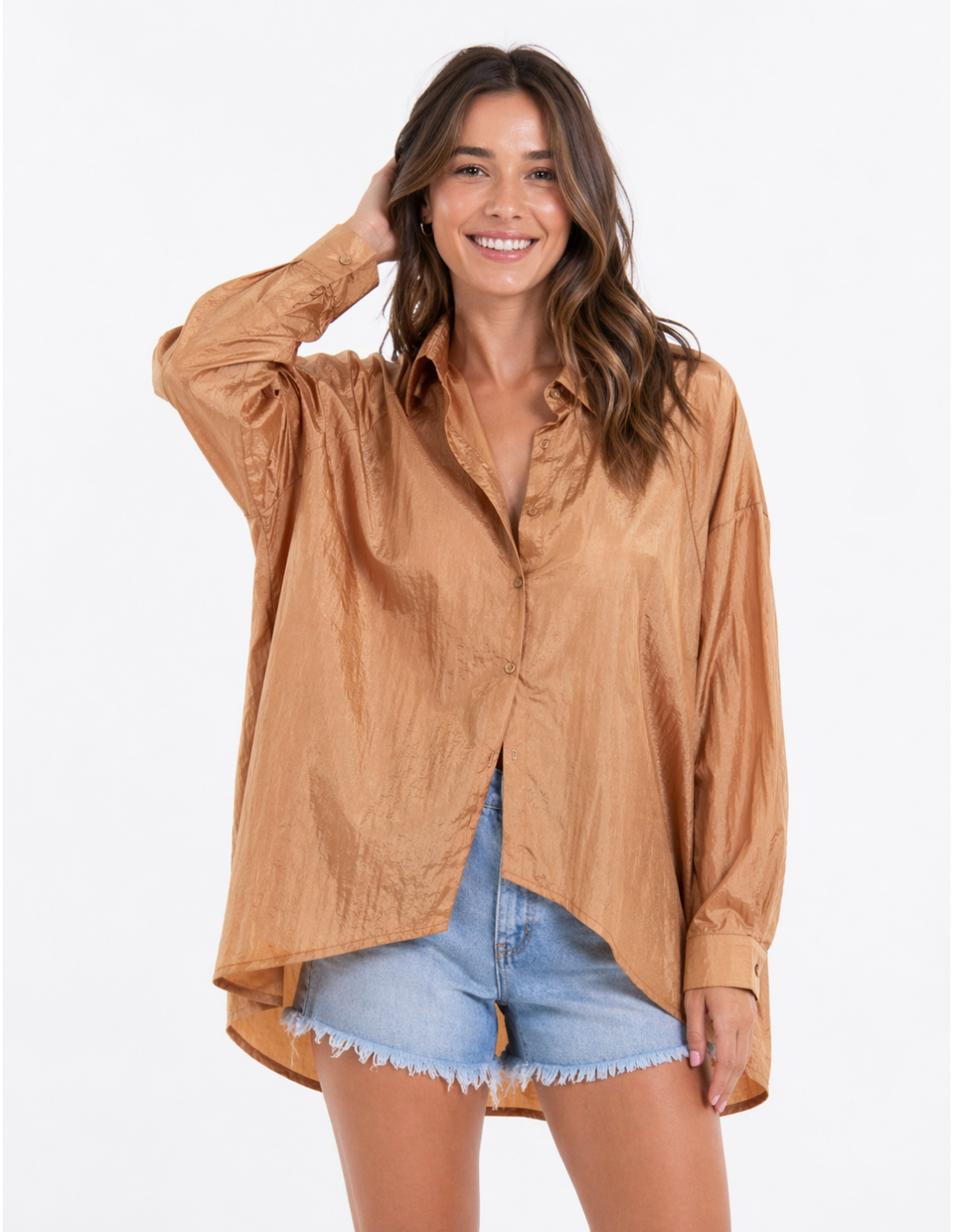 Camisa de estilo relajado con corte oversize y tejido ligero de acabado satinado que aporta un brillo sutil y elegante.
