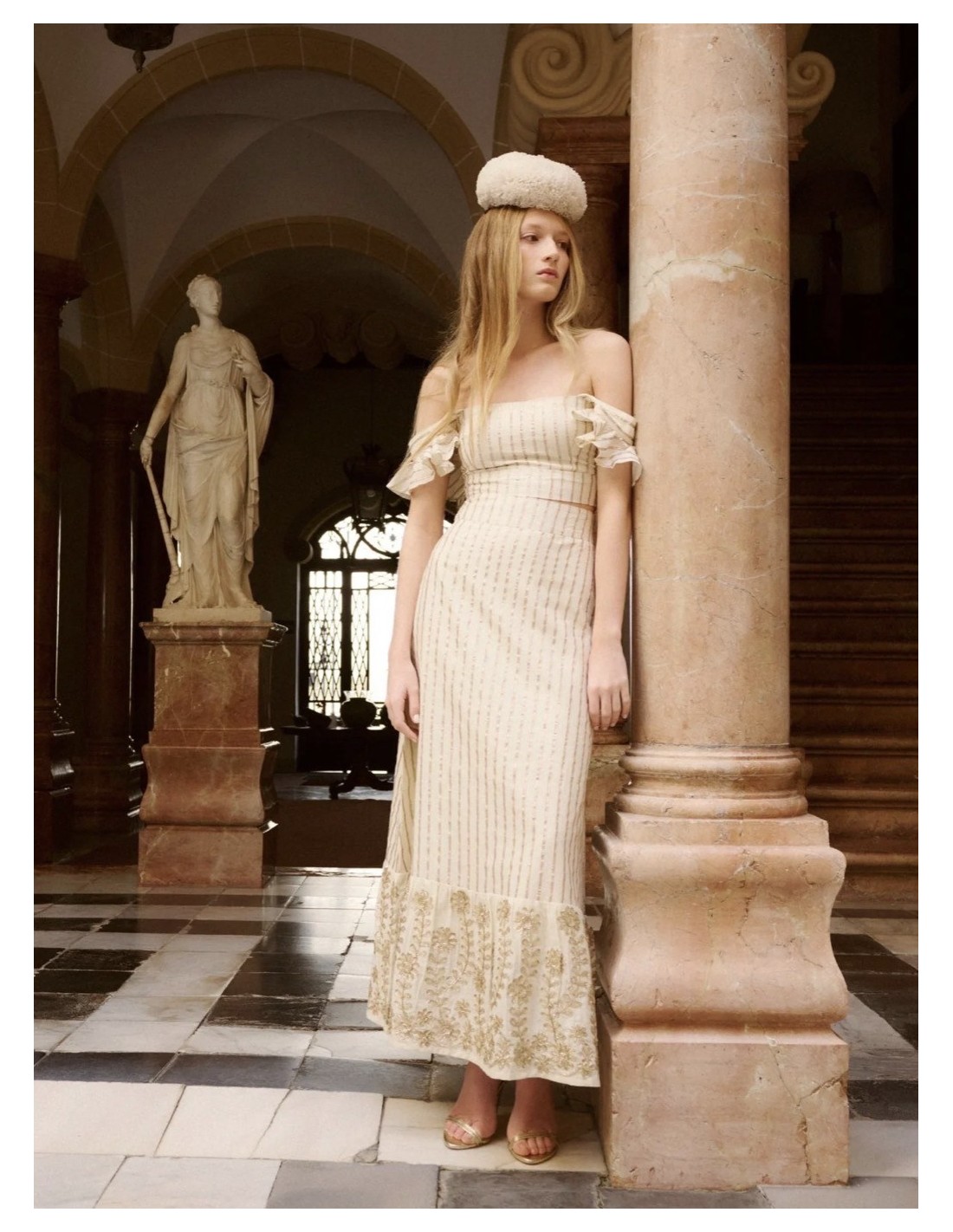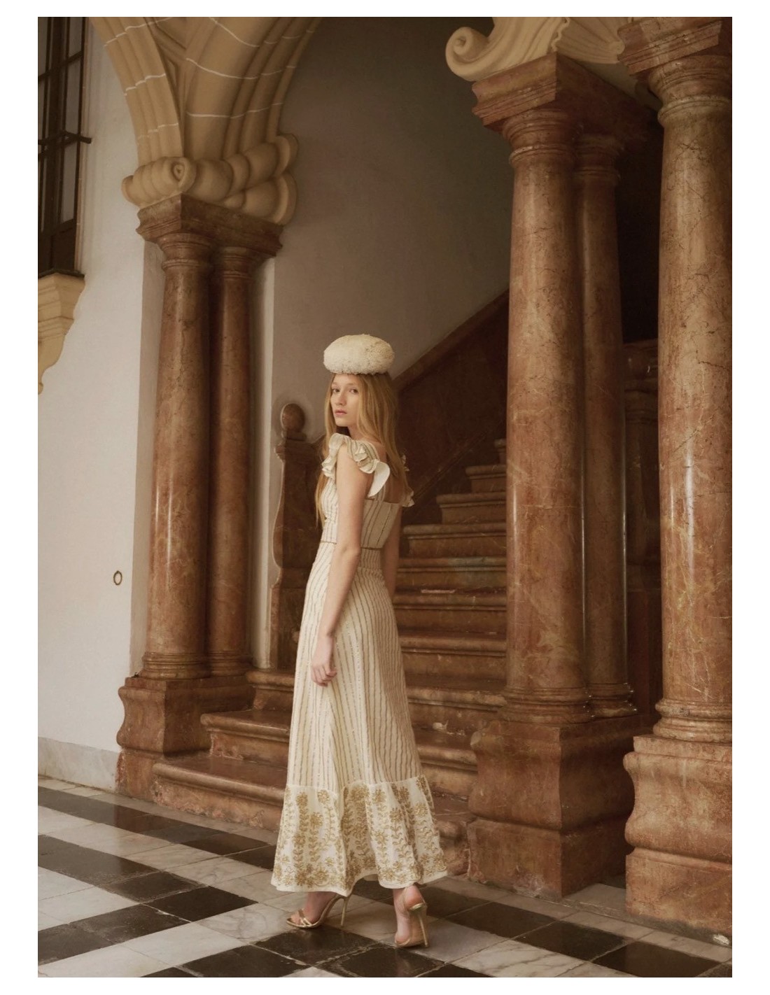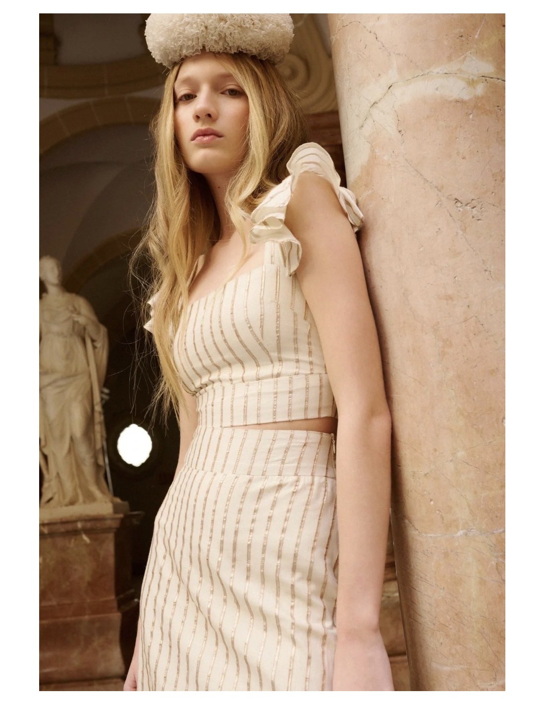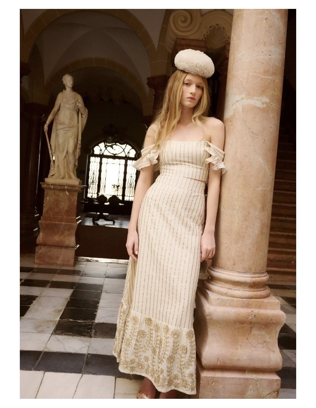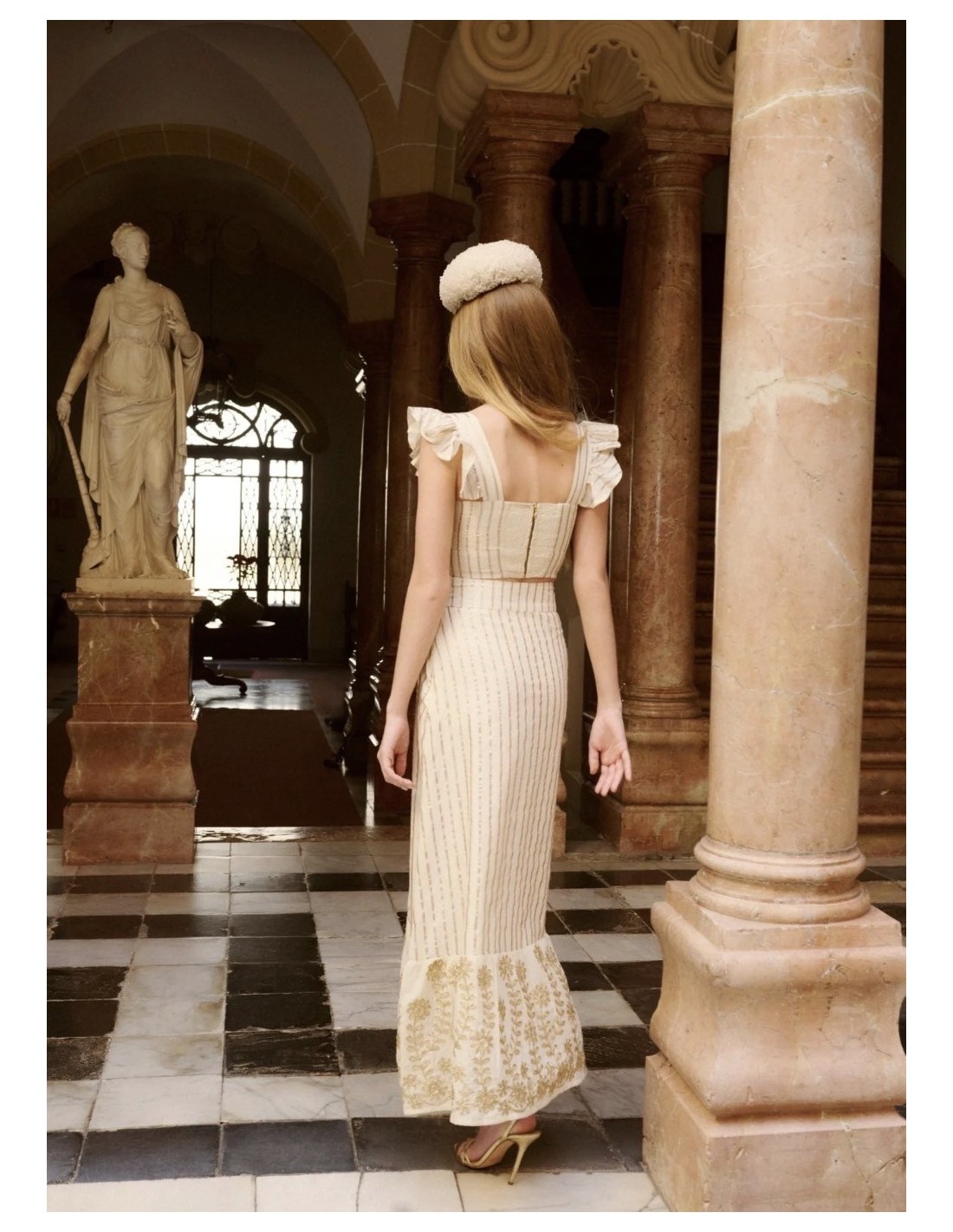 Conjunto en de top y falda en color beige con detalles bordados en color dorado.